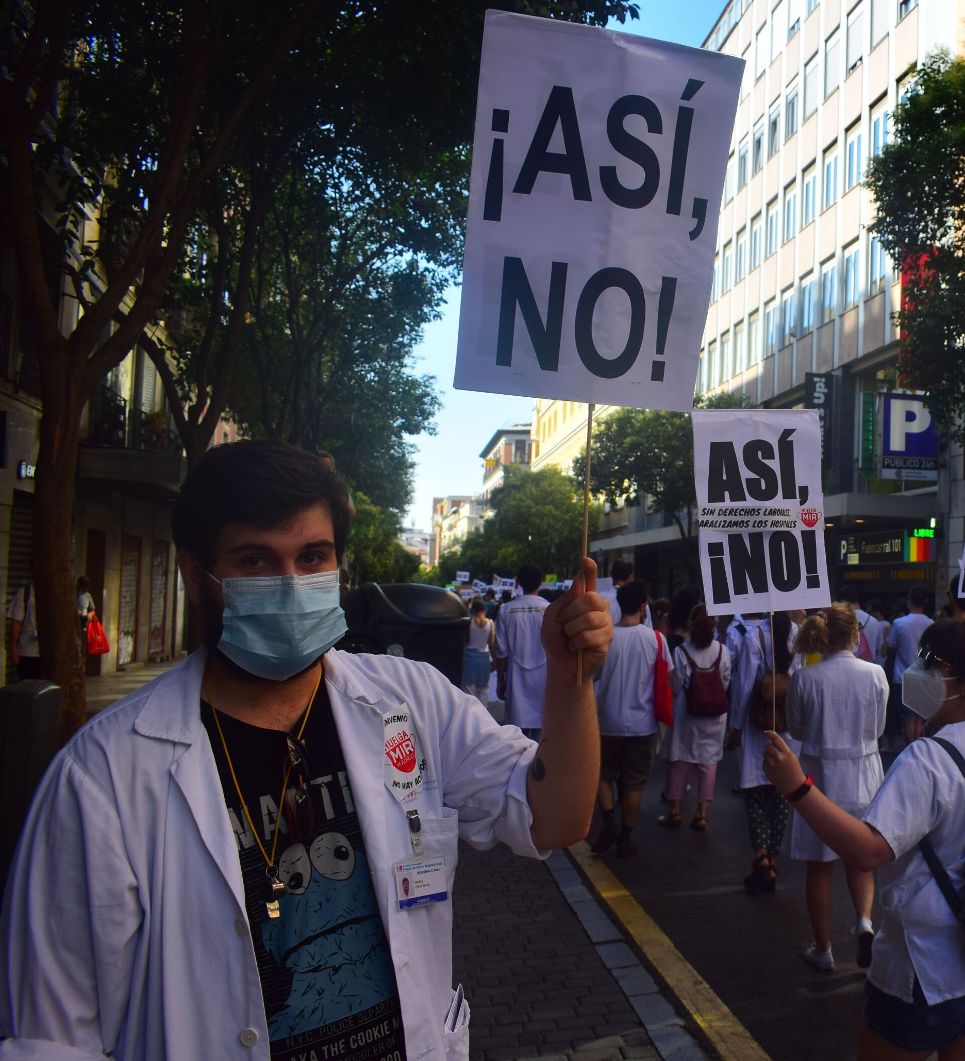 Díez —que se manifiesta con un cartel con el mensaje "¿quieres que te opere sin haber dormido?"— centra su discurso en destacar que un médico cansado no es un médico eficiente, por lo que una mejora de las condiciones revierte en una mejor protección del paciente.