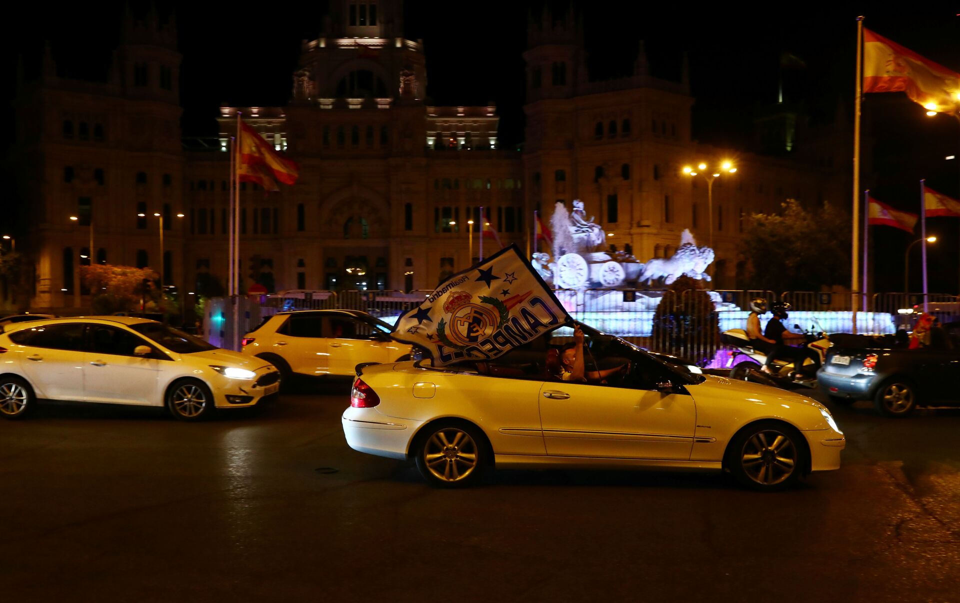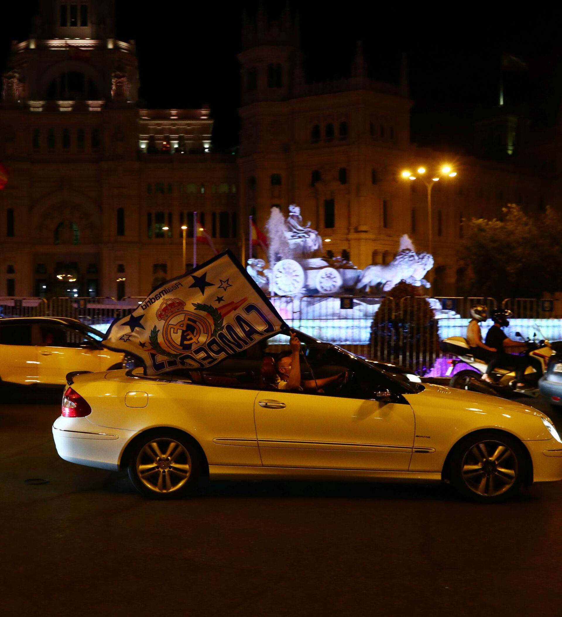 © REUTERS / Sergio PerezFanáticos del Real Madrid celebran la victoria de la 34 Liga en la Cibeles dentro de sus vehículos