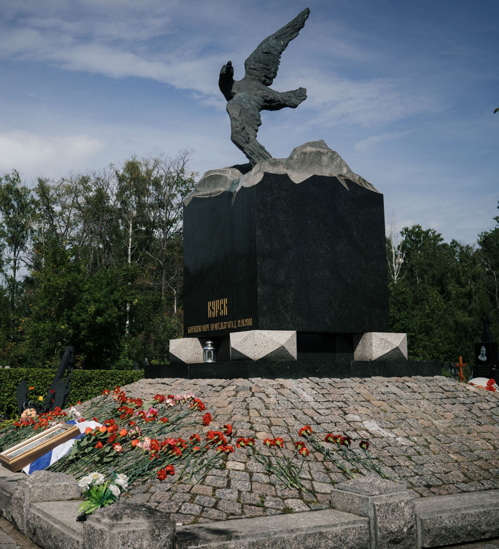 En el tercer aniversario del accidente del Kursk, en el cementerio Serafímovskoye de San Petersburgo, donde están enterrados 32 tripulantes del submarino, se inauguró un monumento a las víctimas de la tragedia.