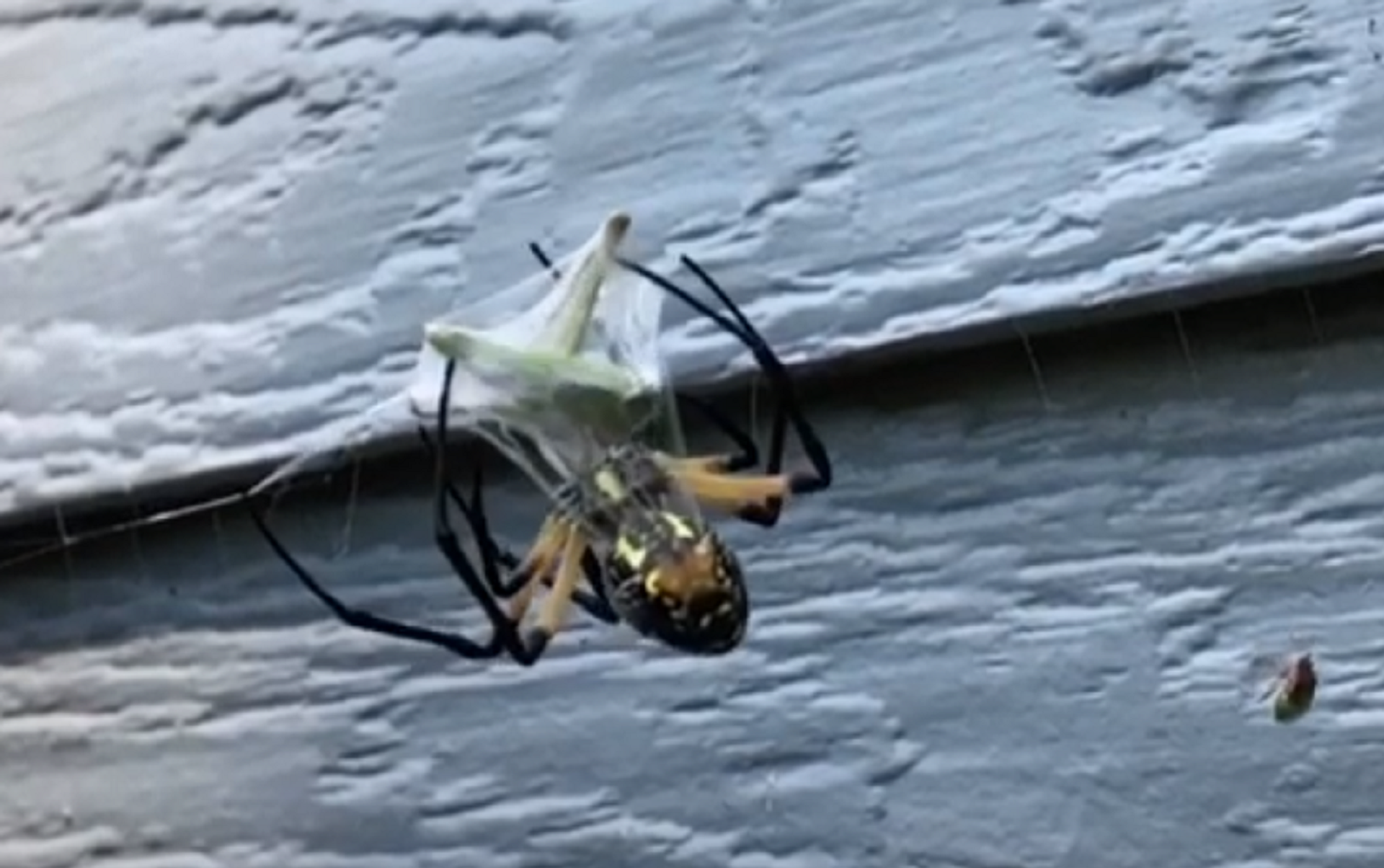"Este colorido araneido ha crecido hasta tener un tamaño enorme, tras darse festines con polillas y saltamontes en nuestro patio trasero. Grabamos un vídeo nada más ver a un saltamontes aterrizar en la tela. ¡Su velocidad y precisión son increíbles!", cita al autor la descripción del vídeo.