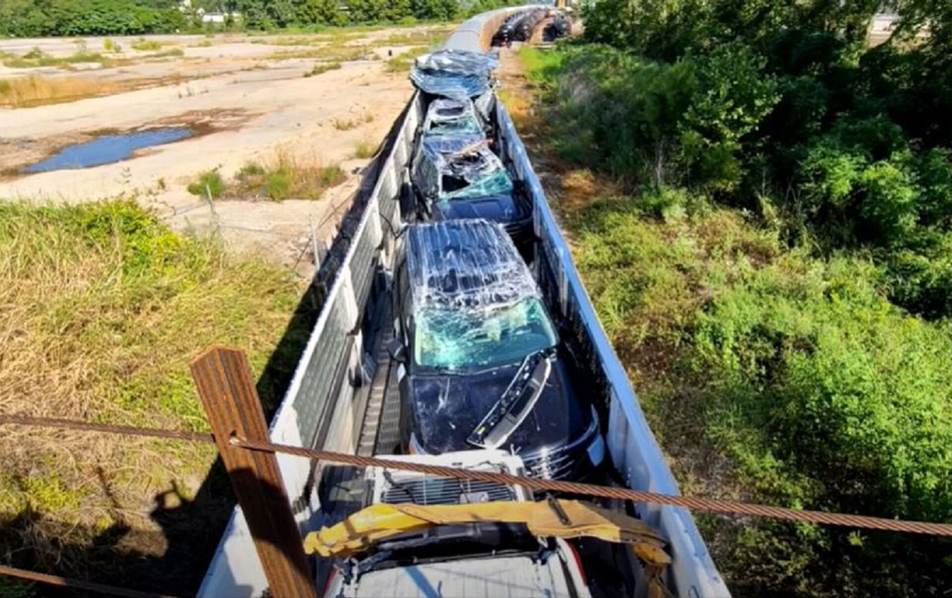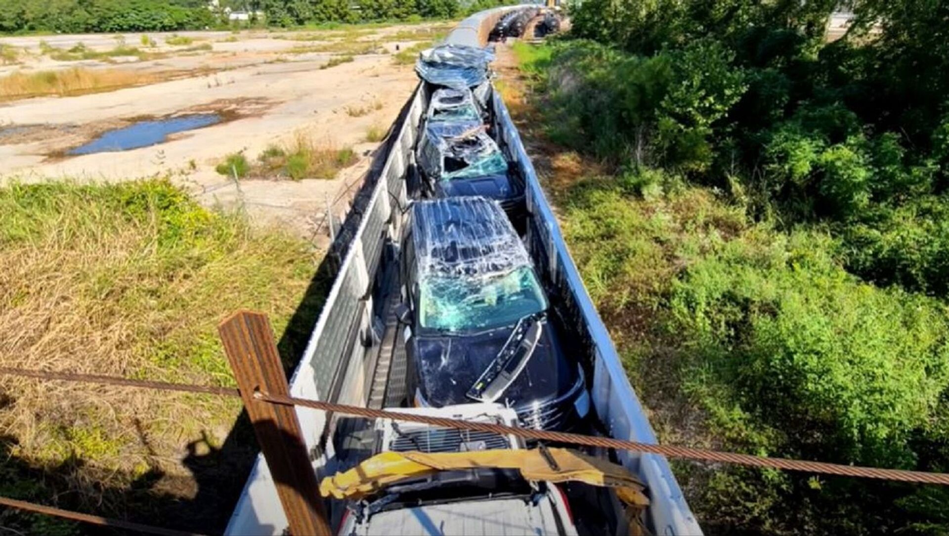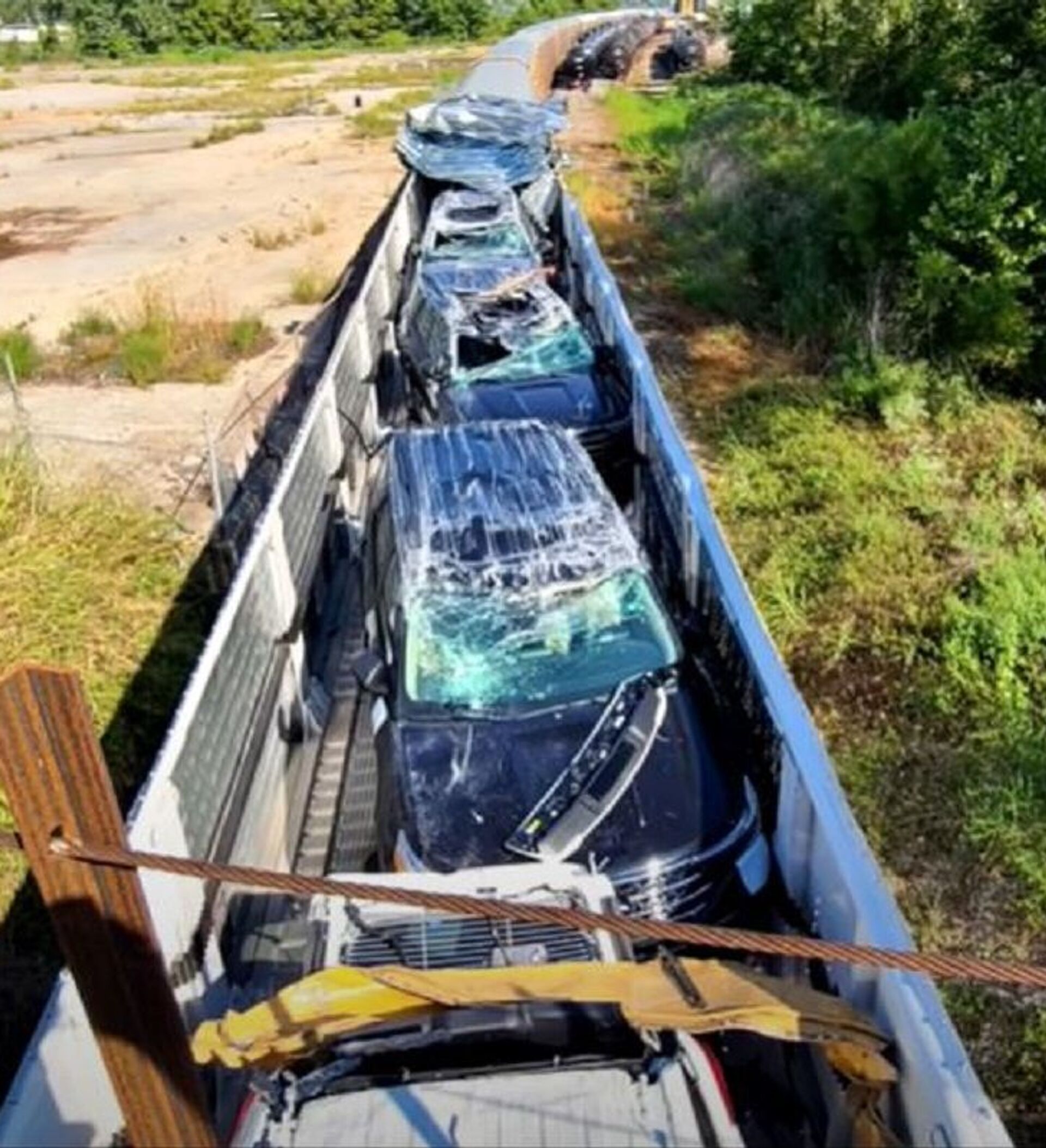 Dentro del tren había una gran cantidad de automóviles como Ford Explorer y Lincoln Nautilus, entre otros modelos y marcas que terminaron hechos añicos tras el choque. Las pérdidas ascienden al menos a dos millones de dólares en daños materiales.