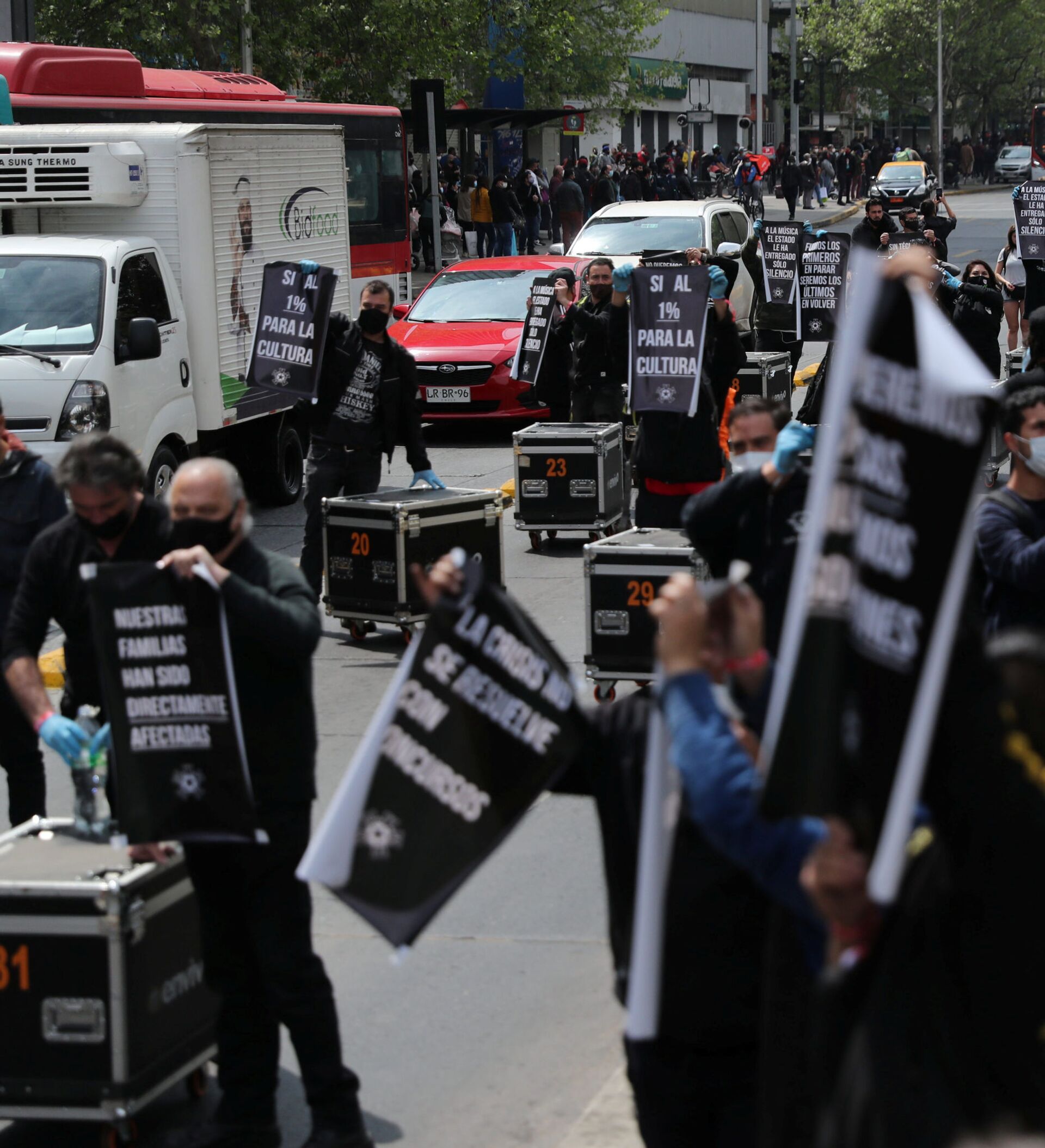Los trabajadores marcharon arrastrando sus cases (cajas donde guardan el equipo técnico) por la calle hasta la sede de Gobierno, el palacio de La Moneda, para entregar una carta a la ministra de Desarrollo Social, Karla Rubilar, explicando su problemática.