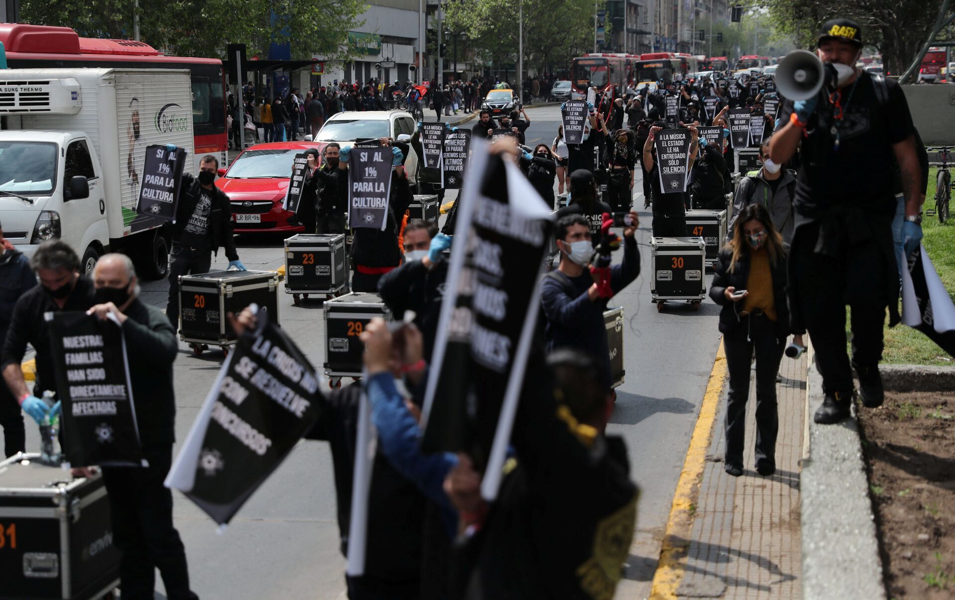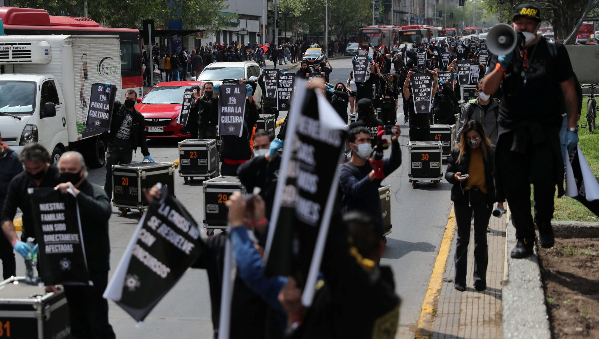 SANTIAGO (Sputnik) — Cientos de trabajadores relacionados al mundo del arte y el espectáculo en Chile marcharon por el centro de Santiago para evidenciar la crisis del rubro debido a la pandemia de COVID-19 y pedir ayuda a las autoridades.