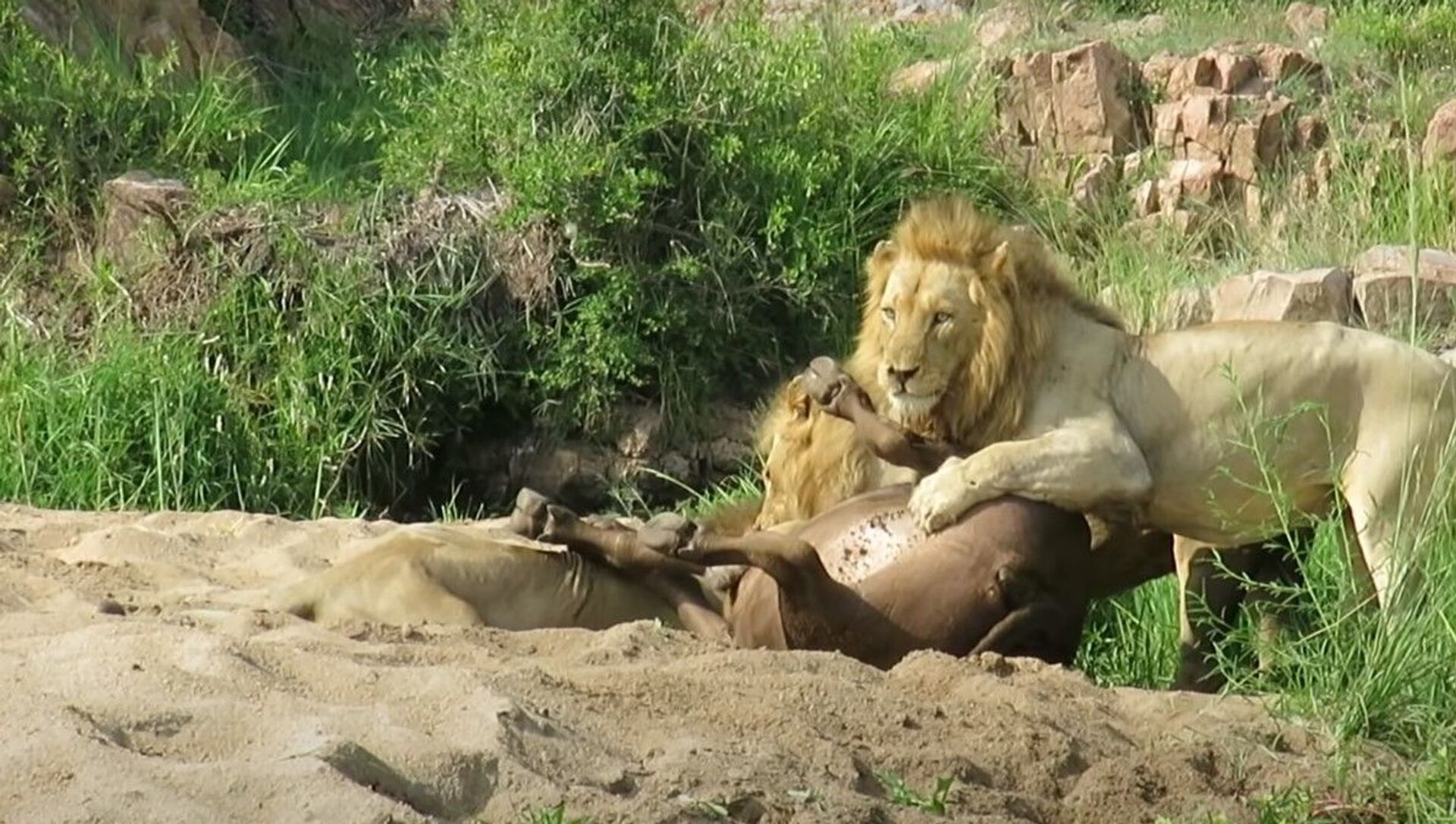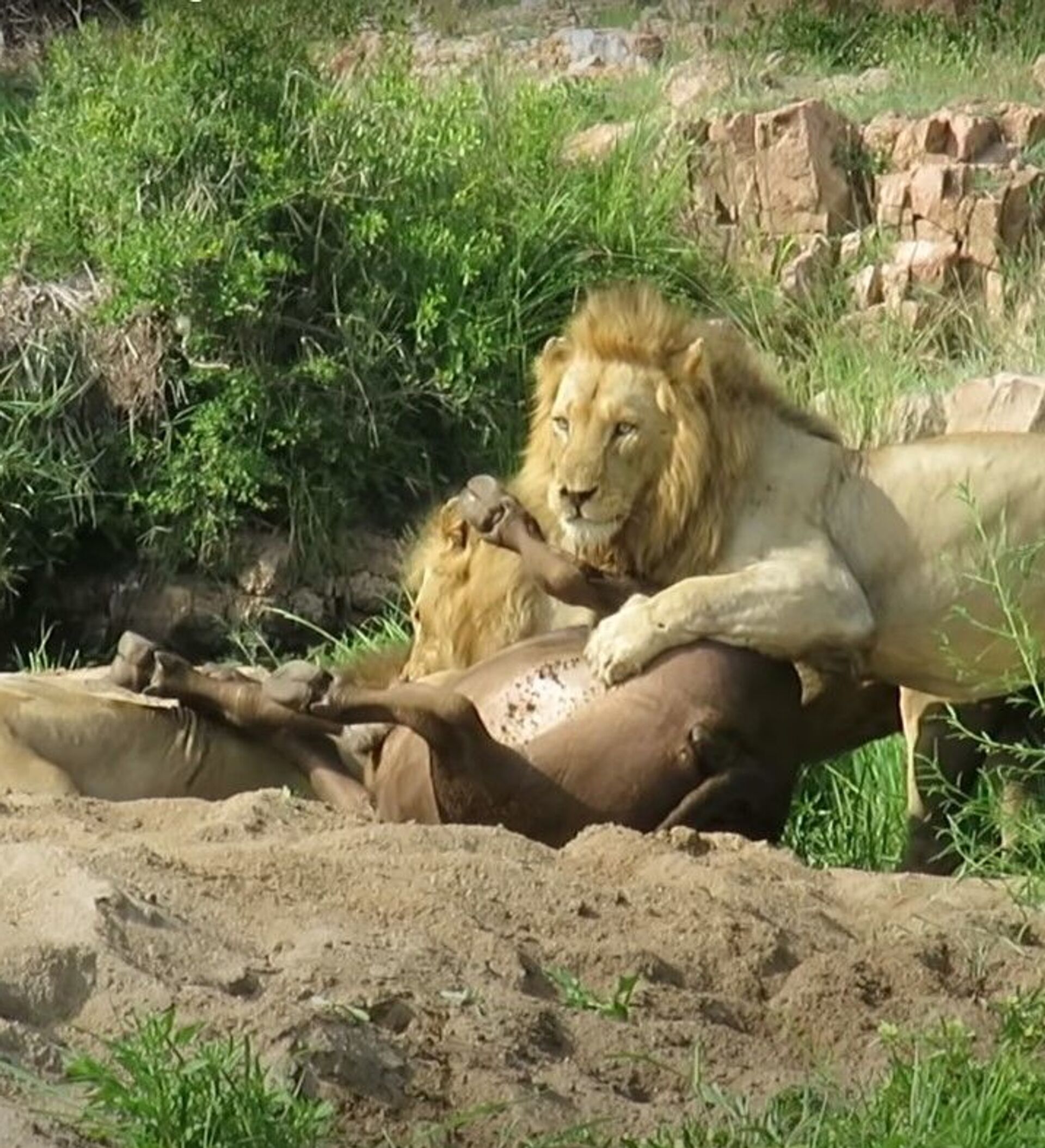 El animal estaba descansando cuando de repente aparecieron tres leones. Solo una vez que el búfalo se levantó para intentar huir y protegerse, los visitantes se dieron cuenta de que tenía una pata delantera fracturada.