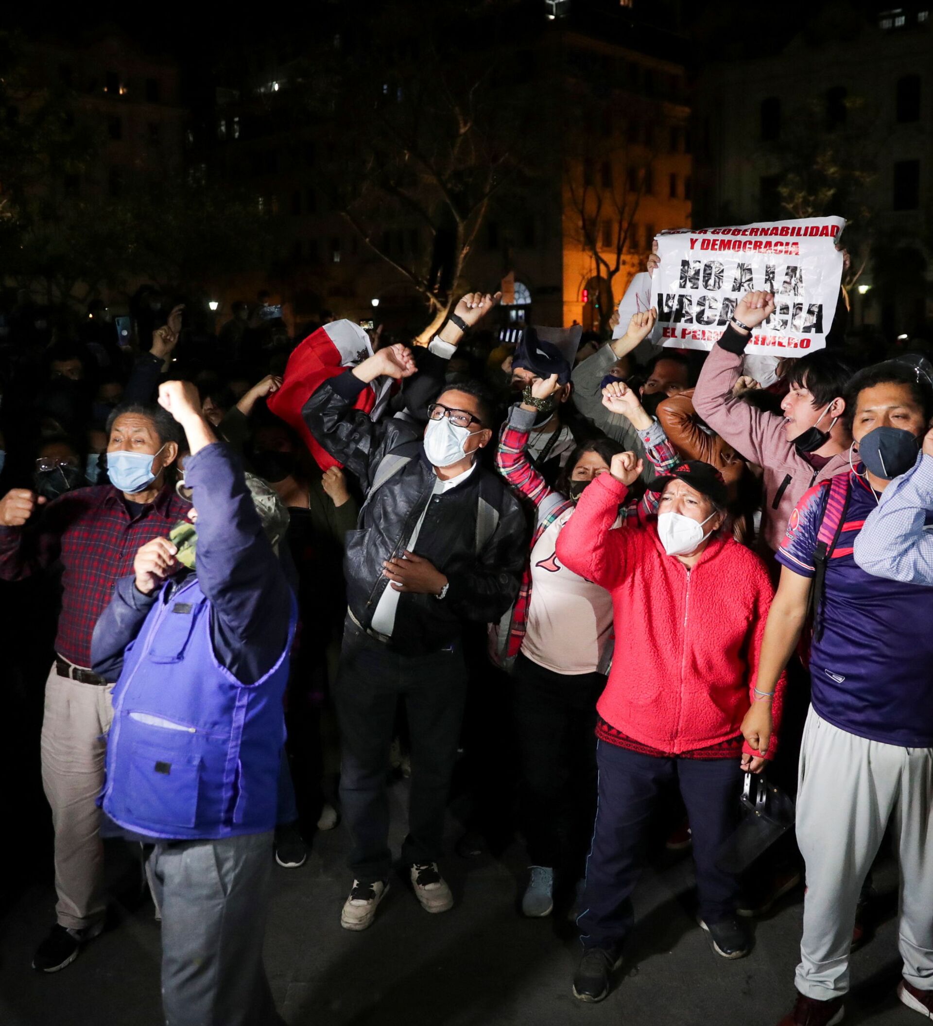 Al grito de "golpe de Estado", "Merino usurpador" y "este Congreso no me representa", los manifestantes tuvieron enfrentamientos con la policía, que los reprimo con chorros de agua y golpes, en un esfuerzo por evitar que llegaran al Parlamento.
