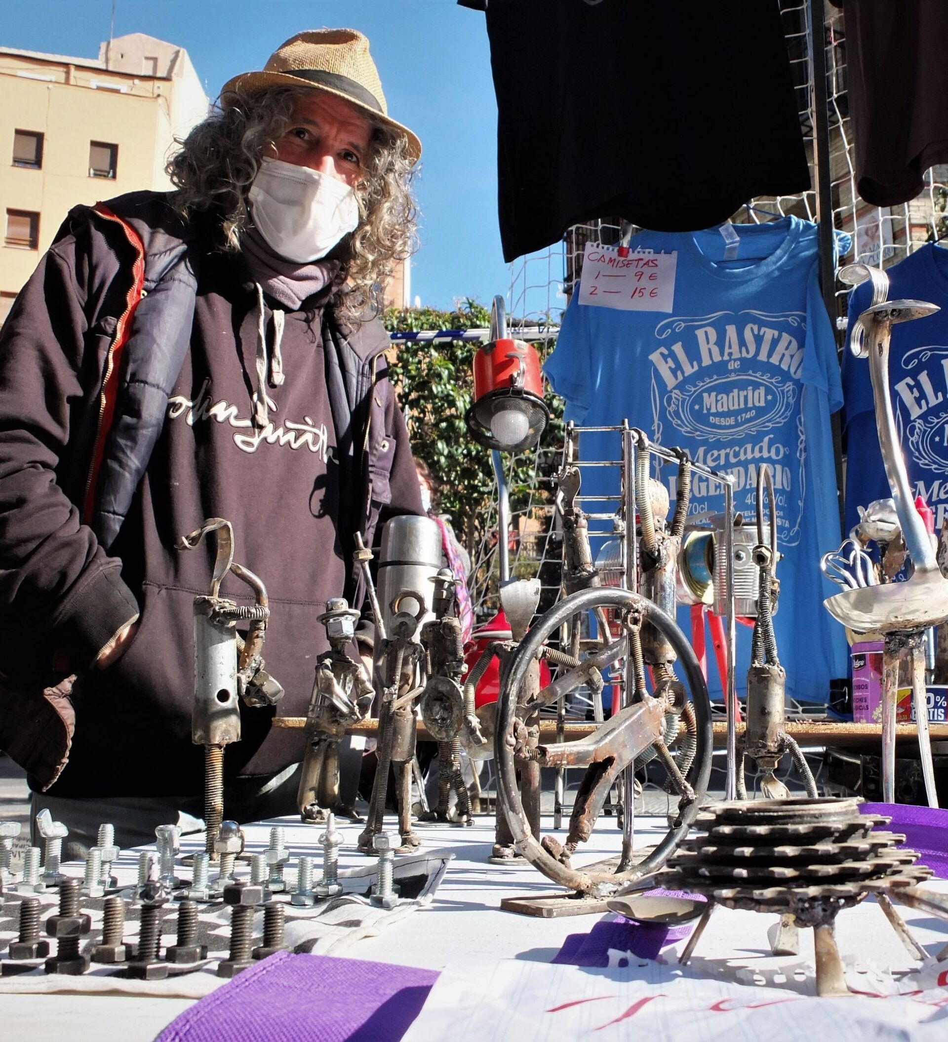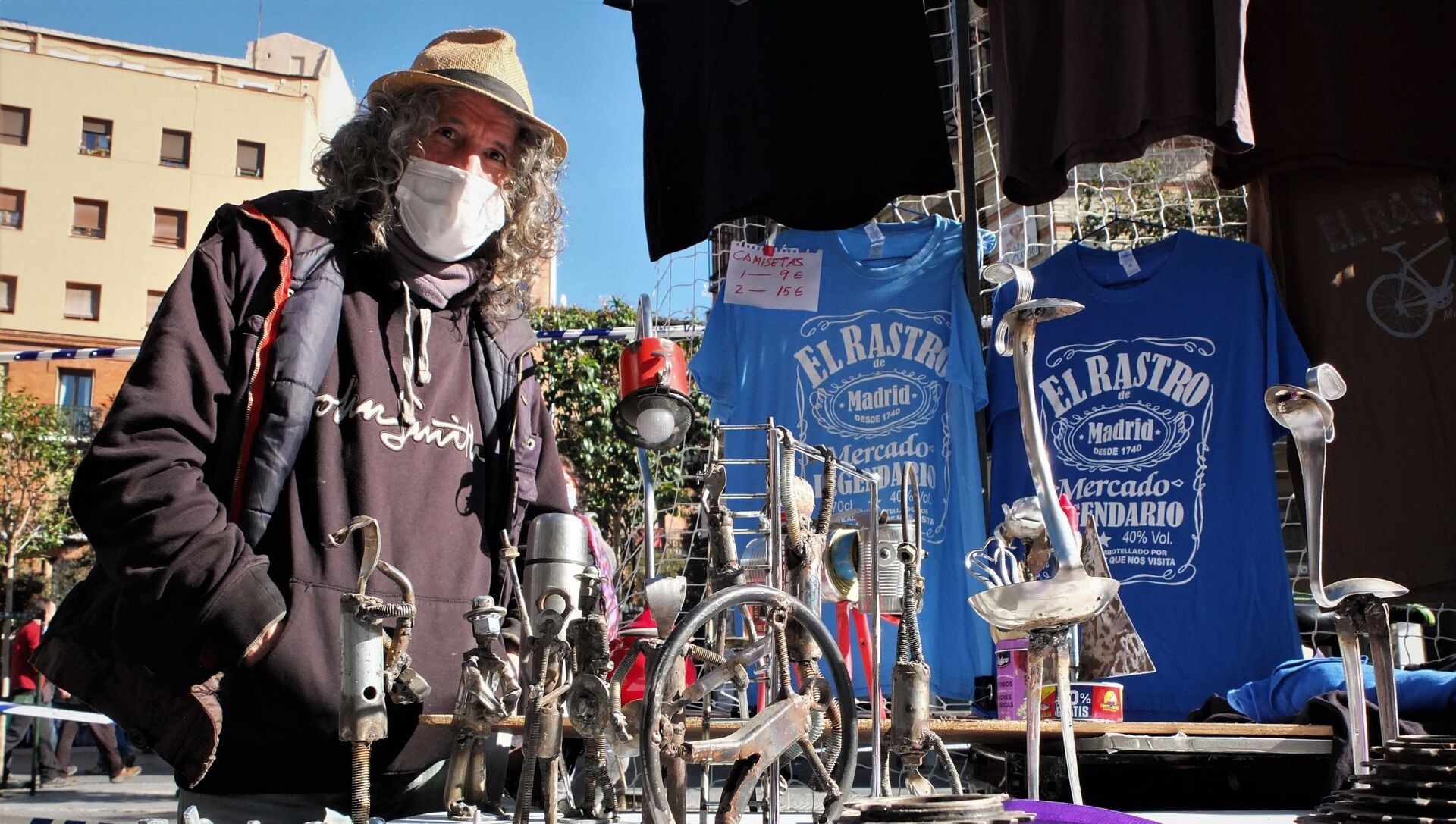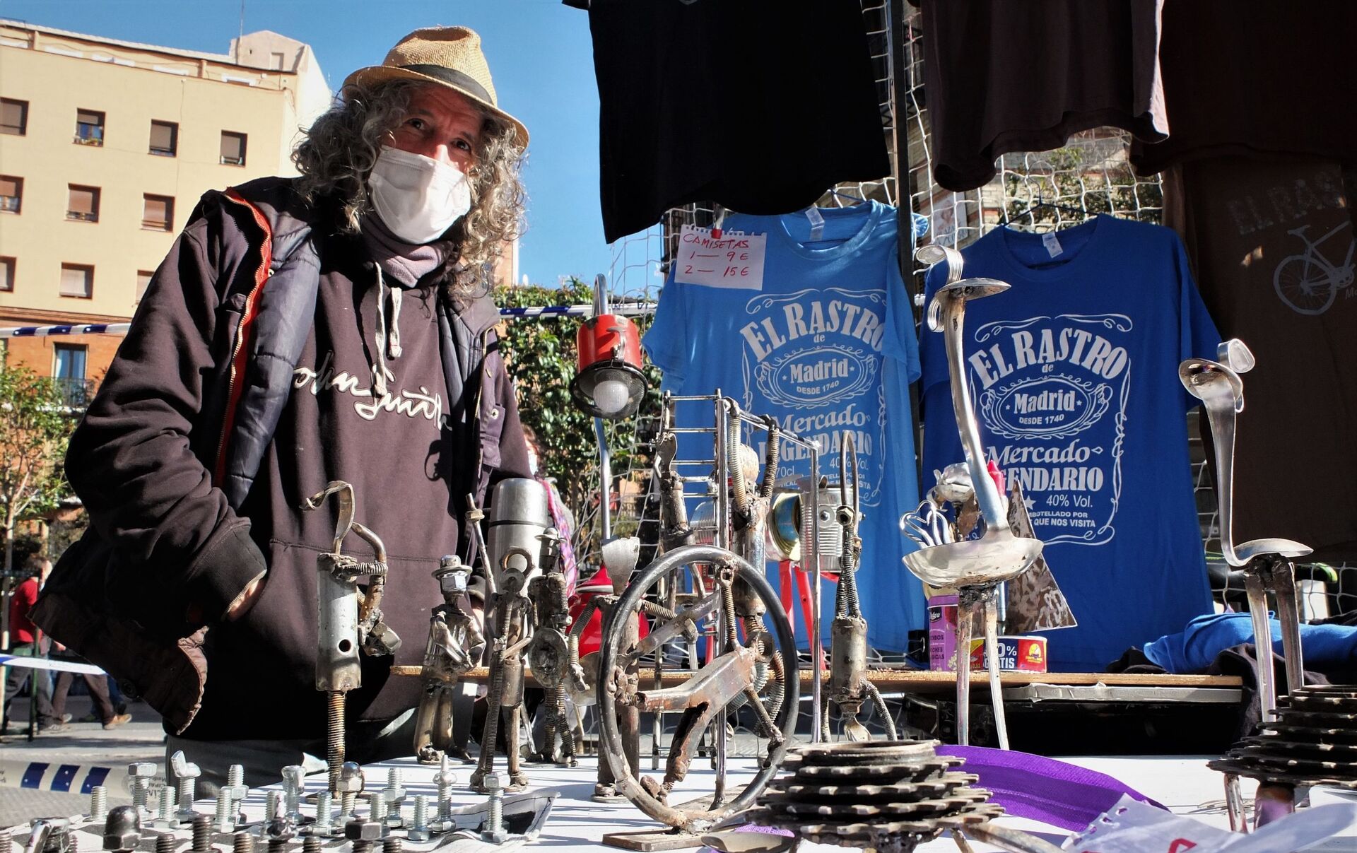 Un poco más allá, Antonio Calle también valoraba el reencuentro. "No sale muy rentable, pero es un aliciente", reflexionaba con un cigarrillo de liar y una mascarilla con la frase: El Rastro, mercadillo legendario de Madrid desde 1740. "La gente no tiene mucho dinero y nos han reducido los puestos, pero ha merecido la pena", añadía a sus 62 años y con más de 35 de experiencia. Su compañero Pedro Recicletas opinaba igual. Con las bicicletas recicladas que le otorgan ese apodo que usa como apellido, expresaba que no esperaba tanta afluencia. "De esto no vivo, pero saco algo", apuntaba quien lleva desde los 17 años ayudando en el mercadillo.