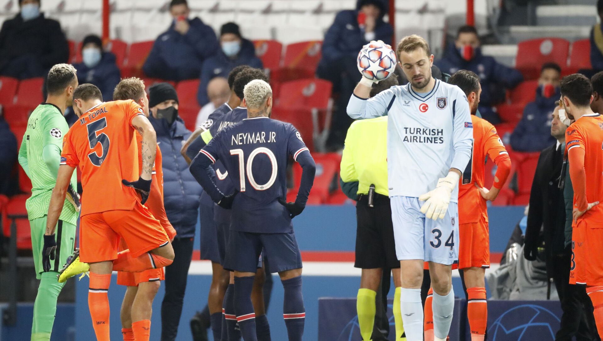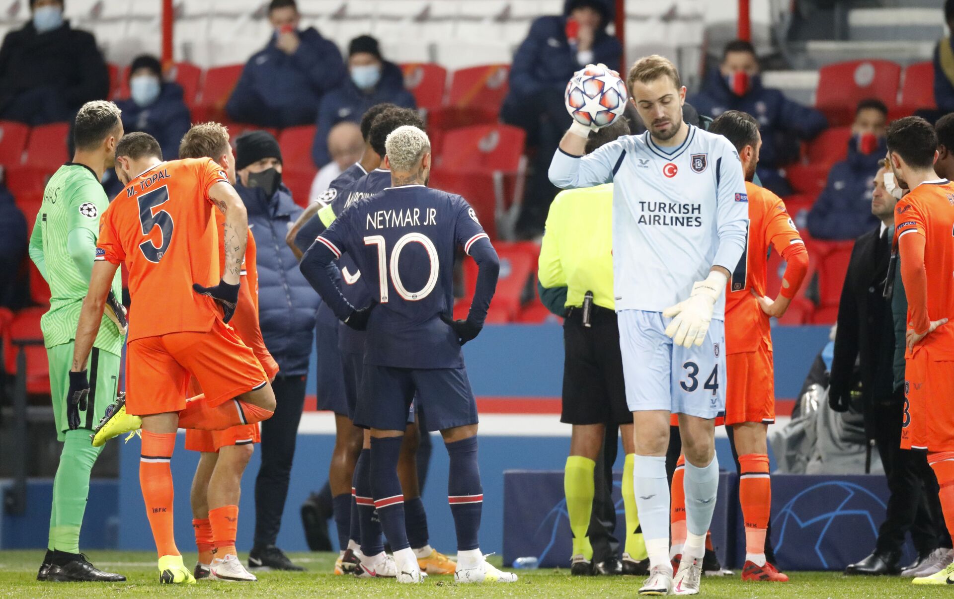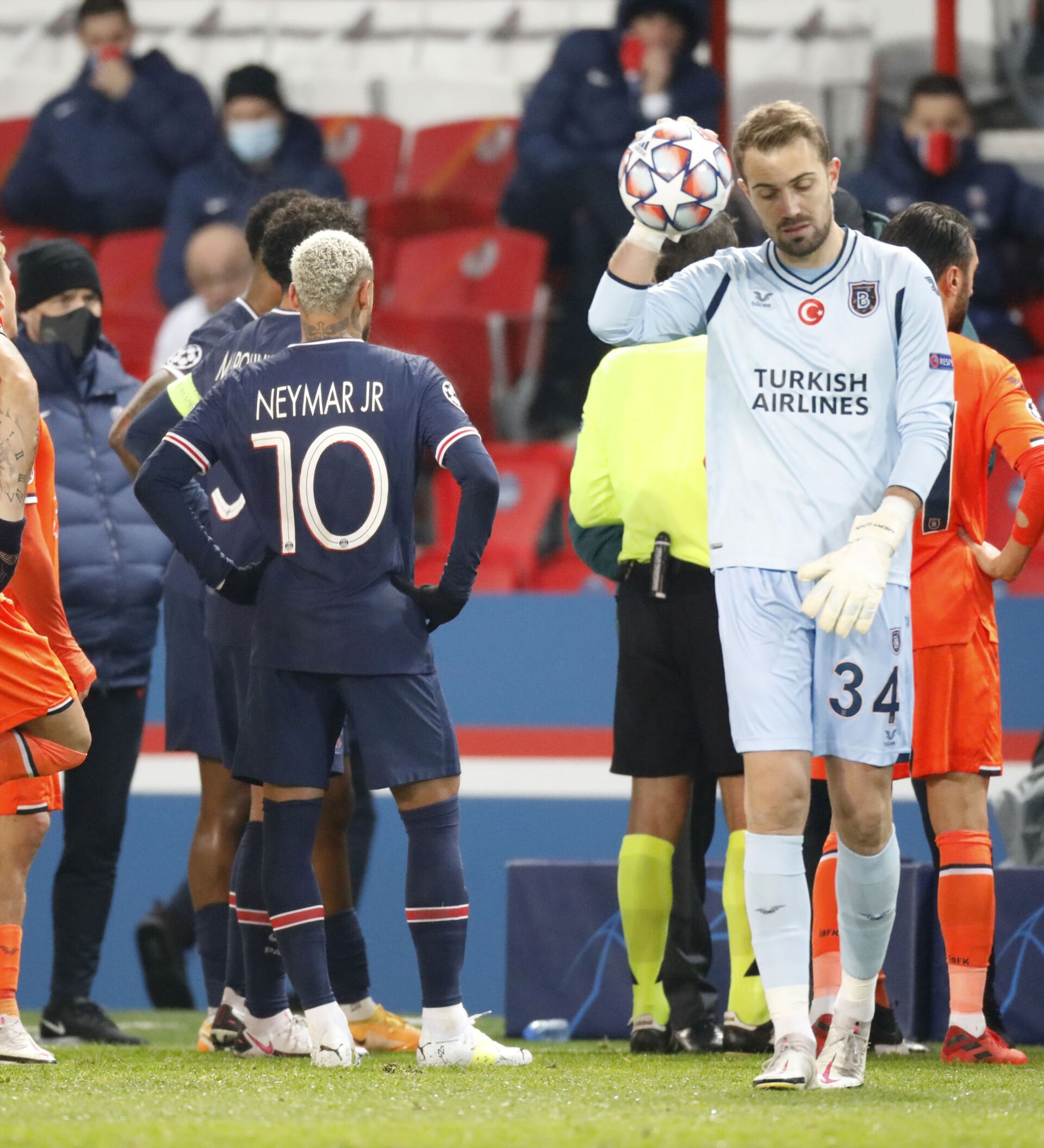 Las protestas del equipo turco apoyaron a los jugadores del PSG. El brasileño Neymar y el francés Mbappé se vieron conversando con el árbitro mayor, diciéndole que si la réplica tuvo lugar, Coltescu tiene que ser suspendido. Neymar rehusó jugar en la cancha mientras trabaja el cuarto árbitro.