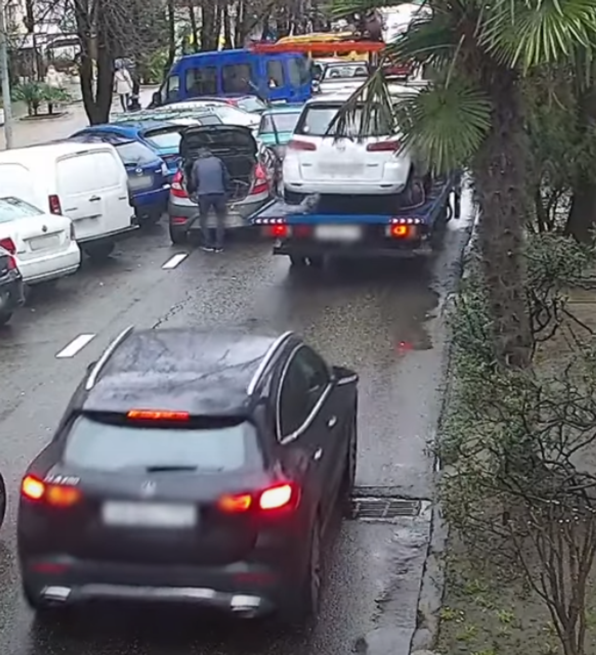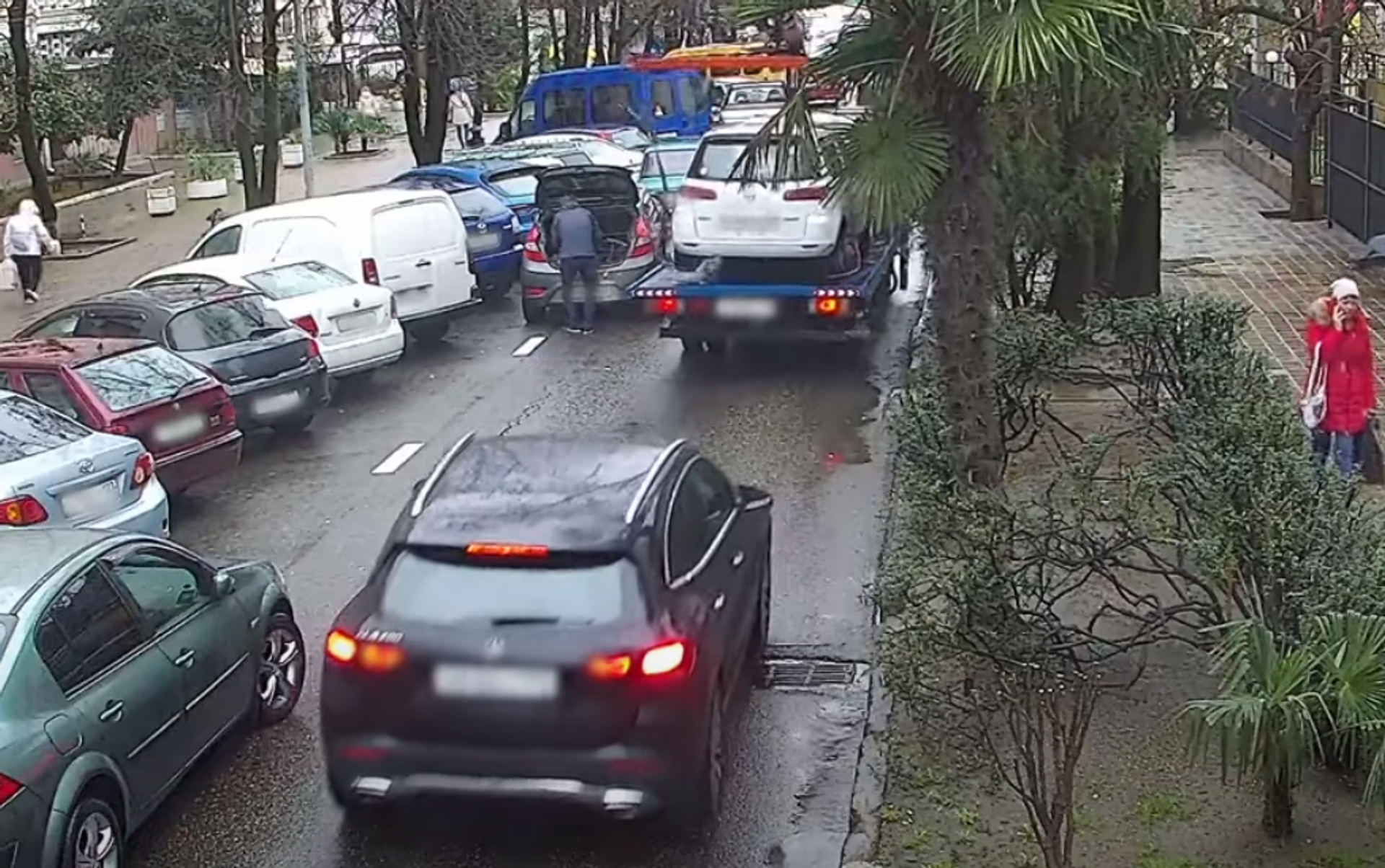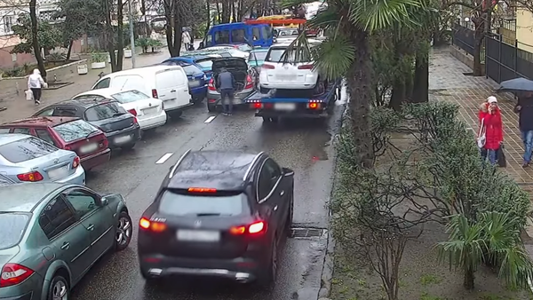 El incidente ocurrió el 12 de enero y fue grabado por las cámaras de vigilancia de una tienda cercana.En la grabación se puede observar a un vehículo que transporta un auto. Parece que el conductor de la grúa no calculó bien su maniobra y golpeó con la pluma contra el tronco de un árbol al lado de la carretera. Como resultado, el automóvil transportado giró bruscamente hacia la izquierda y golpeó otro auto estacionado en una fila paralela. El dueño del automóvil estacionado se encontraba abriendo el maletero en el momento del incidente, pero logró saltar hacia atrás en el último segundo. El maletero, a su vez, se cerró tras el impacto y su tapa podría haber dañado las manos del hombre, pero afortunadamente nadie resultó herido en el accidente.
