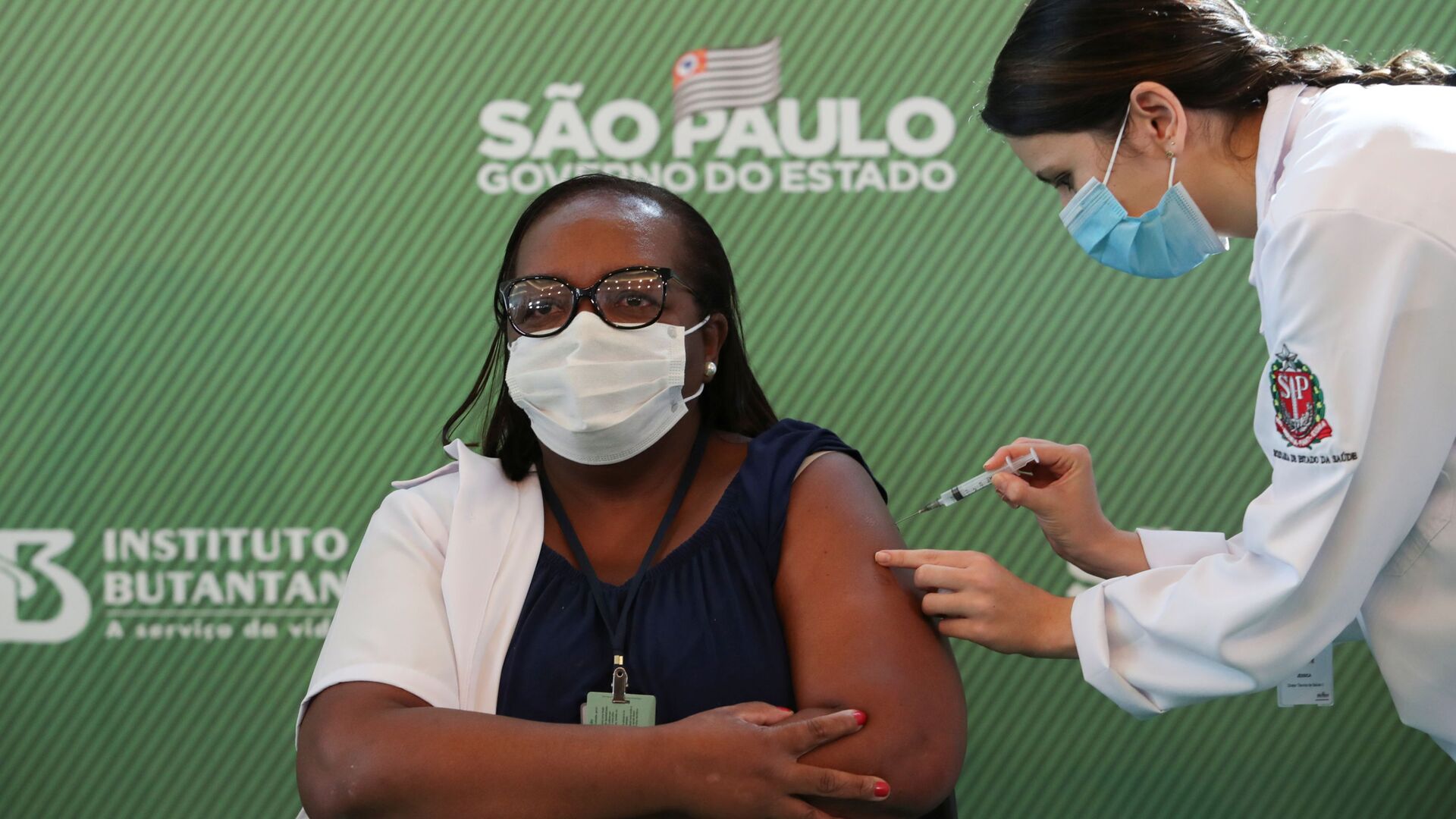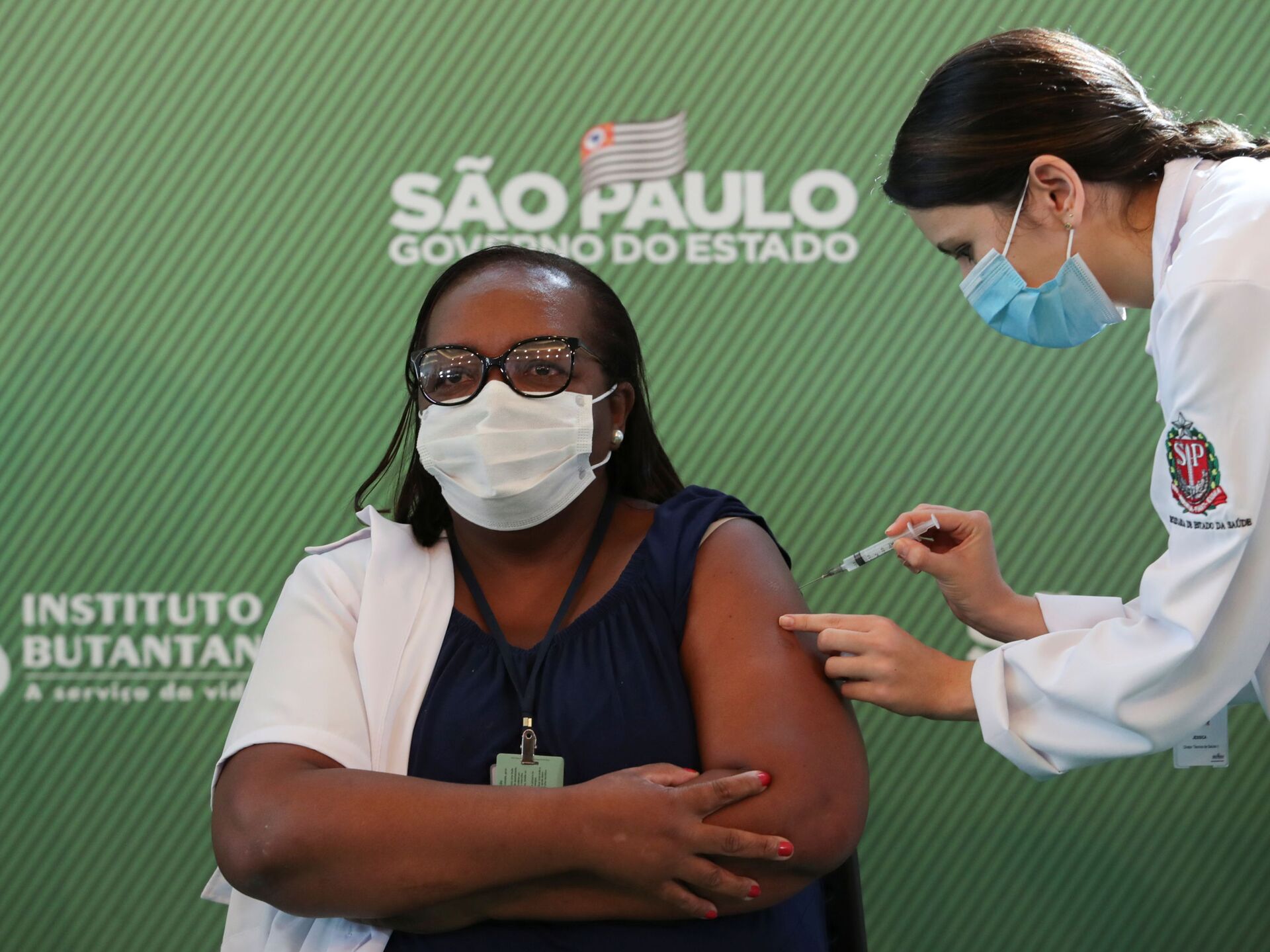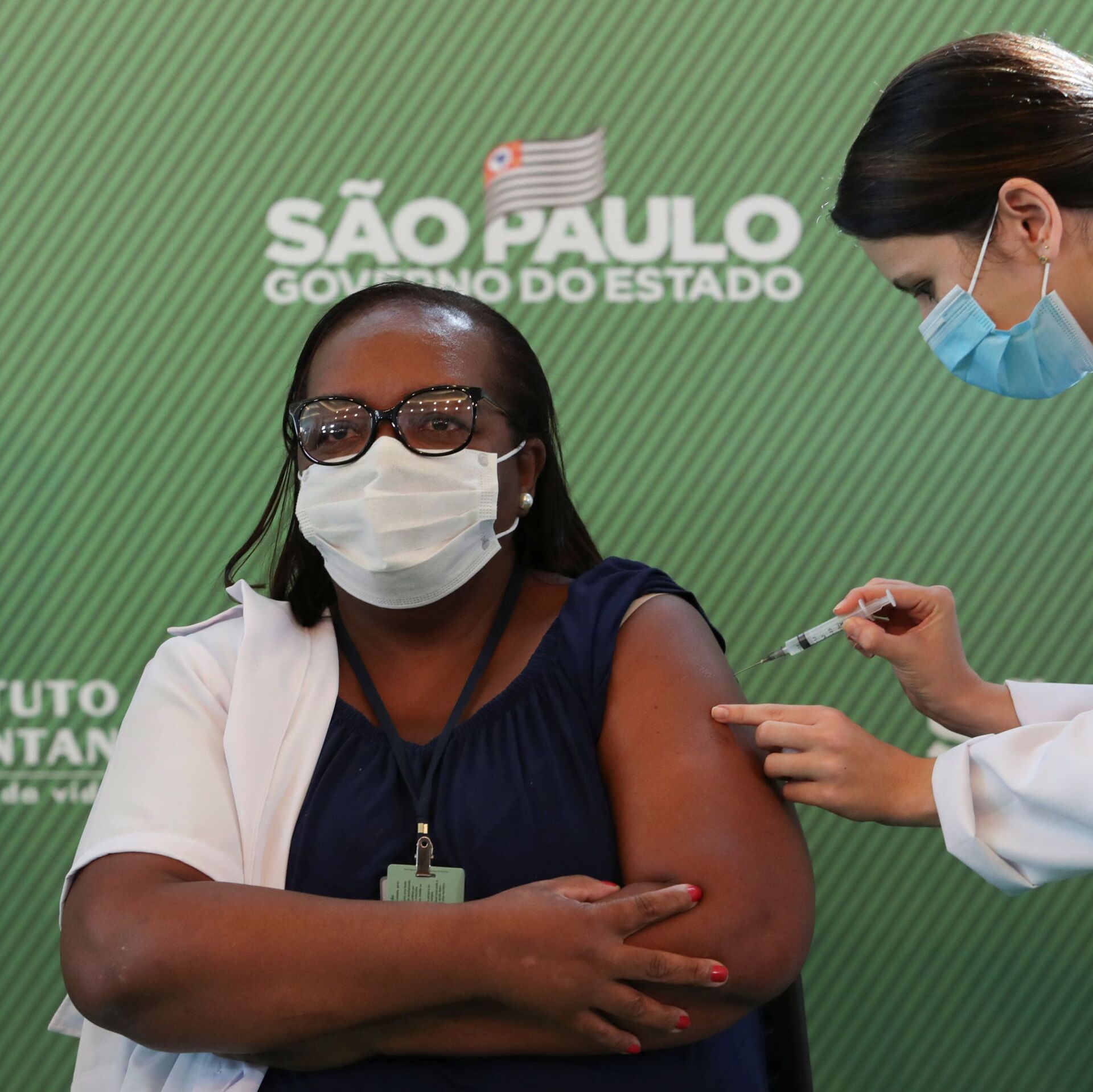 La enfermera, de 54 años y trabajadora en la Unidad de Cuidados Intensivos (UCI) del Instituto Emilio Ribas de Sao Paulo, recibió una primera dosis de la vacuna elaborada por el laboratorio chino Sinovac acompañada del gobernador de Sao Paulo, Joao Doria, que hace meses firmó el acuerdo para que esta vacuna llegara a Brasil.