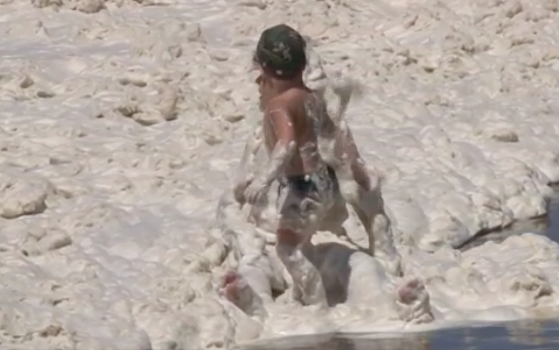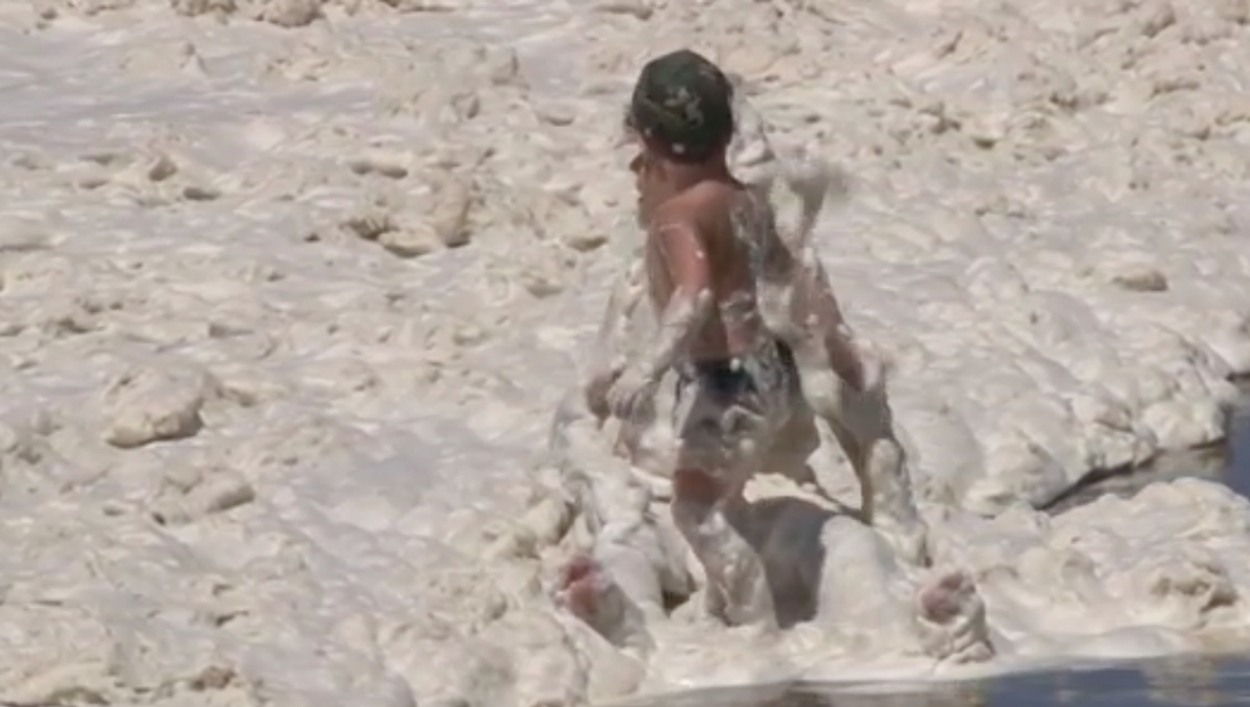 A pesar de que el fenómeno es inusual, muchos niños y adultos no dudan de meterse en el agua y juegan con la espesa espuma.