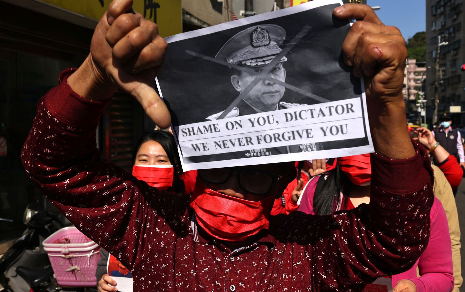 Los manifestantes de Birmania han recibido el apoyo de otros países. En la foto: unos miembros de la comunidad birmana en Taiwán durante una protesta contra el golpe militar en Birmania en una calle de Taipéi.