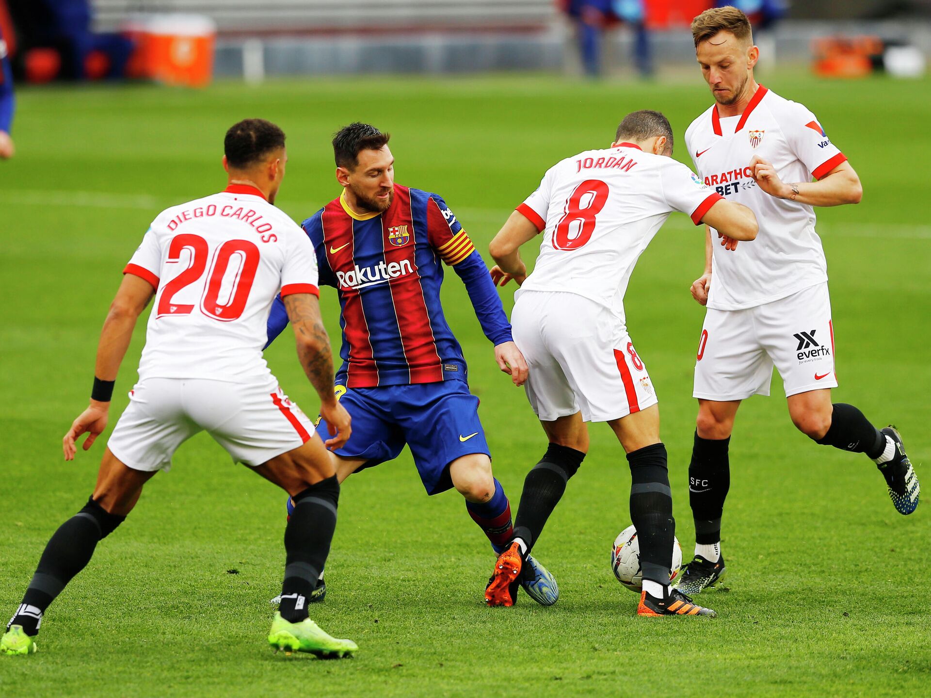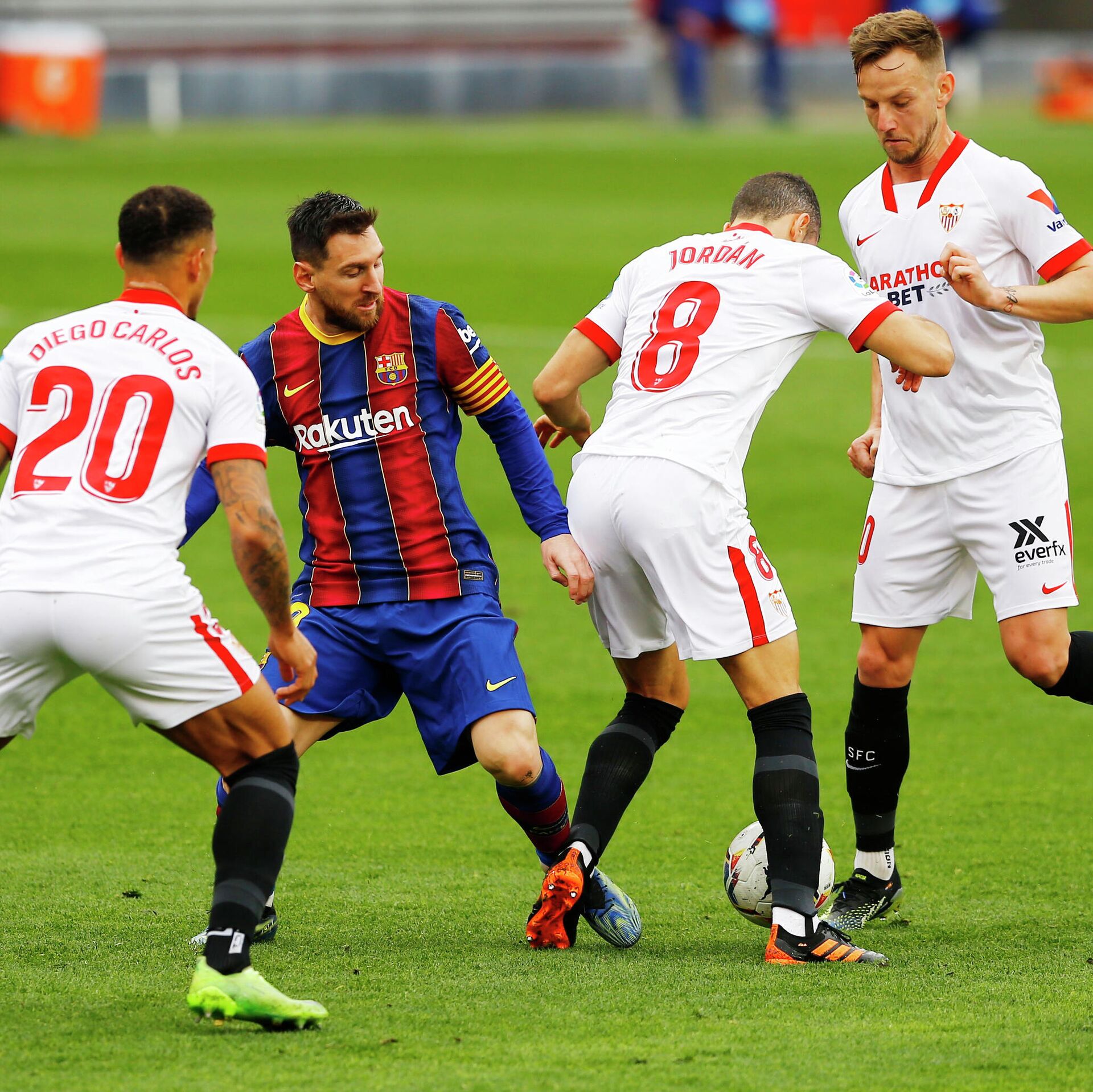 El centrocampista del Sevilla Joan Jordán intentó desesperadamente derribar al delantero y capitán del Barcelona, Lionel Messi, en pleno partido.