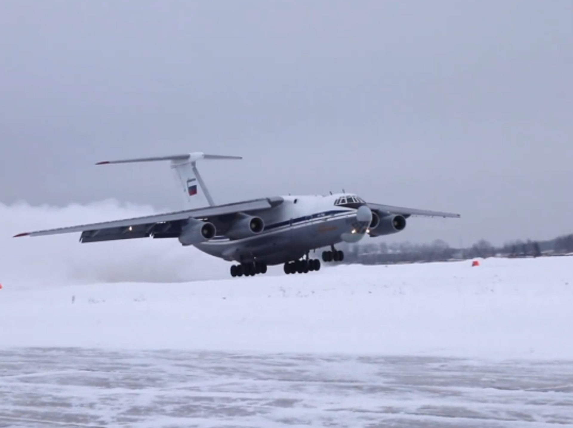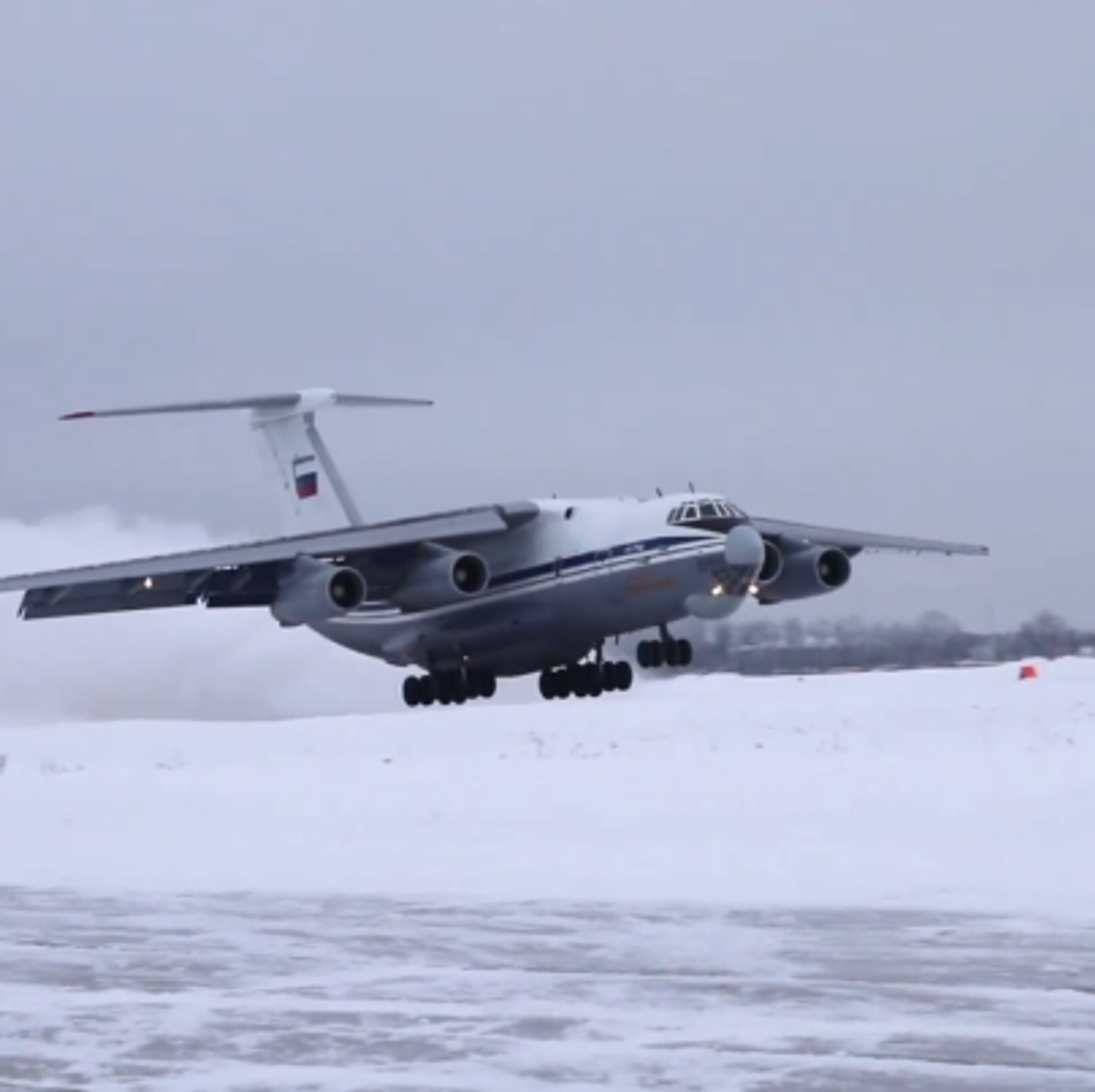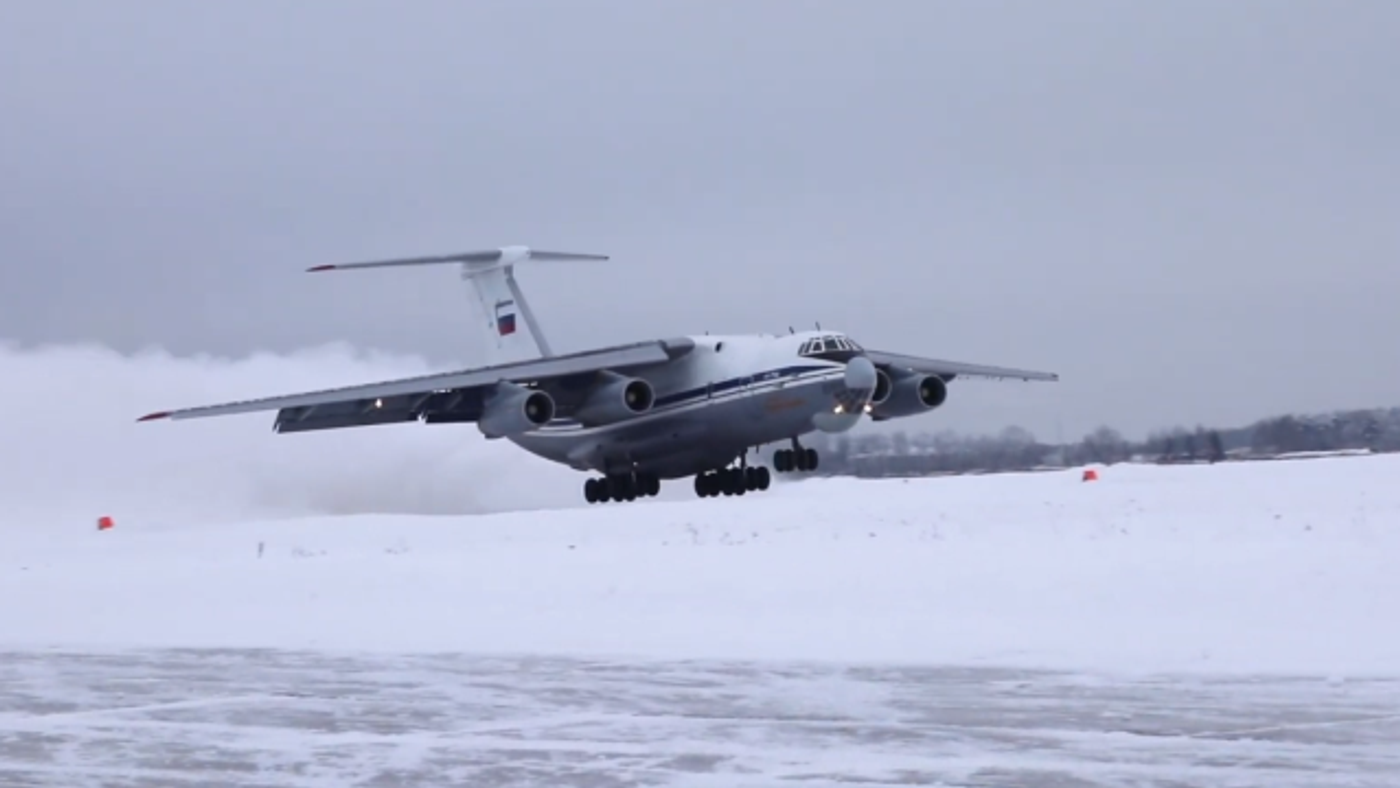 Pilotos rusos despegan y aterrizan unos IL-76 en una pista sin pavimentar cubierta de nieve
