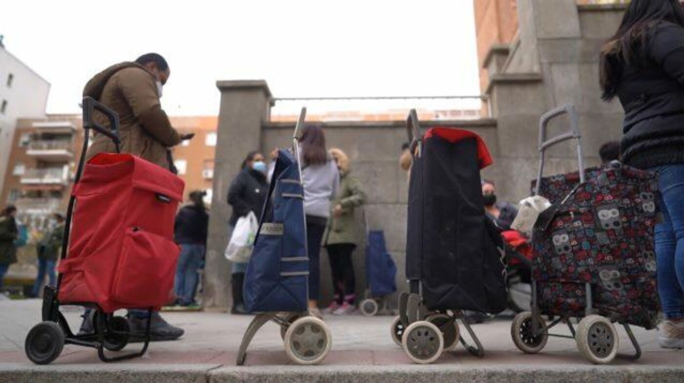 La crisis económica que atraviesa el país se traduce en largas colas de familias que solicitan alimentos gratuitos en las puertas de organizaciones benéficas. Son más de cuatro millones de ciudadanos los que están sin empleo. Según explica Inmaculada Giménez, portavoz de la Fundación Madrina, el perfil de las personas de las llamadas "colas del hambre" es variado."Ves arquitectos, ves enfermeras, ves gente que nunca podrías pensar que podrían estar en unas colas del hambre".Desde el Ministerio de Trabajo explican que esta situación está directamente relacionada con las restricciones que se han impuesto a raíz de la tercera ola. Son muchos los negocios en todo el territorio nacional que se han visto obligados a cerrar sus persianas debido a la baja facturación.Además, explica que la distribución de alimentos por parte de organizaciones benéficas es la única ayuda directa que están recibiendo algunas familias."La renta vital no llega, está paralizada, aunque dicen que han puesto más recursos y personal para agilizar los trámites, pero no llega, y muchas veces tienen que esperar hasta que se decidan por el Ingreso Mínimo Vital, porque no reciban ni una ni otra. Algunas personas llevan tres meses esperando recibir ayuda del Gobierno, y todavía nada".De acuerdo con los datos del Ministerio de Trabajo, el sector de los servicios ha sido el más golpeado. Si se diferencia por sexos, el desempleo afectó aún más a las mujeres, con 31.404 paradas frente a 13.032 hombres. Por territorios son Andalucía, la Comunidad Valenciana y la Comunidad de Madrid son los que registran peores índices.