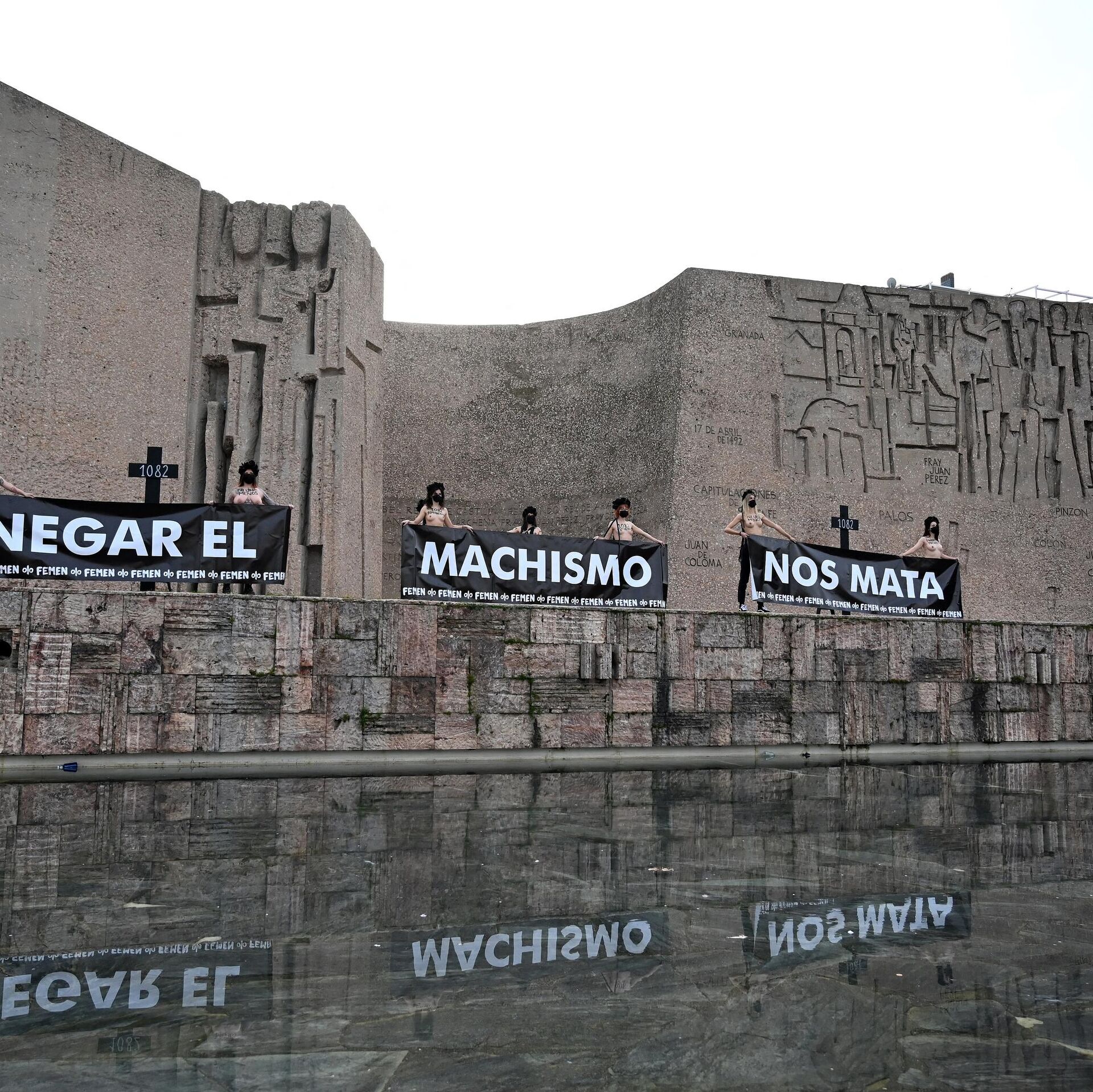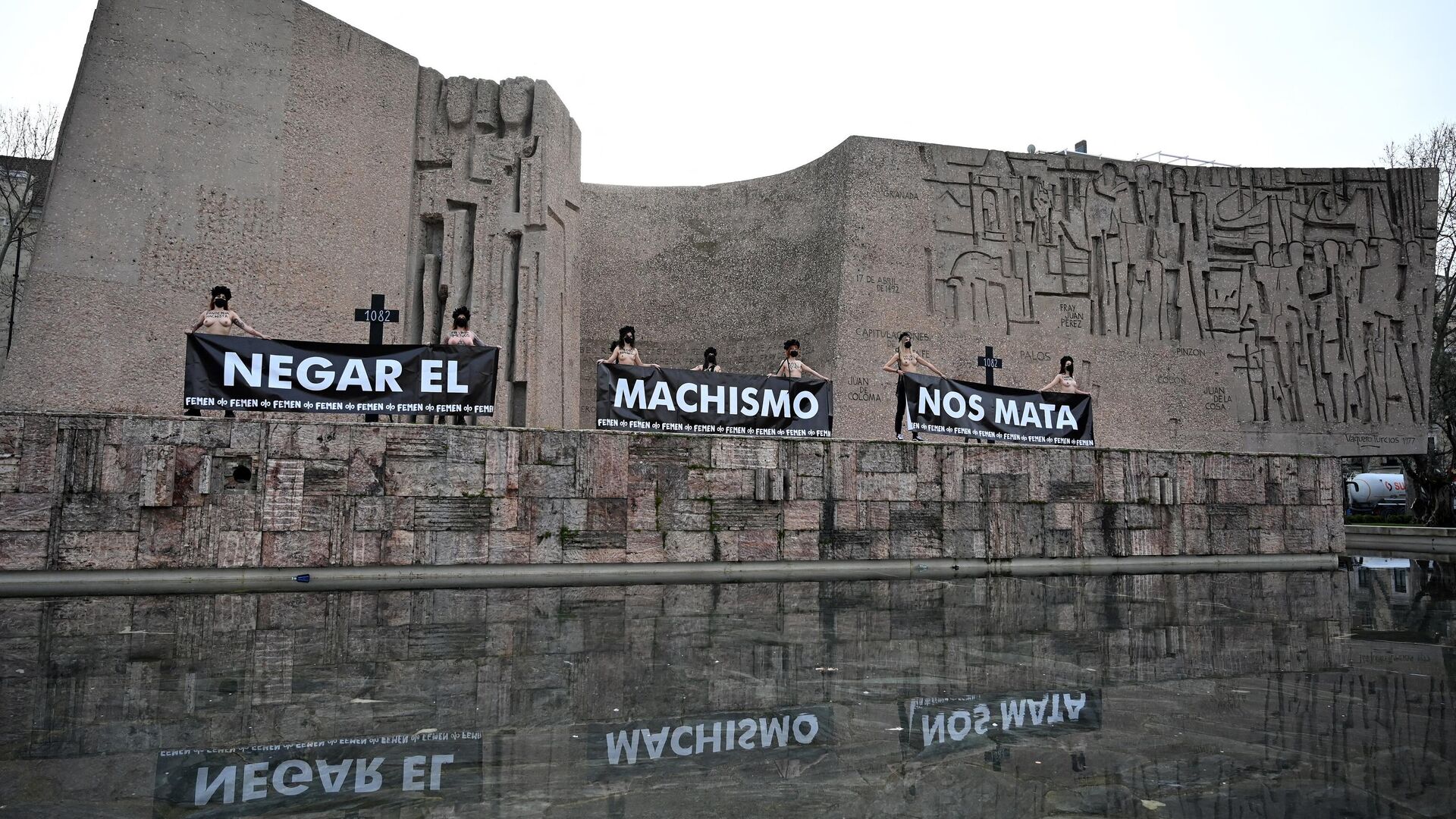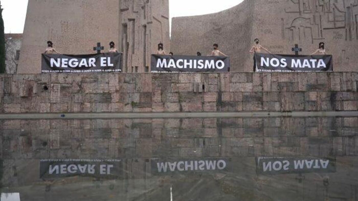 Con su característico pecho desnudo, activistas de FEMEN se reunieron en la emblemática plaza madrileña y desplegaron varias pancartas que decían "negar el machismo nos mata". La protesta se hizo un día después de que la delegación del Gobierno en Madrid suspendiera todos los actos previstos para el Día Internacional de la Mujer debido a la pandemia, una decisión que han recurrido los sindicatos UGT y CC.OO, además de las asociaciones 8M Movimiento Feminista y la Comisión 8M.FEMEN es un grupo activista feminista que lucha por los derechos de la mujer. La organización internacional es conocida por realizar actos con el torso desnudo y usar coronas de flores sobre su cabeza.