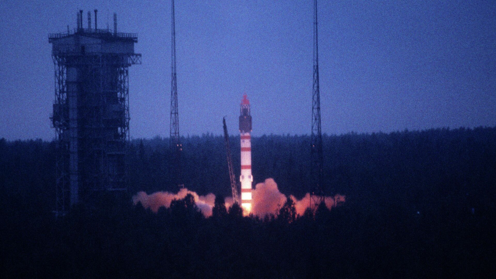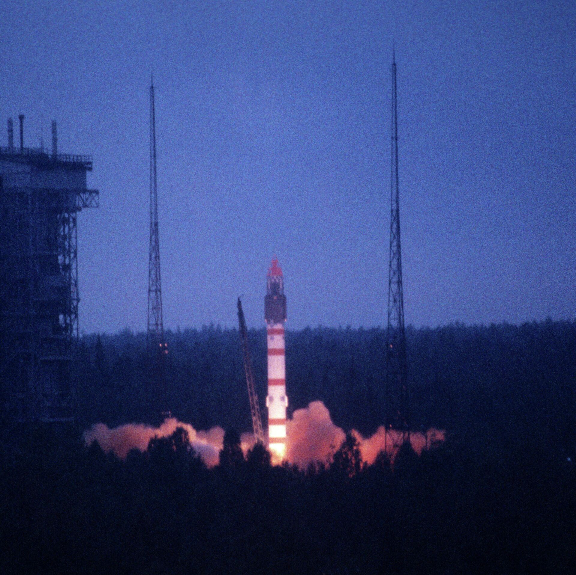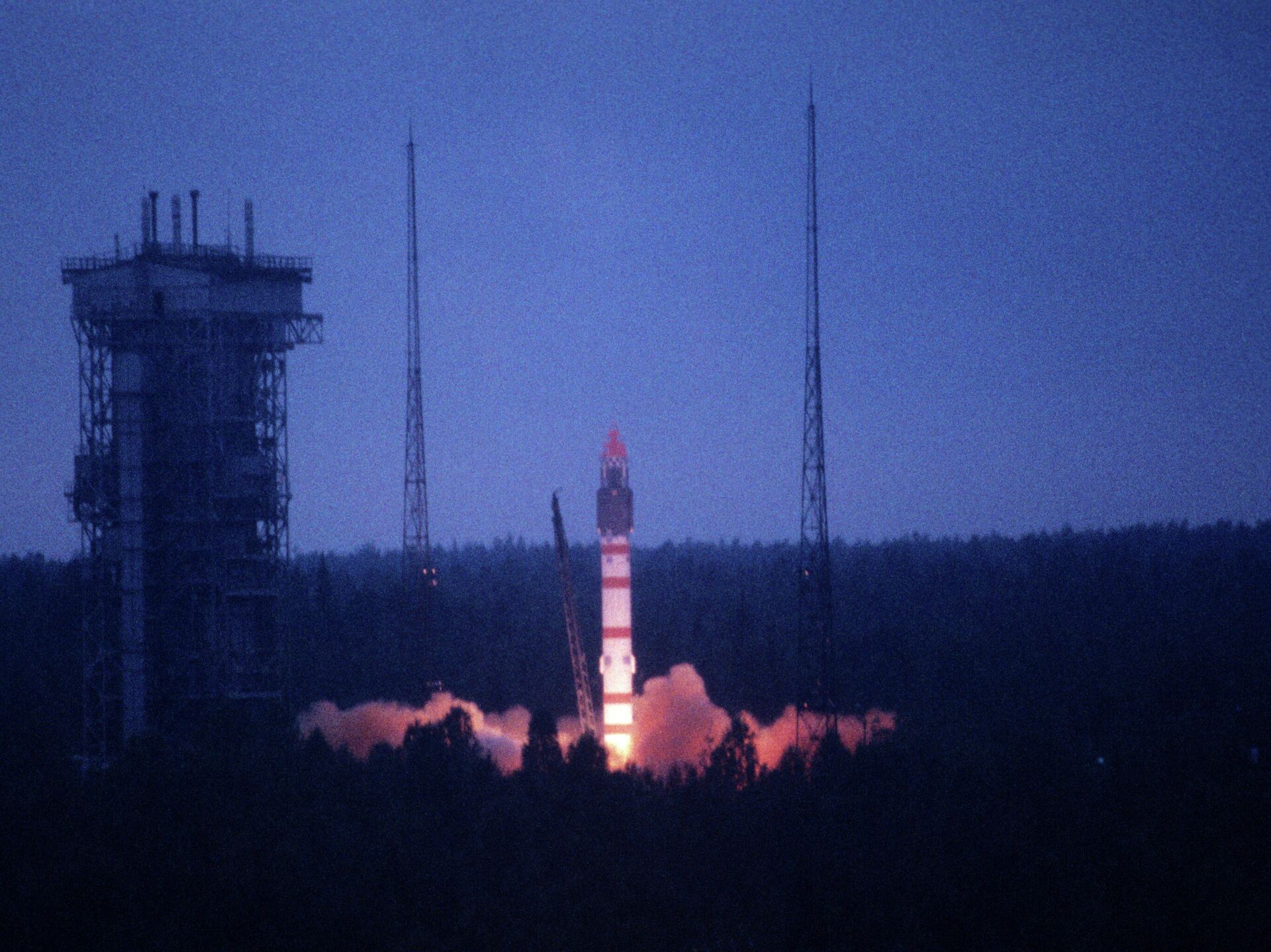 En la foto: el lanzamiento, desde el cosmódromo de Plesetsk, del cohete de transporte Molniya, a bordo del cual se llevó a la órbita el satélite de comunicaciones soviético Molniya-1-76.