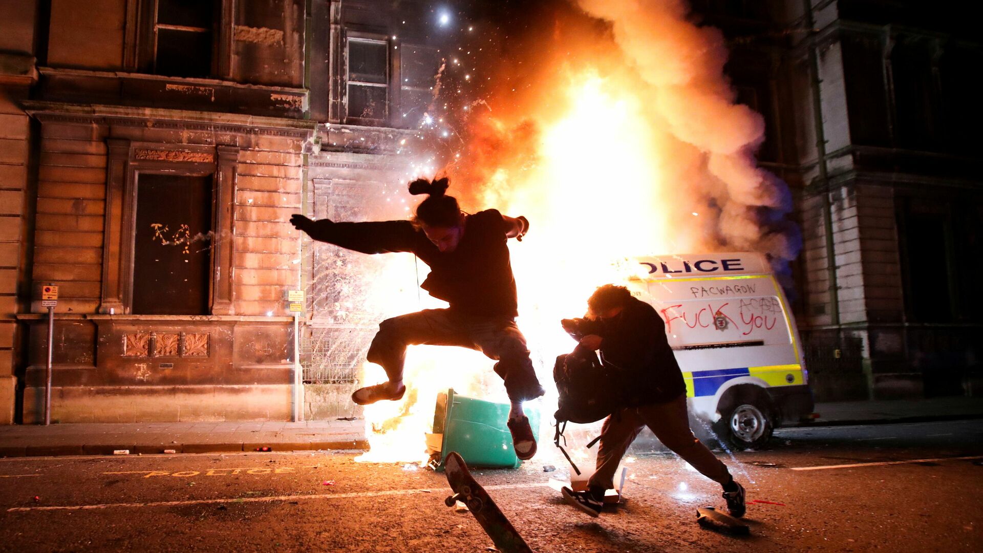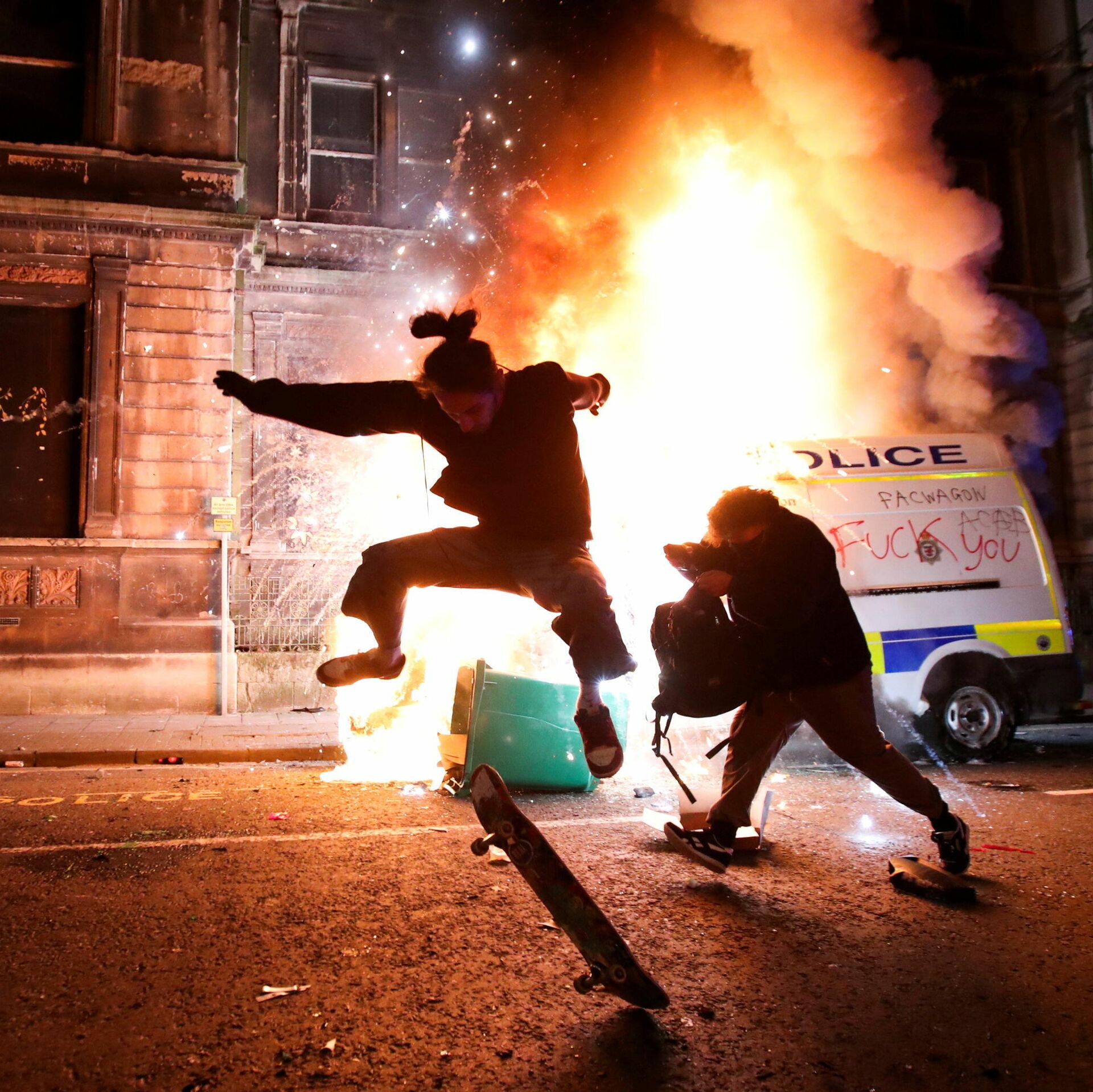 Un manifestante monta en monopatín frente a un coche de Policía calcinado en la ciudad de Bristol (Reino Unido) durante las protestas contra el proyecto de ley que otorga más poderes a la Policía.