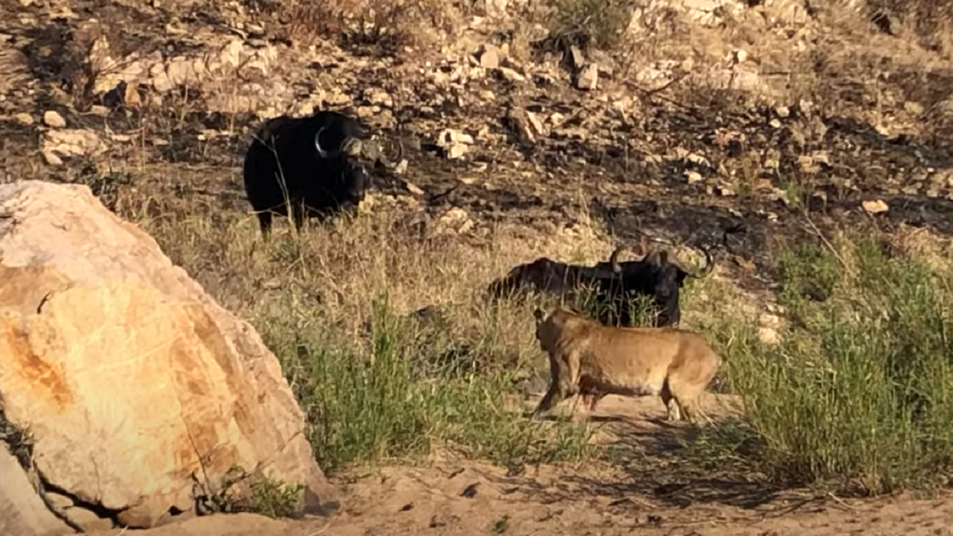Estas imágenes fueron captadas por Louis Strauss, el gerente del hotel Jock Safari Lodge ubicado en el famoso Parque Nacional Kruger (Sudáfrica), mientras iba en auto.En las imágenes se puede ver cómo la leona ataca al búfalo, que por alguna razón no se ve capaz de levantarse para resistir y luchar por su vida. Un par de veces se le acercan otros búfalos, pero al final dejan a su hermano cara a cara con la leona.Normalmente, los leones matan a sus presas antes de comérselas, pero en este caso la felina optó por hacerlo como los perros salvajes, quienes se comen a sus presas mientras aún están vivas. Tampoco es normal que las leonas cacen solas, pero según explicó el autor de las imágenes, todas sus hermanas tienen cachorros en este período, por lo que tienen que buscar comida por su propia cuenta.Pero al final un león macho le quitó el búfalo a la hembra y pasó todo el día alimentándose. Por la noche, tres leonas también se comieron la presa, reveló. Al día siguiente, las hienas se hicieron cargo de lo que quedó.