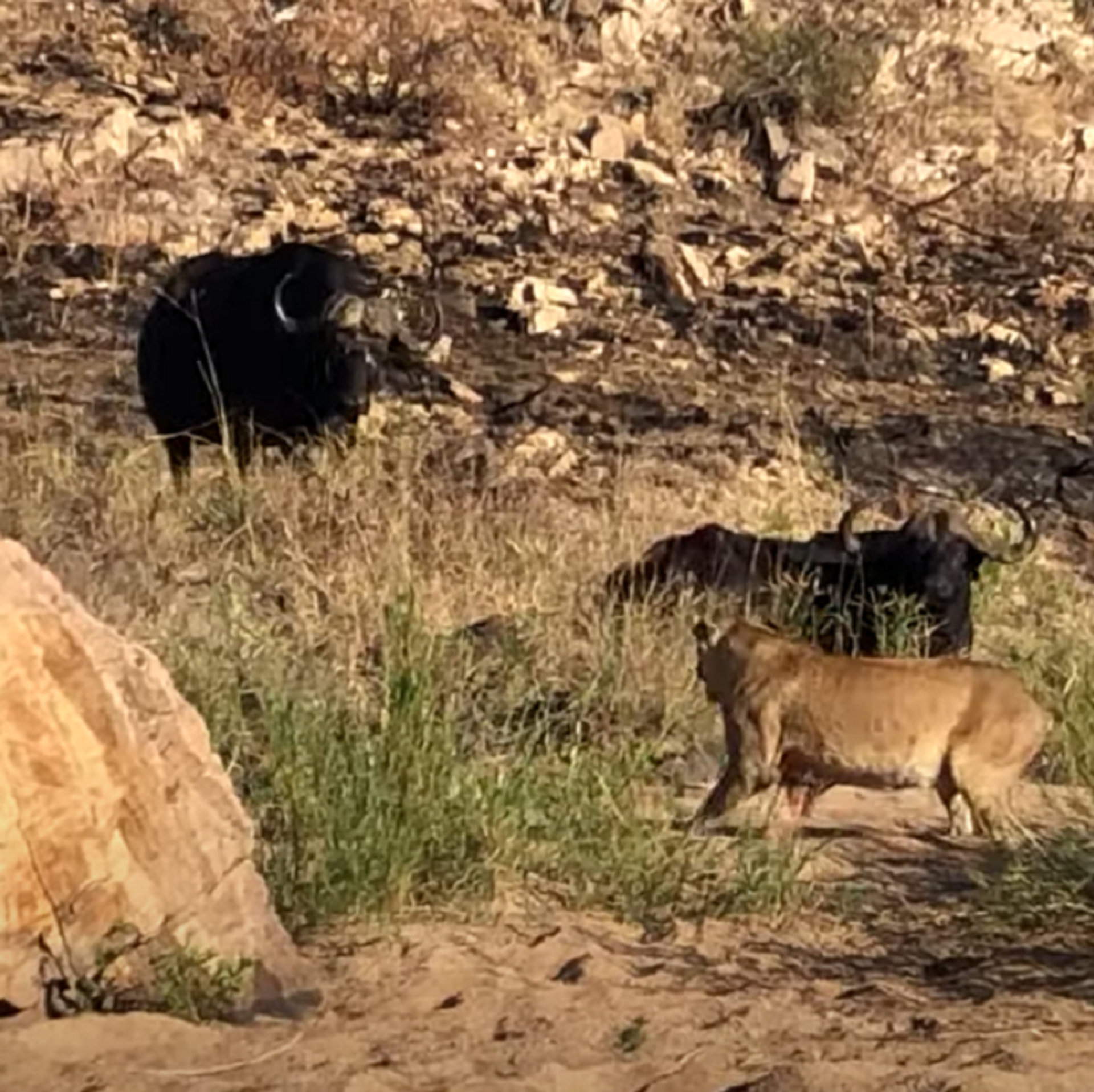 se le acercan otros búfalos, pero al final dejan a su hermano cara a cara con la leona.