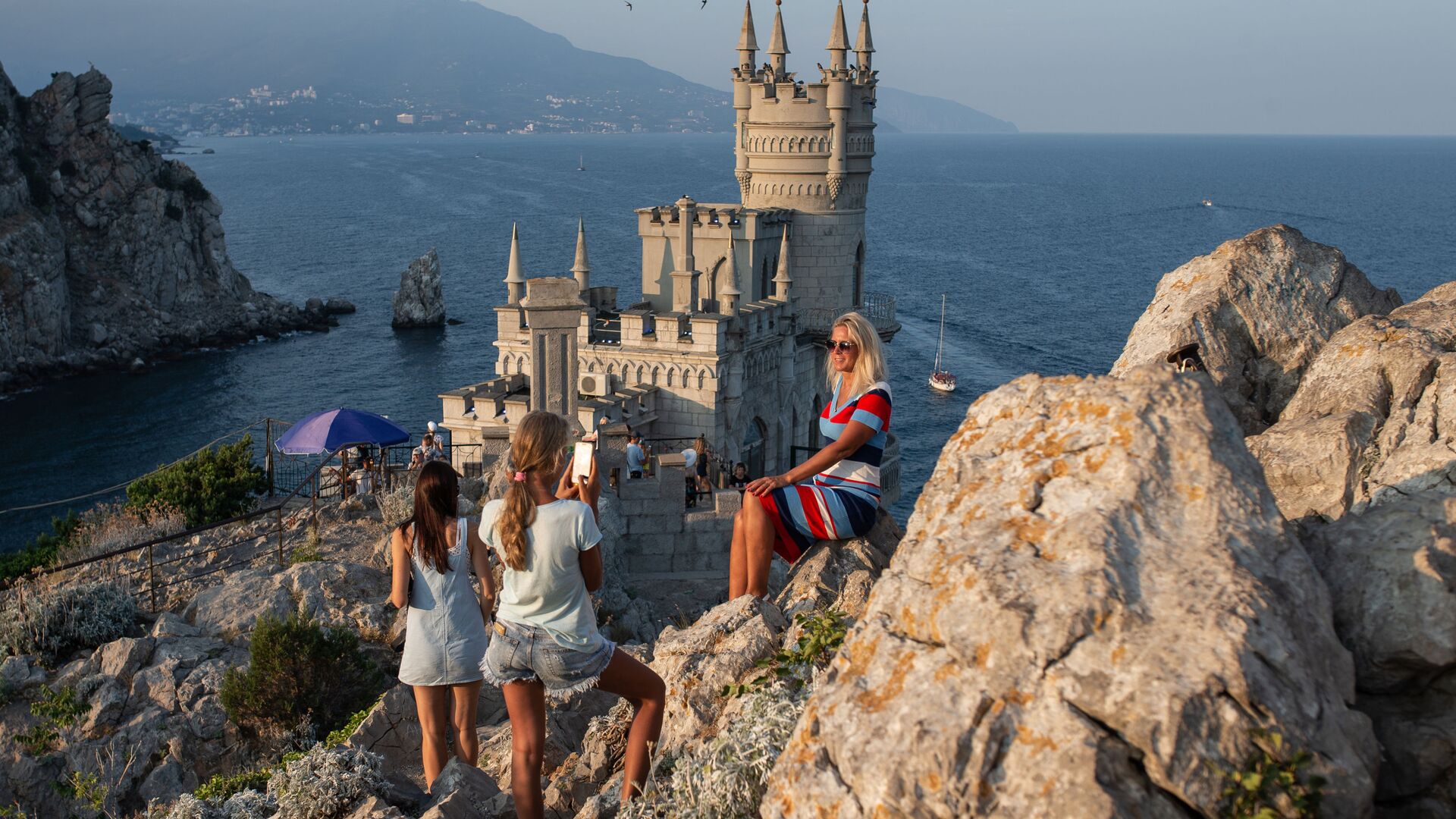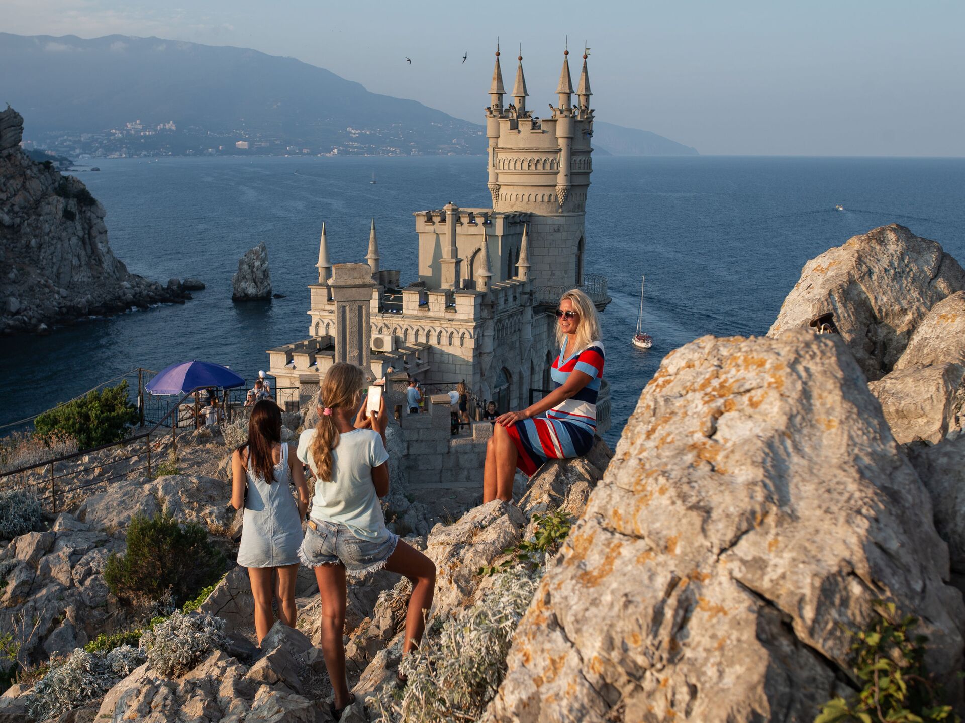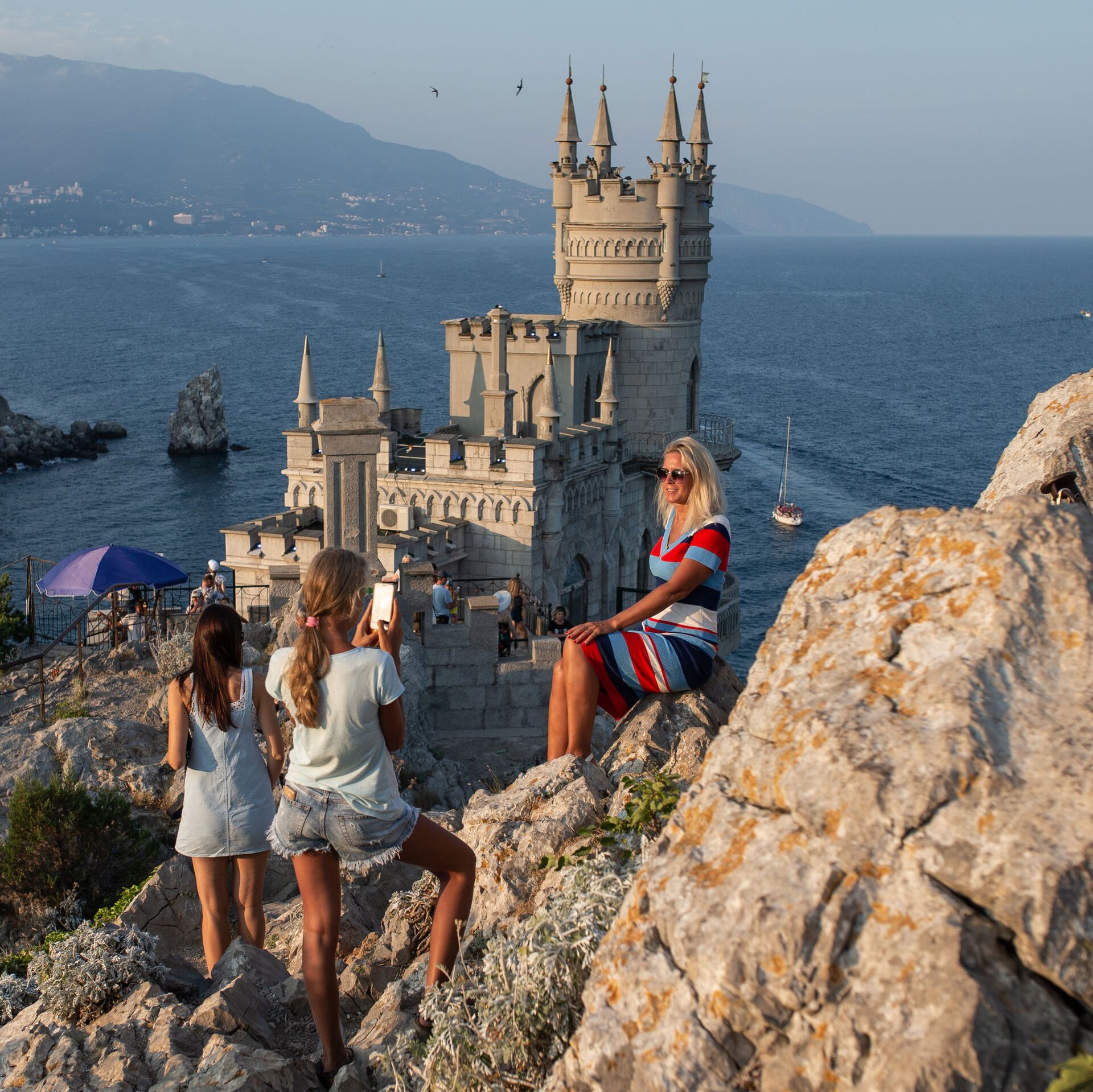 © Sputnik / Konstantin Mihalchevsky / Acceder al contenido multimediaОтдыхающие фотографируются возле замка "Ласточкино гнездо" на береговой скале в поселке Гаспра в Крыму