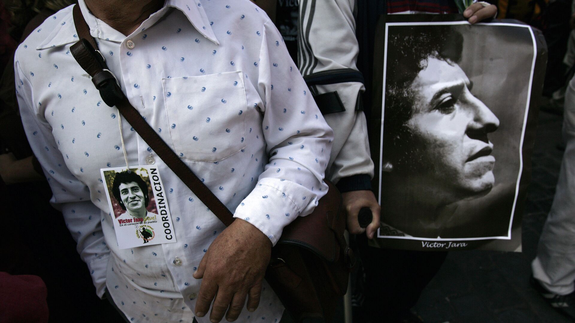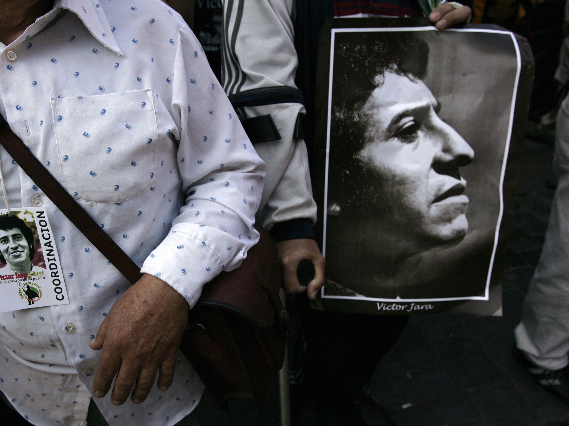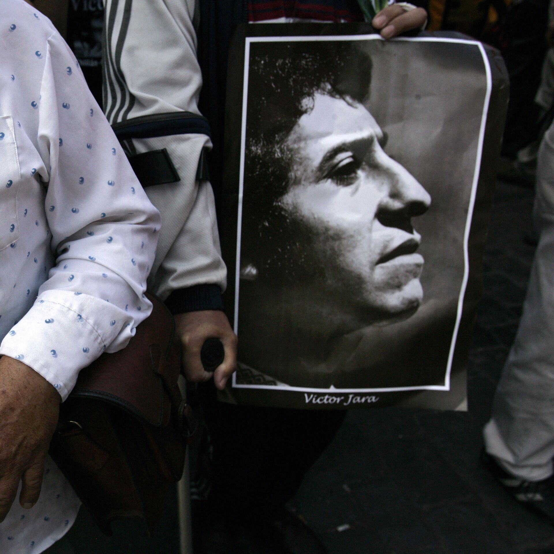 A man holds the portrait of Chilean singer Victor Jara, during his funeral in Santiago on December 5, 2009 - Sputnik Mundo, 1920, 29.09.2021