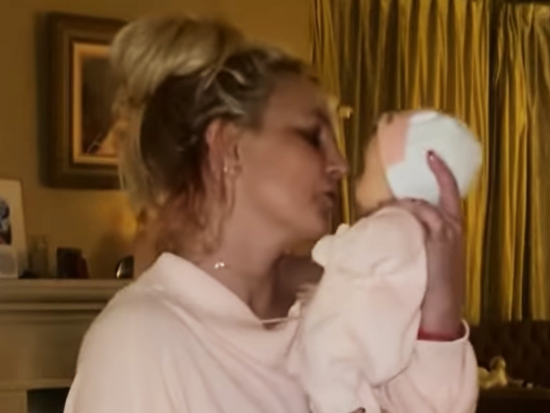 El video, captado por el prometido de la artista, el entrenador y modelo Sam Ashgari, muestra a Britney bailando enérgicamente con una muñeca realista en sus manos. "Oh, ¡miren eso! ¡Se parecen mucho la una a la otra!", se le oye decir a Asghari. Britney, a su vez, besa a su hija recién nacida.
