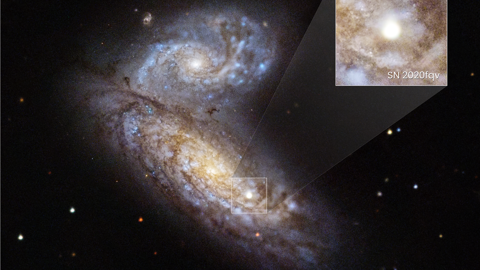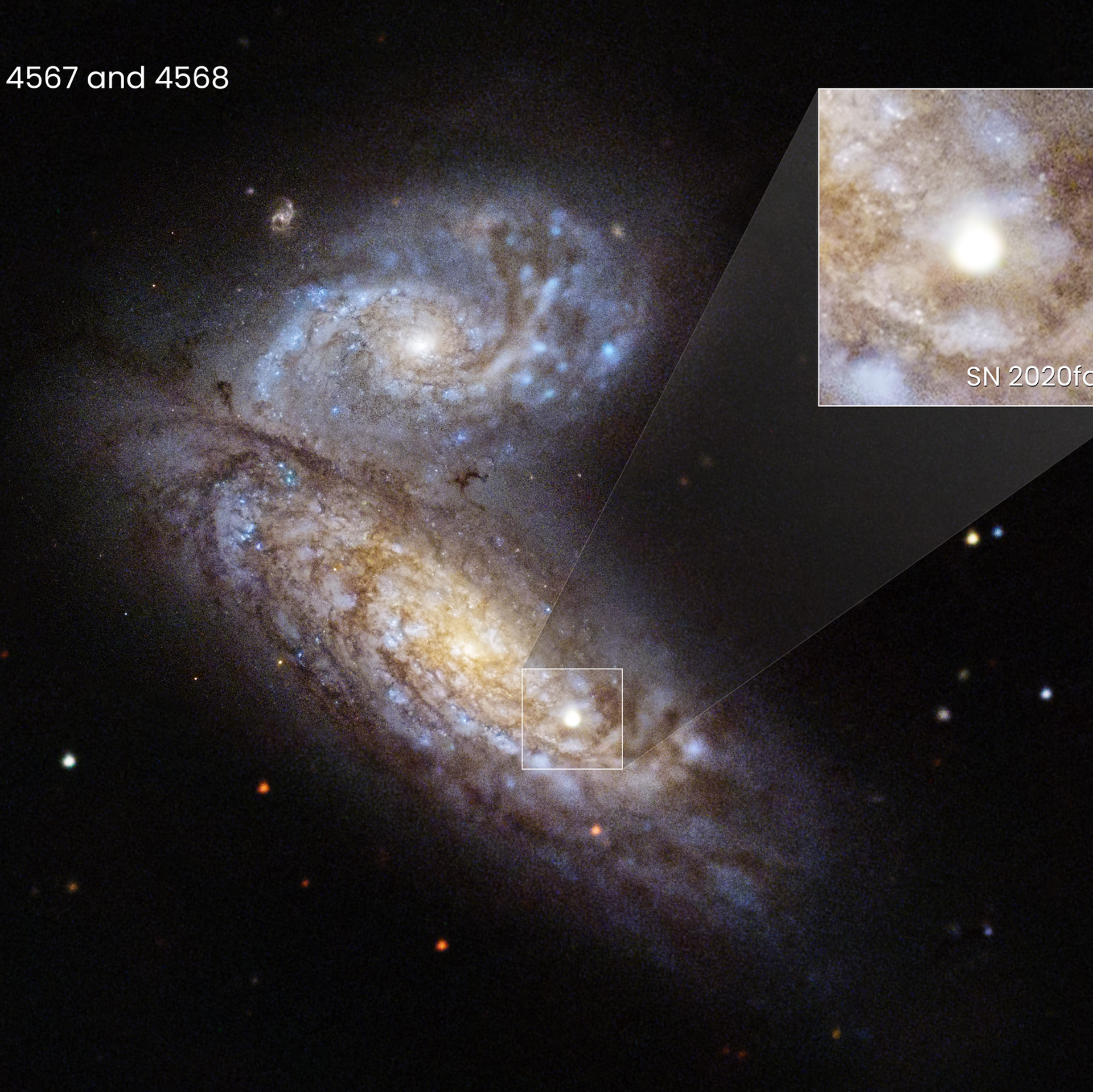 En cooperación con otros telescopios espaciales y terrestres, el Hubble brindó una visión completa de la etapa más temprana de la explosión de la supernova SN 2020fqv, ubicada en las llamadas galaxias mariposa (NGC 4567 y NGC 4568), a unos 60 millones de años luz de distancia, en la constelación de Virgo.