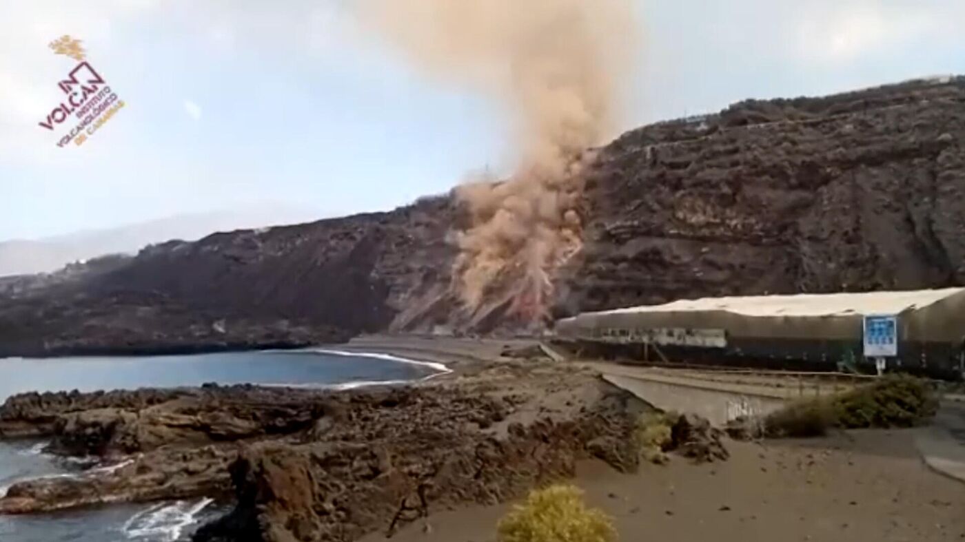 14:31 GMT 10.11.2021 (actualizado: 14:32 GMT 10.11.2021) El material incandescente comenzó a caer al mar de madrugada en la playa de los Guirres. La colada volcánica ha formado una segunda fajana adyacente a la primera.