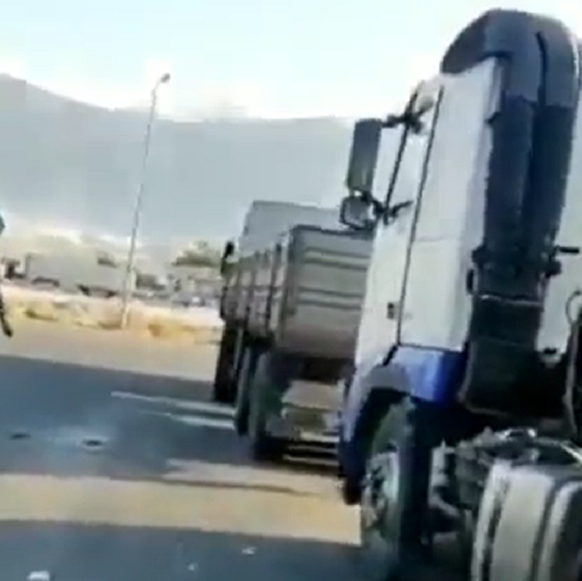 Las imágenes captadas por un testigo revelan cómo los enormes vehículos se balancean de lado a lado como si estuvieran hechos de cartón. En el fondo se ve cómo gigantescas nubes de polvo aparecen en las laderas de las montañas tras un presunto deslizamiento.