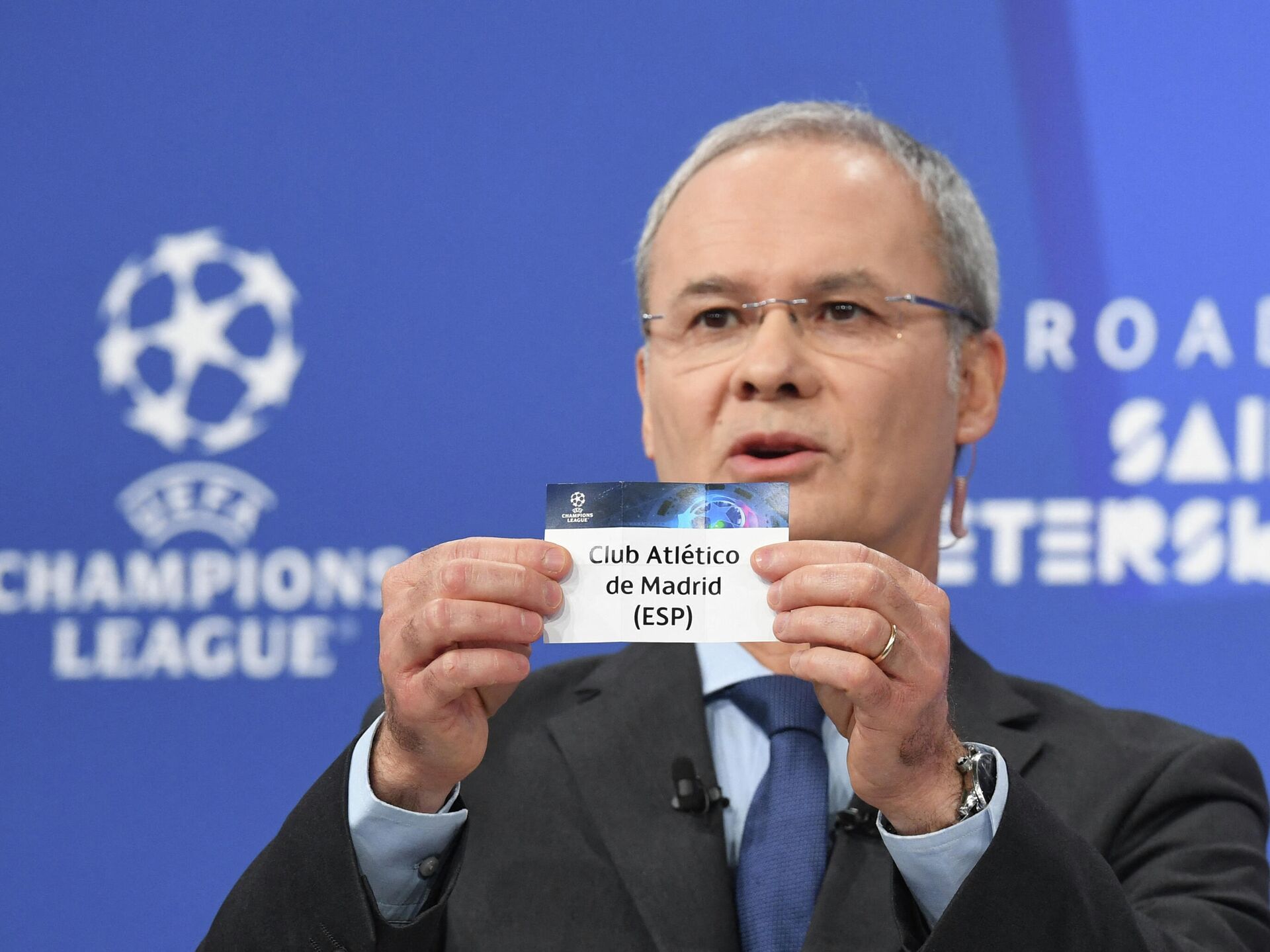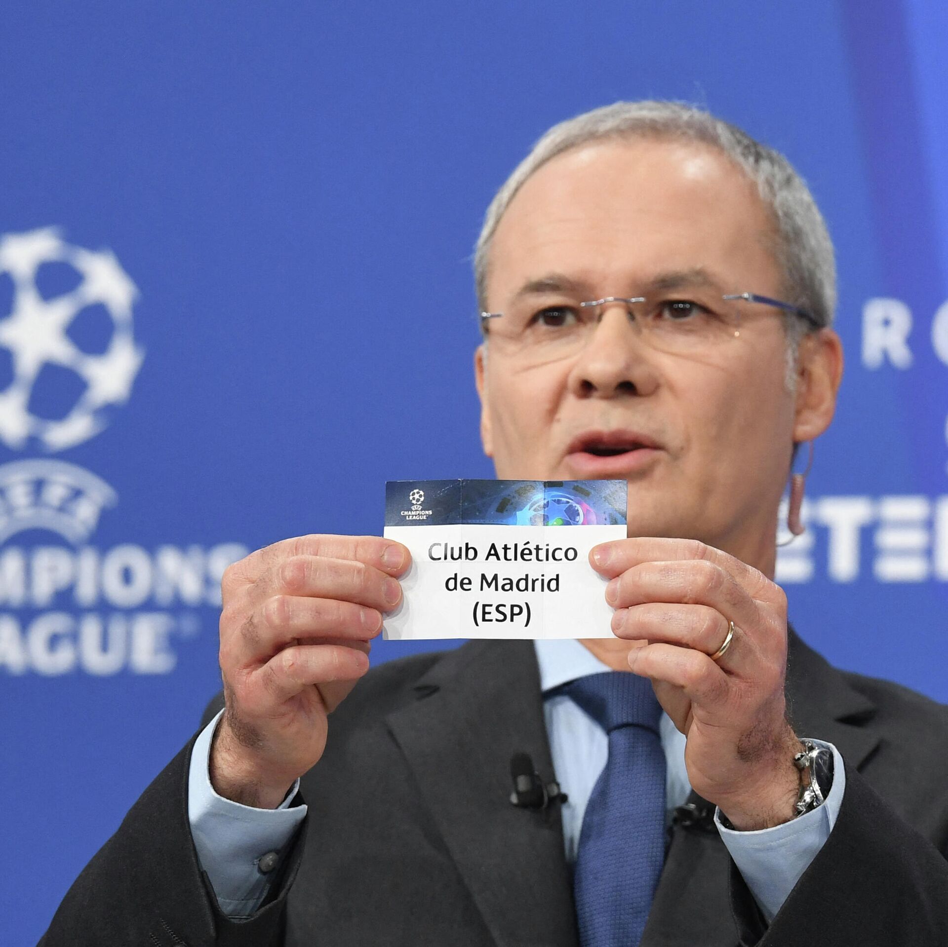 El secretario adjunto de la UEFA y exentrenador, Giorgio Marchetti, sostiene la papeleta del Atlético de Madrid - Sputnik Mundo, 1920, 13.12.2021