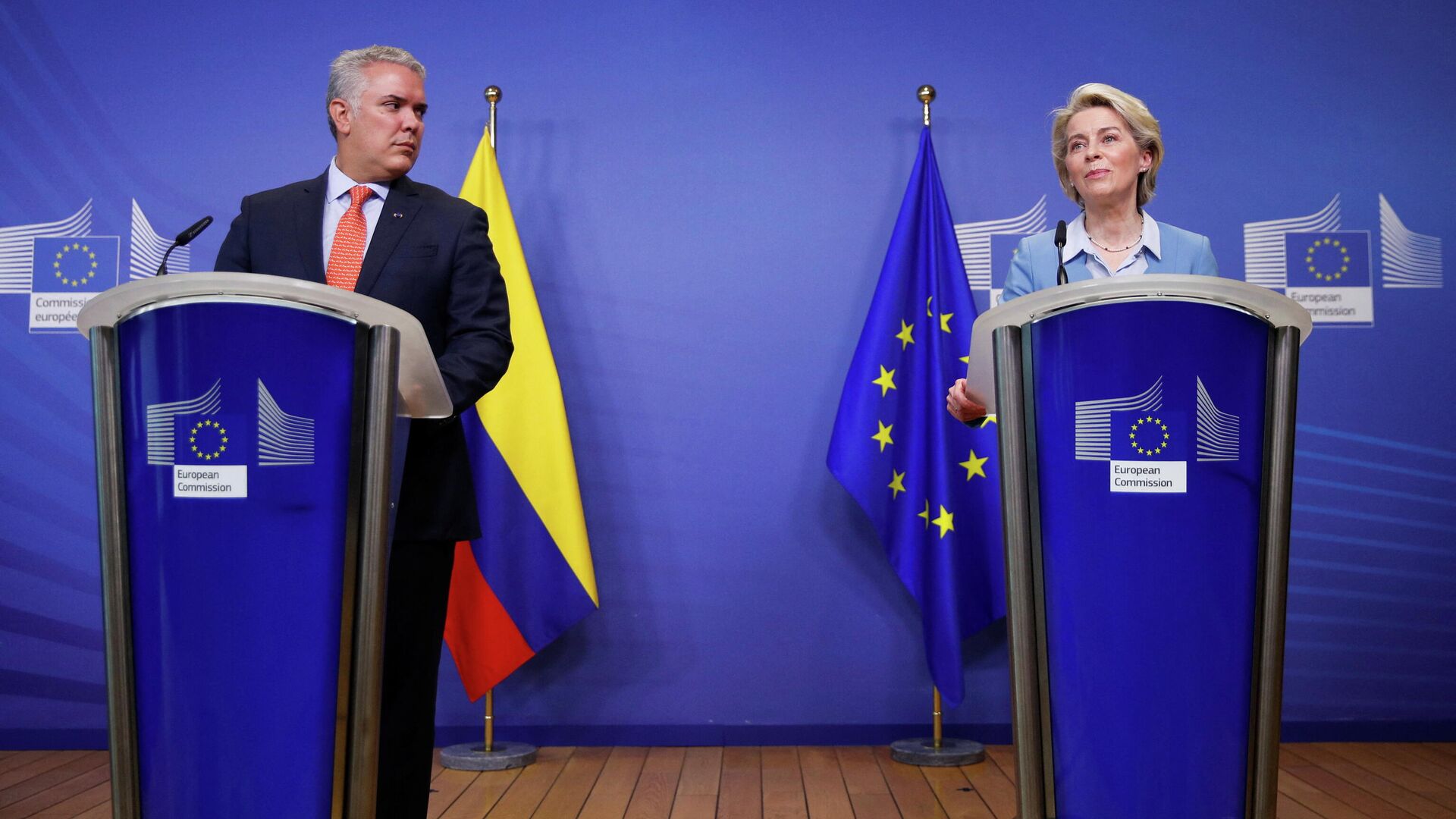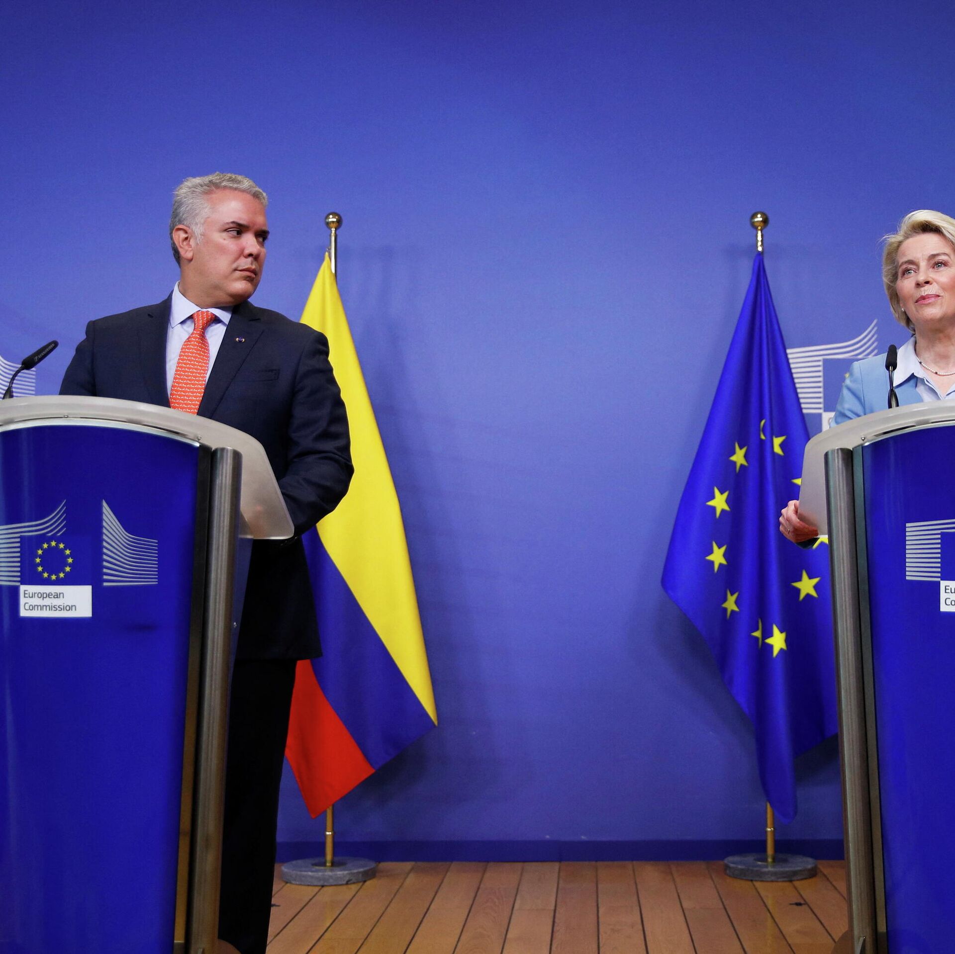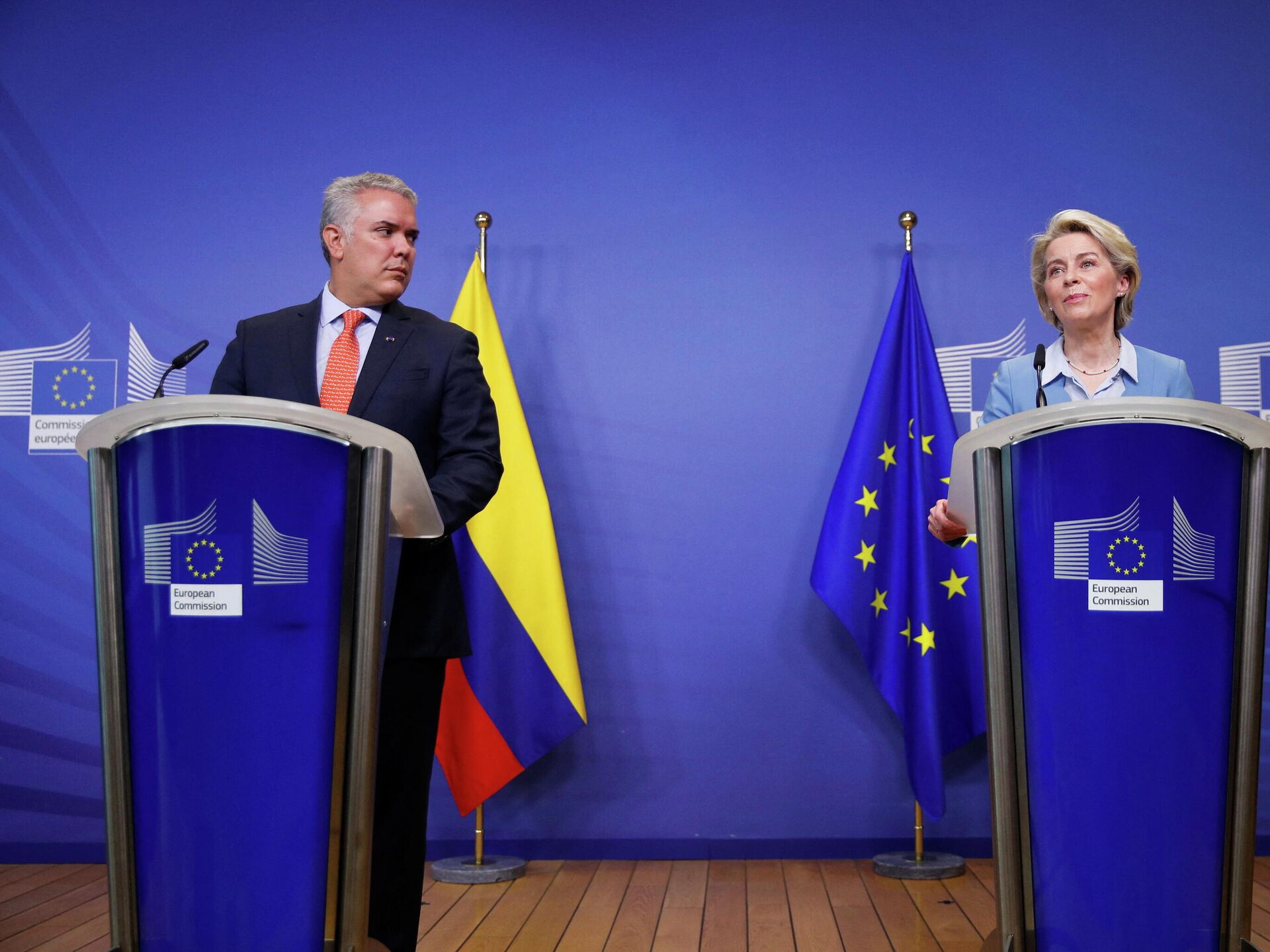 "Colombia es una enorme potencia ecológica, tiene una riqueza tremenda y es un socio indispensable en la lucha contra el cambio climático y nuestra transición en todas las acciones a favor del medio ambiente; ambos compartimos una sólida determinación en este campo y trabajaremos codo con codo en nuestro programa medio ambiental", dijo por su parte Von der Leyen en la conferencia de prensa conjunta.