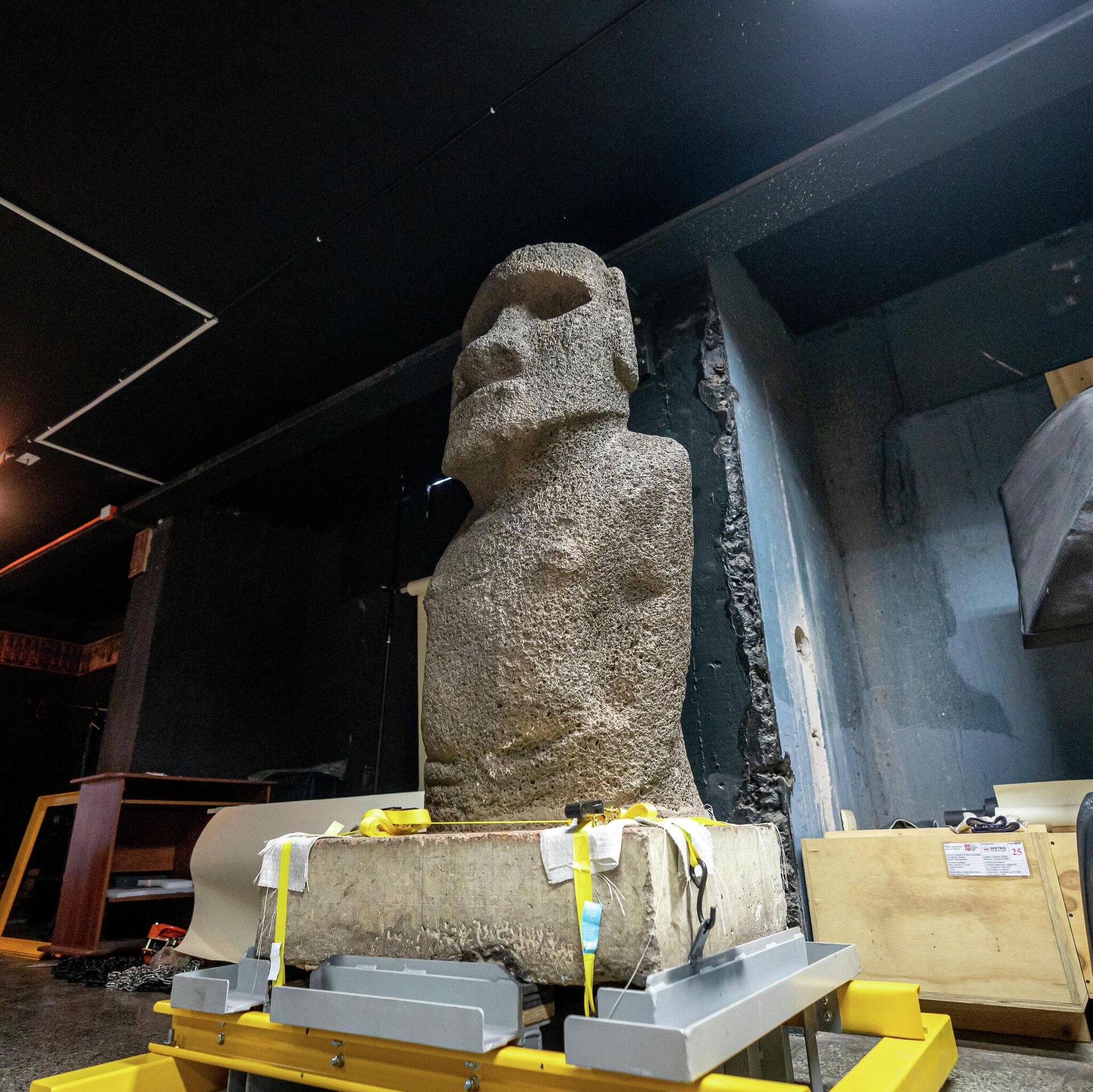 El moai Tau de 715 kilos está montado sobre una plataforma de hormigón de 230 kilos, por eso para trasladarlo se construyó una nueva base metálica de 116 kilos y un embalaje especial para su protección que pesa 194 kilos.