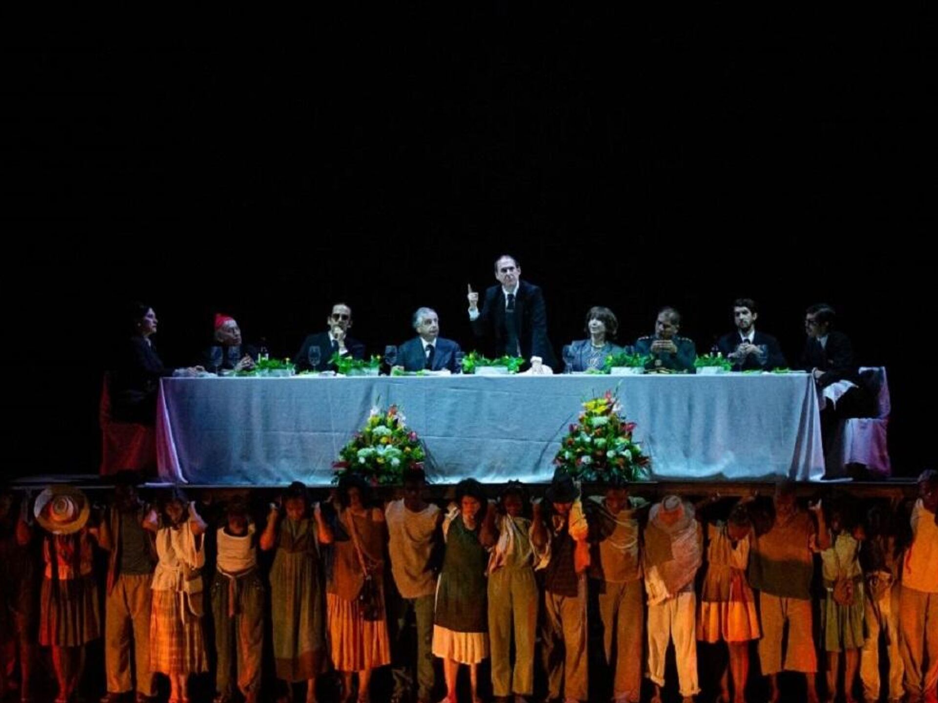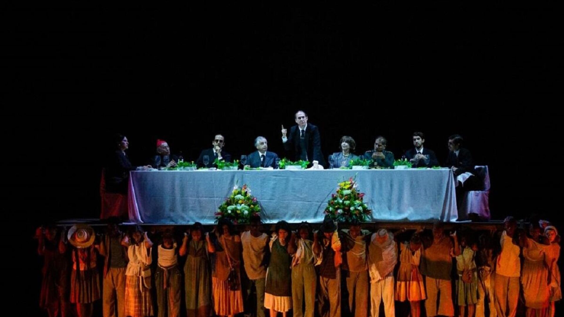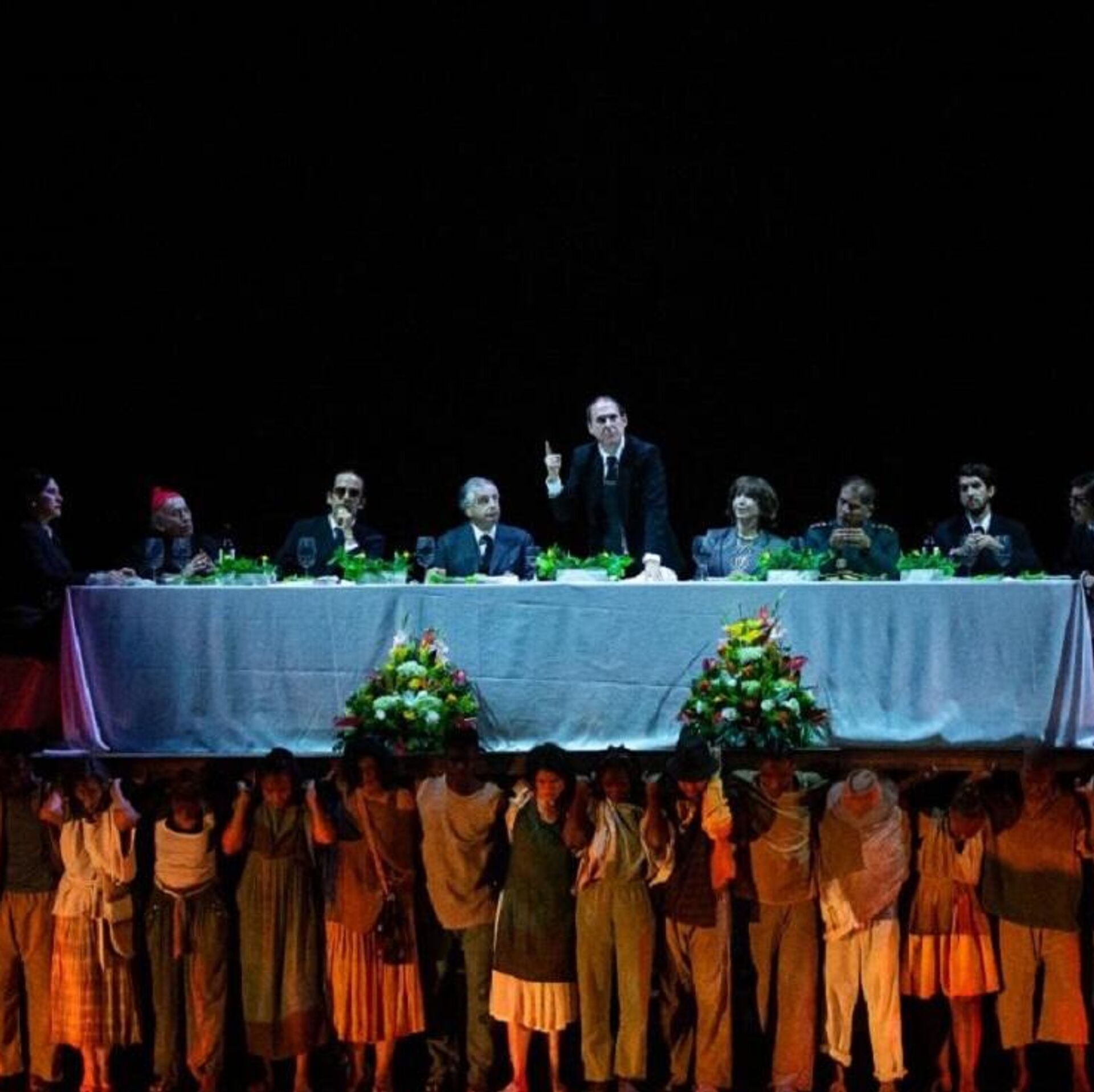 La única escena que tiene diálogos impacta, pues un grupo de hombres y mujeres cargan un tablón enorme de madera. Sobre ellos, una mesa y un banquete, una docena de personas que hablan de la realidad del país. Y un presidente justifica su actuar, revictimiza y se muestra indiferente. Y de manera desalmada, entre poderosos, se establecen alianzas, se hacen pactos de silencio y se culpa al pueblo por lo sucedido, a un pueblo que mira desde abajo y que con sus hombros lleva el paso de unos pocos, de la clase dirigente.