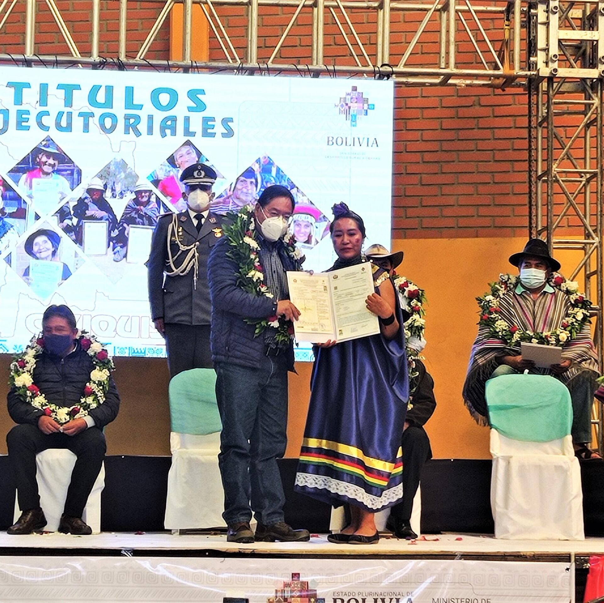 Antes del mediodía, Arce tenía que presenciar en la misma plaza el desfile cívico-militar en conmemoración de la fecha. Pero el presidente optó por dejar su silla vacía y concurrir a un encuentro de campesinos e indígenas de los pueblos Quechua y Guaraní, a los cuales entregó más de 1.000 títulos de propiedad por las tierras en las que vivieron ancestralmente.