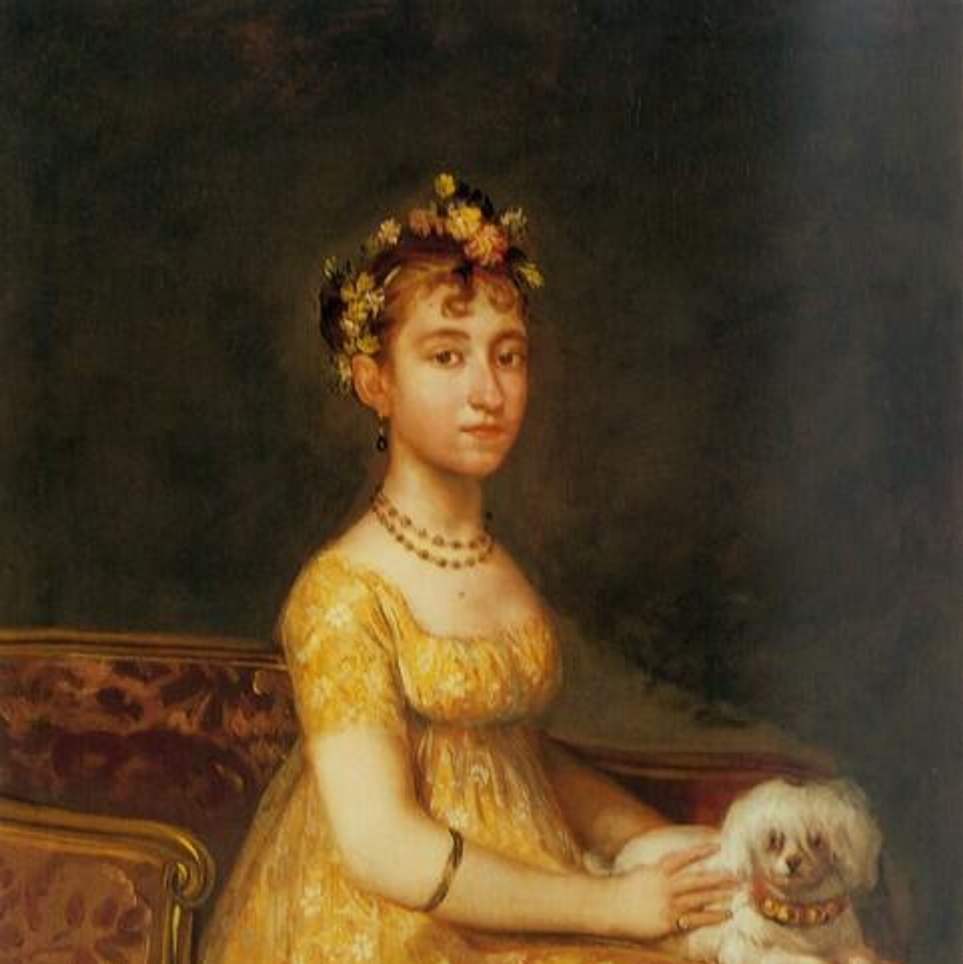 Se trata de El retrato de Doña María Vicenta Barruso Valdés sentada en un sofá con un perro y el retrato de su madre Doña Leonora Antonia Valdés de Barruso, sentada en una silla sosteniendo un abanico.