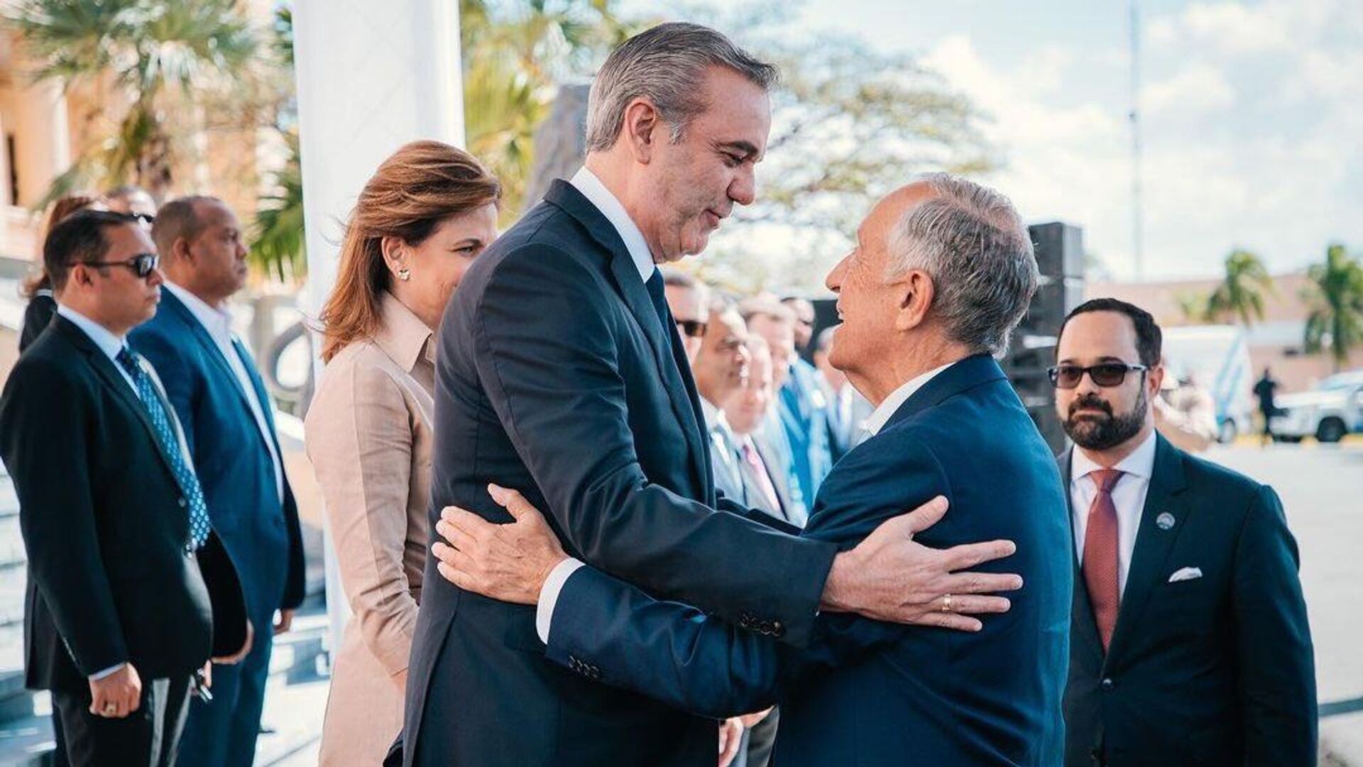 Abinader encabezó el recibimiento al jefe de Estado del país ibérico en la explanada frontal del Palacio Nacional (sede del Ejecutivo), y de inmediato ambos gobernantes realizaron el pase de revista militar y la presentación de sus respectivas delegaciones. Luego Abinader y Rebelo de Sousa pasaron a una audiencia privada, en el Salón Blanco del Palacio Nacional. La agenda oficial de la visita incluye una reunión ampliada de ambas delegaciones en el Salón Consejo de Gobierno, y más tarde los mandatarios participarán en una ceremonia de firma de instrumentos, imposición de condecoraciones y declaración conjunta, en la propia mansión ejecutiva. La colocación de una ofrenda ante el Altar de la Patria y un recibimiento por parte de los presidentes de las dos cámaras del Congreso Nacional (parlamento), completan el programa de la visita oficial del presidente lusitano. Rebelo de Sousa es uno de los 14 jefes de Estado o Gobierno que confirmaron su asistencia a la Cumbre Iberoamericana, que el país caribeño organiza por segunda ocasión, luego de la decimosegunda edición acogida por el paraje de Bávaro (polo turístico de Punta Cana, noreste) a mediados de noviembre de 2002.