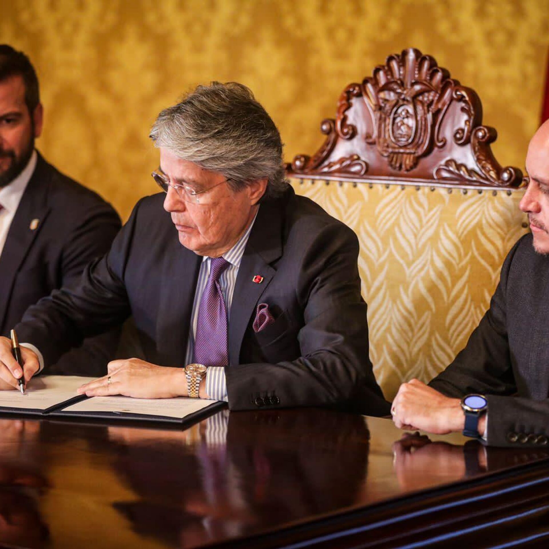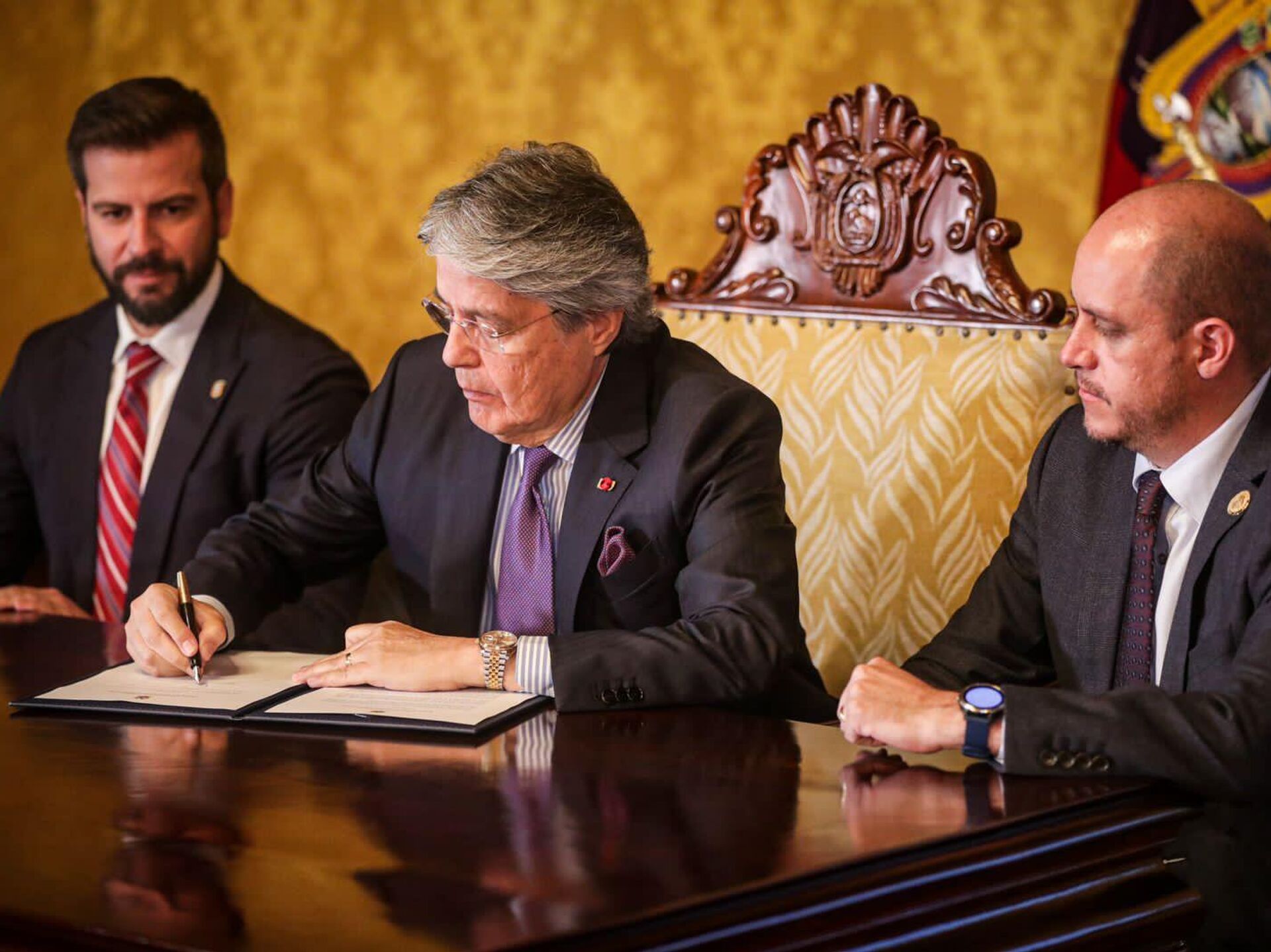 En la ceremonia de rúbrica, en el Palacio de Carondelet, sede del Ejecutivo, estuvieron presentes el ministro de Economía y Finanzas, Pablo Arosemena, y el ministro de Producción, Comercio Exterior, Inversiones y Pesca, Julio Prado.