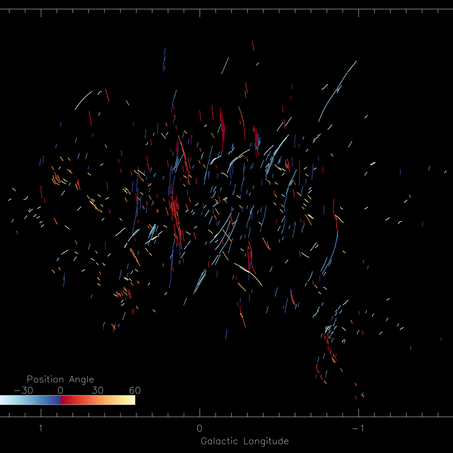 Imagen MeerKAT del centro galáctico con ángulos de posición codificados por colores, todos los filamentos