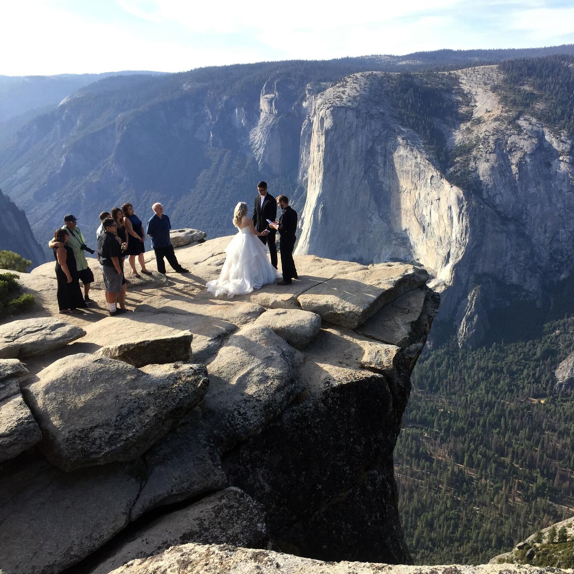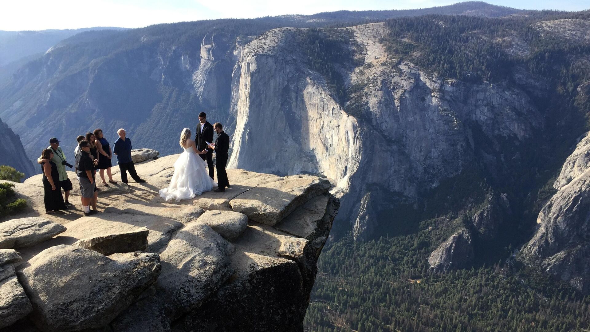 En la foto: una ceremonia de boda en el acantilado de Taft Point, en el Parque Nacional de Yosemite.
