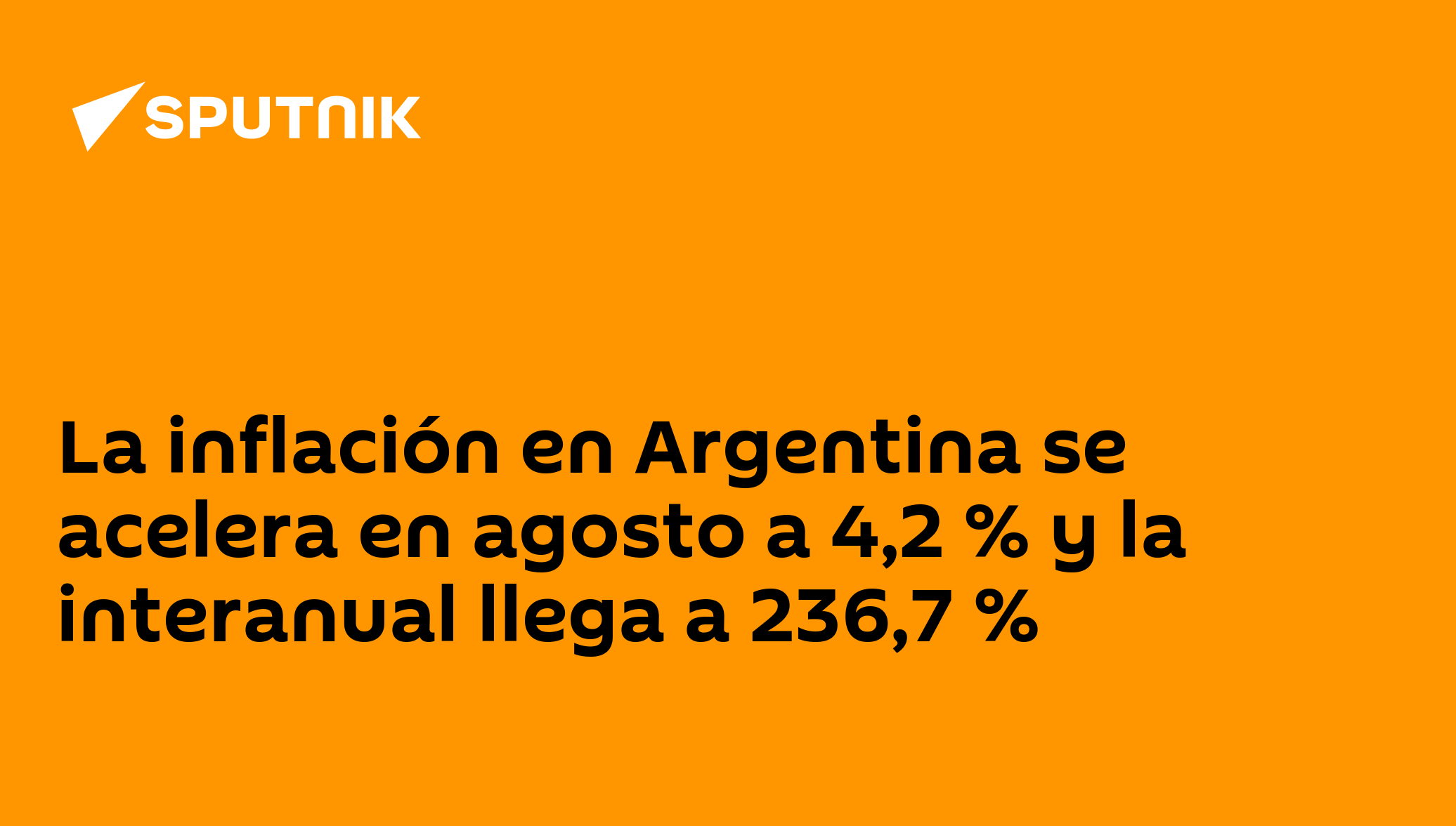 BUENOS AIRES (Sputnik) — Argentina registró en agosto una inflación del 4,2% respecto a julio, un registro 0,2 puntos porcentuales mayor al del mes anterior, mientras que la inflación acumulada en el último año llegó al 236,7%, informó este miércoles el Instituto Nacional de Estadísticas y Censos (Indec).