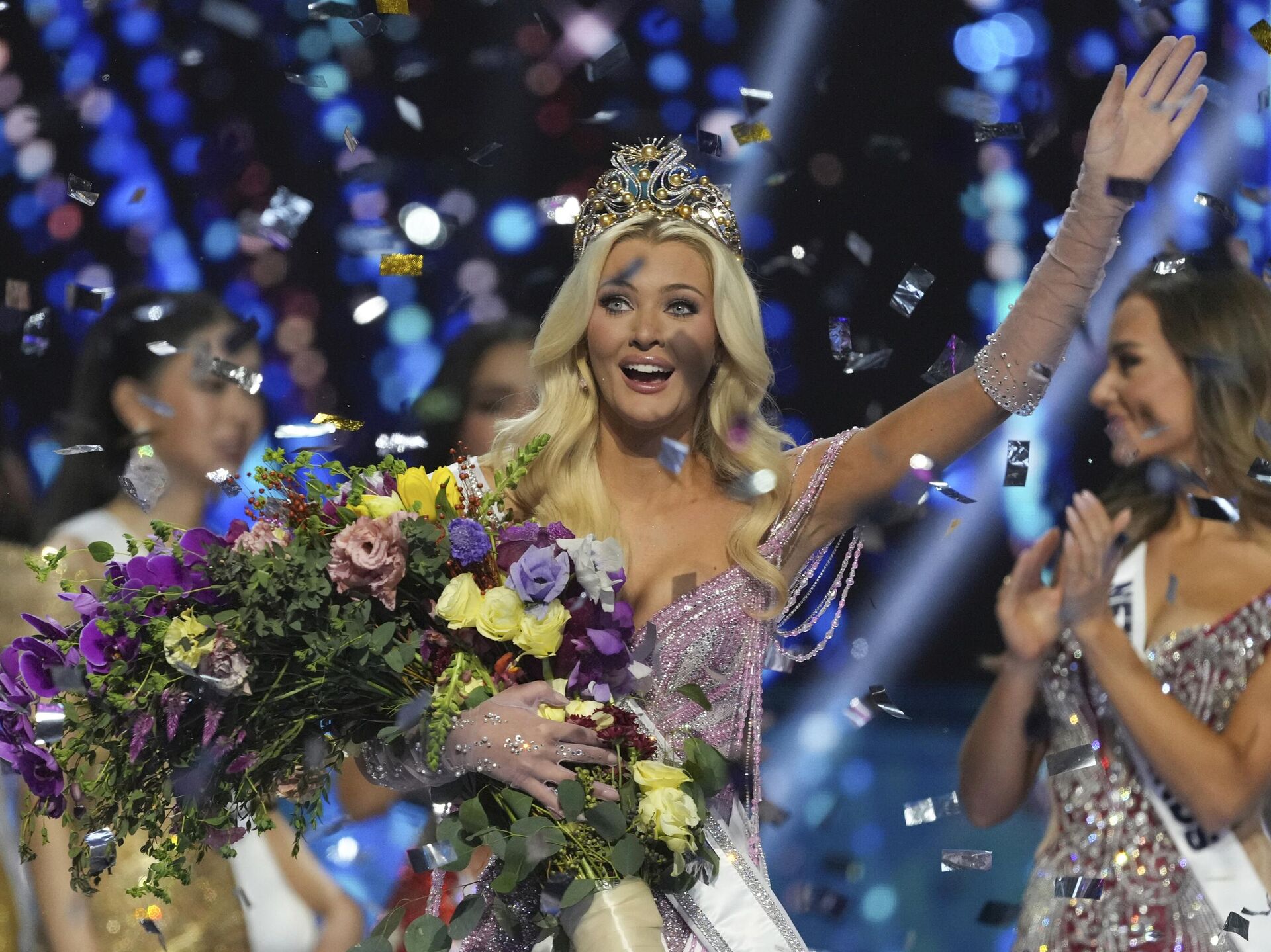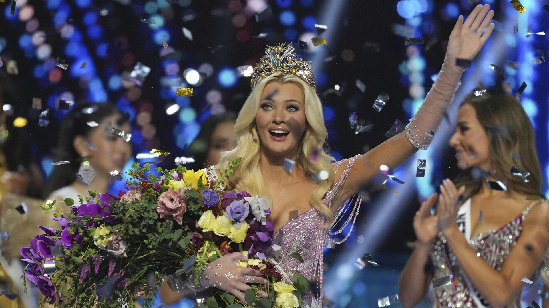 Miss Nigeria, Chidimma Adetshina, y Miss Dinamarca, Victoria Kjaer Theilvig, esperan el anuncio de la ganadora de la 73.ª edición del certamen de belleza Miss Universo.