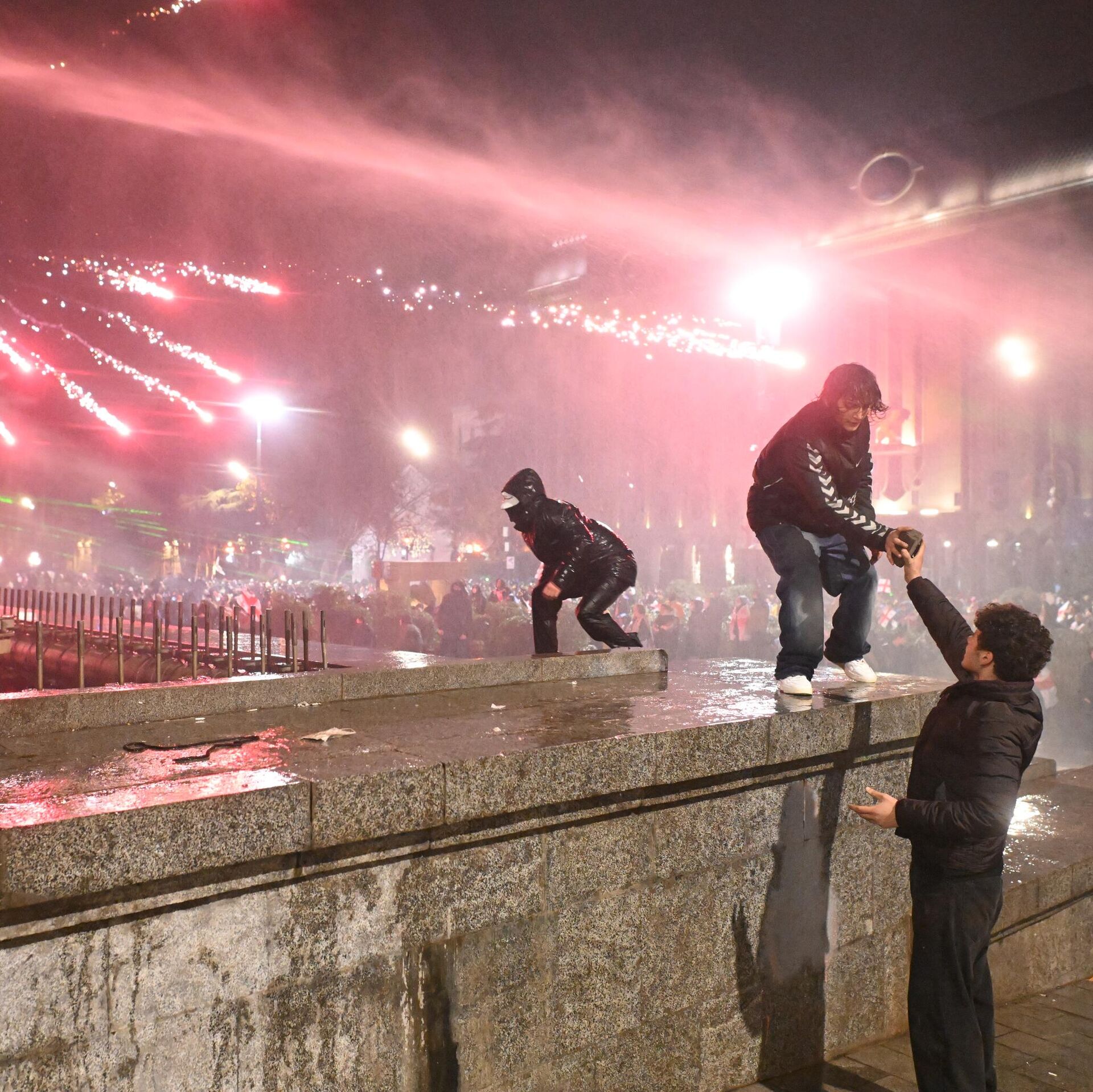 Los manifestantes, a los que se unió en un momento la presidenta de Georgia, Salomé Zurabishvili, arrojan objetos contundentes y artefactos pirotécnicos a las fuerzas del orden que, a su vez, tratan de dispersar la multitud con cañones de agua y gases lacrimógenos.