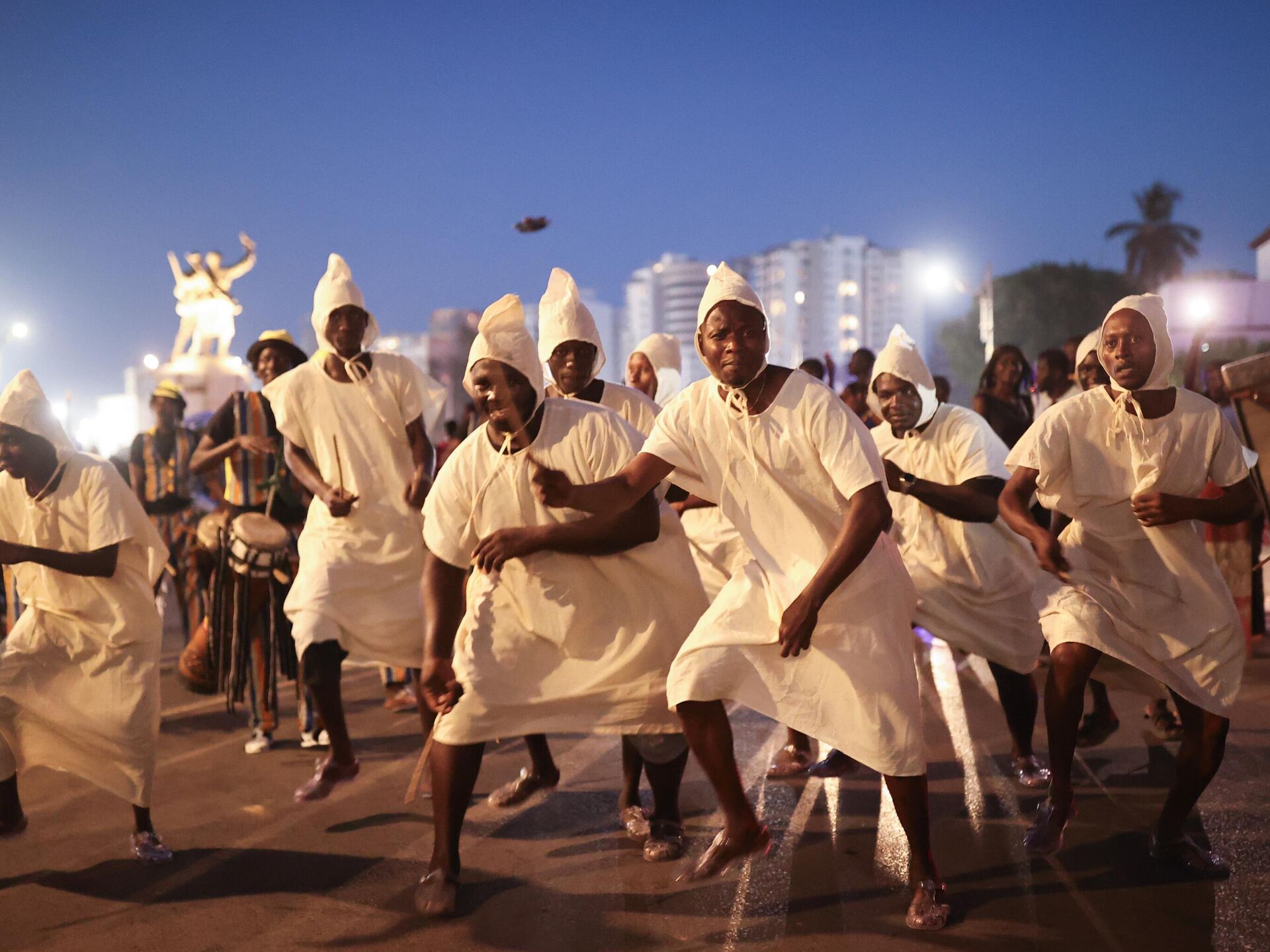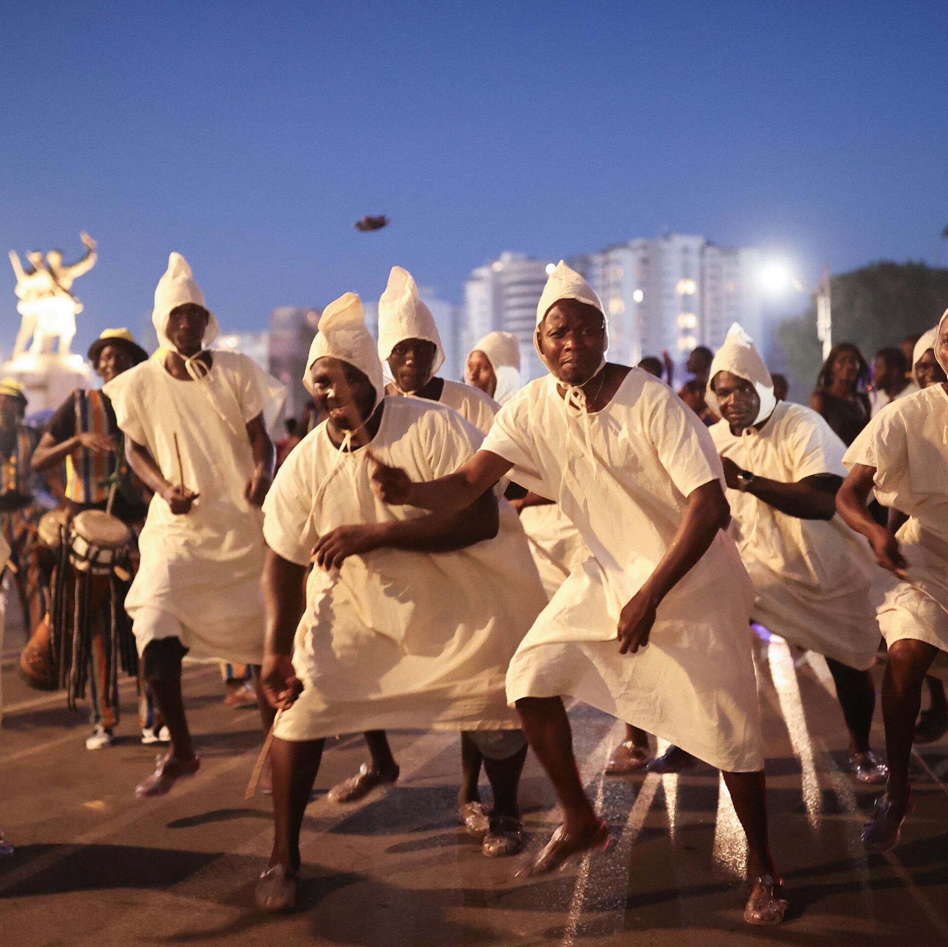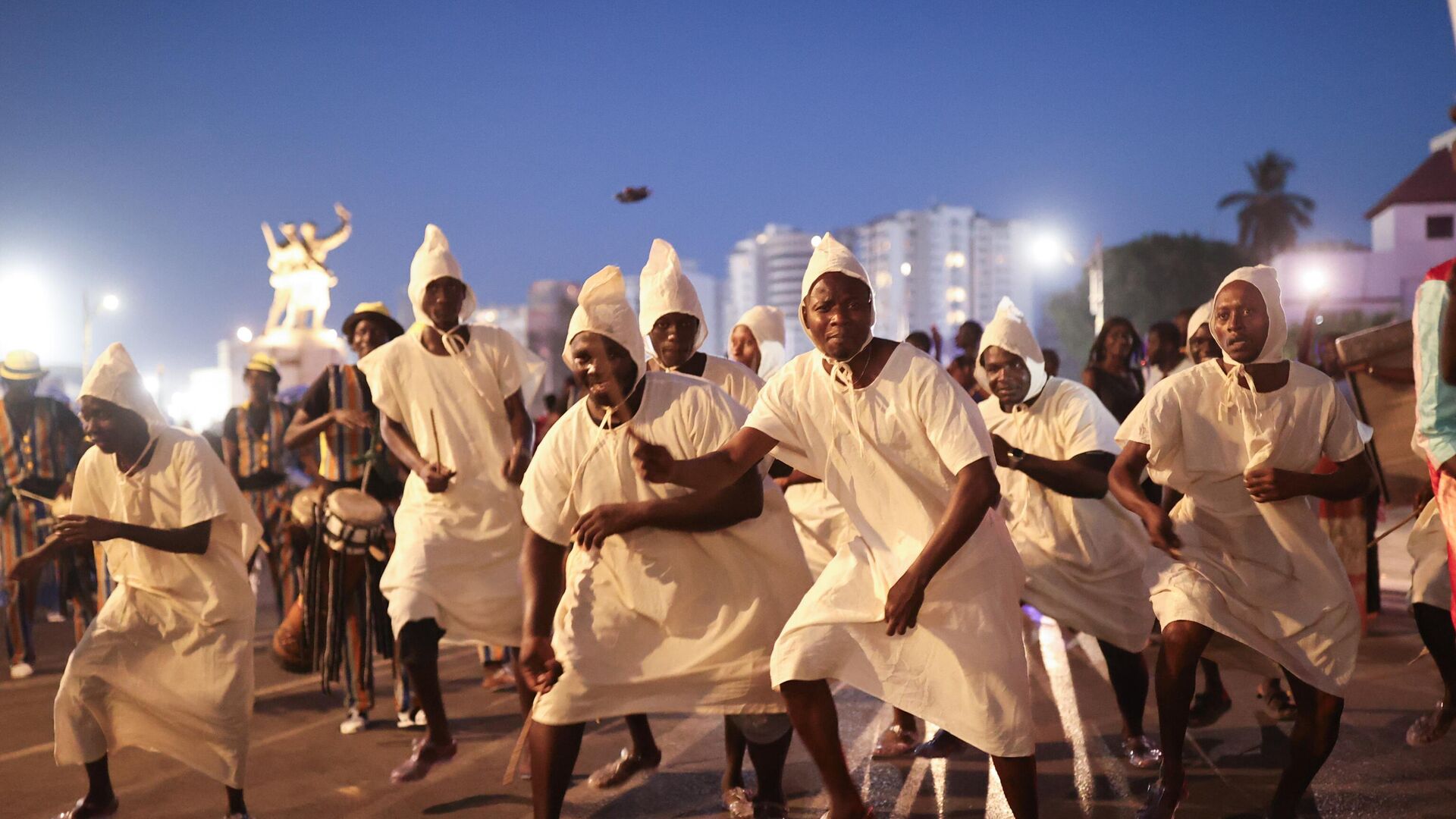 Miembros de diferentes grupos étnicos y bailarines vestidos con trajes locales caminan hacia el Gran Teatro durante el Carnaval de Dakar en la Plaza de la Independencia de Dakar, Senegal.