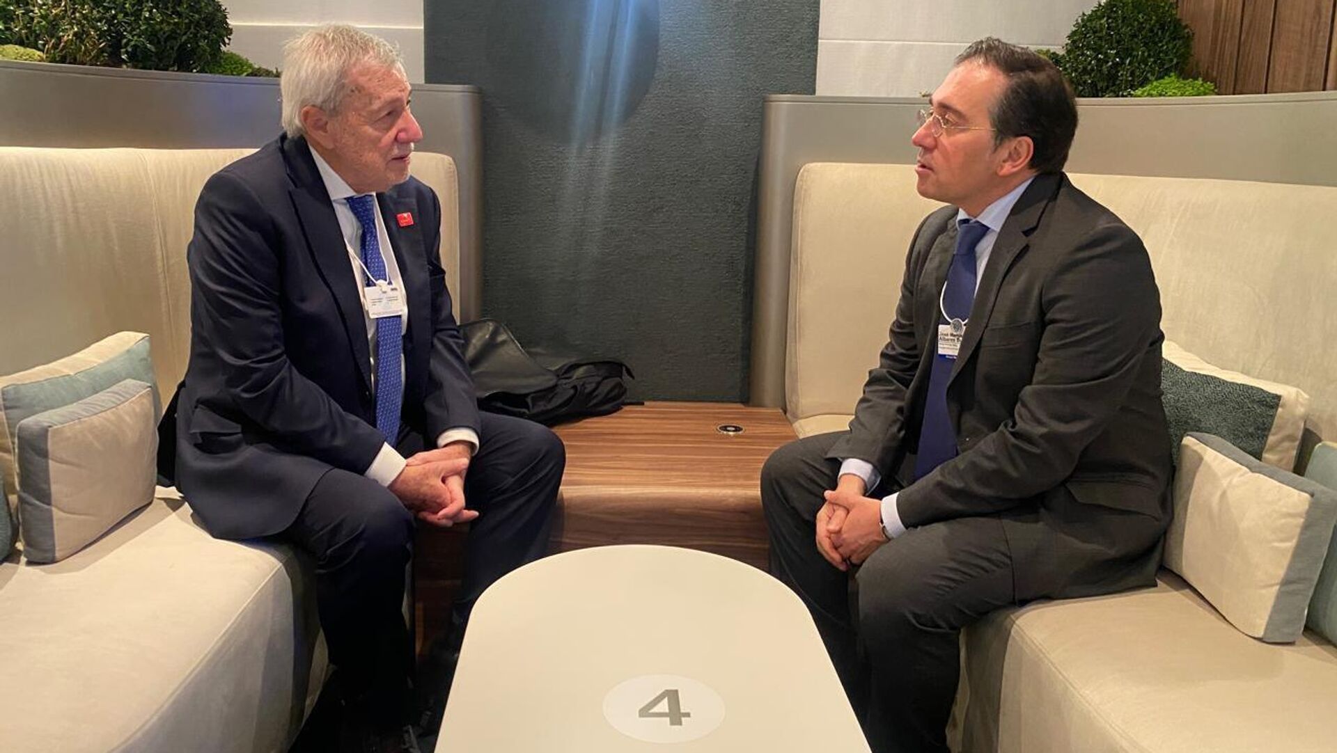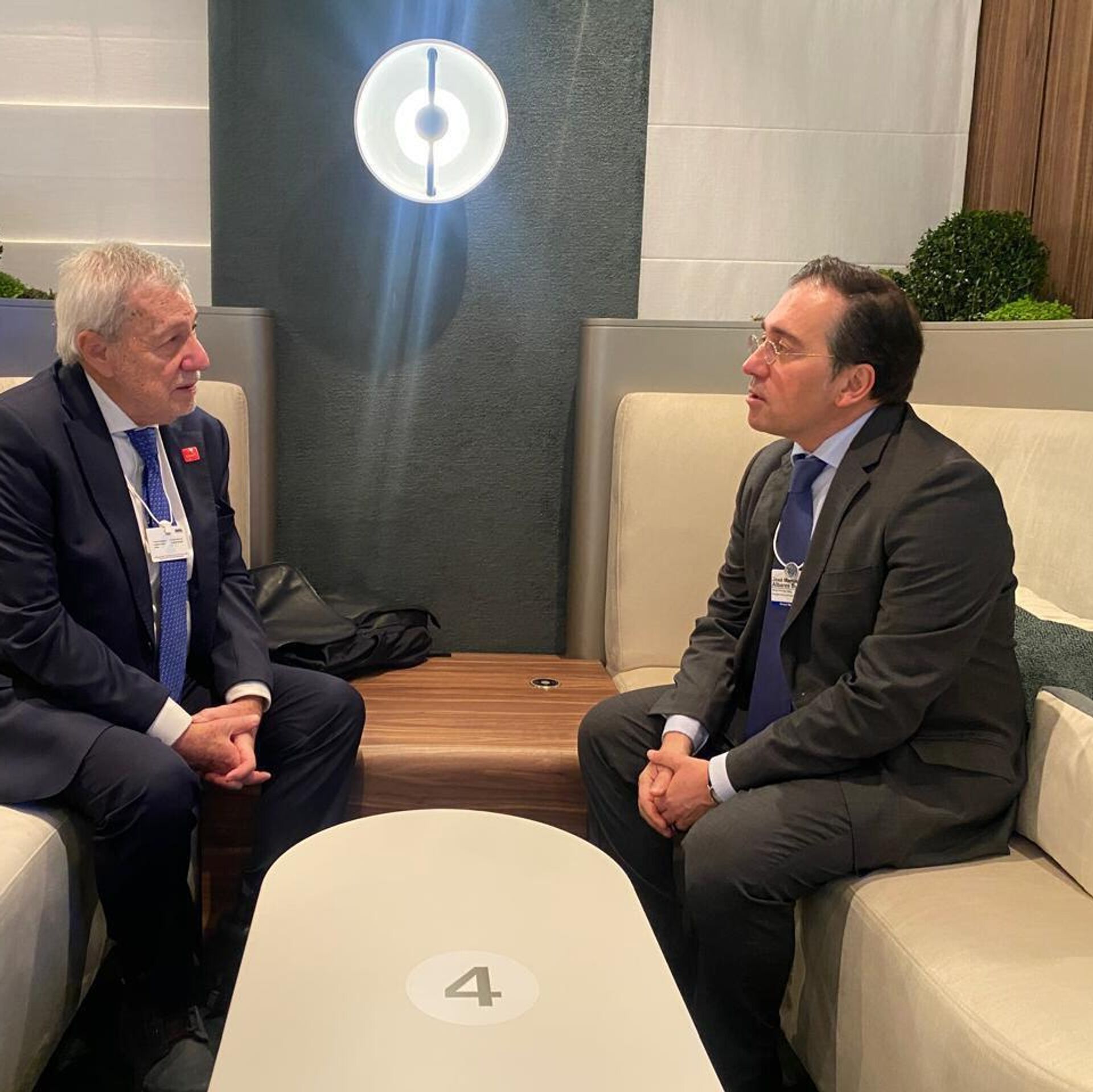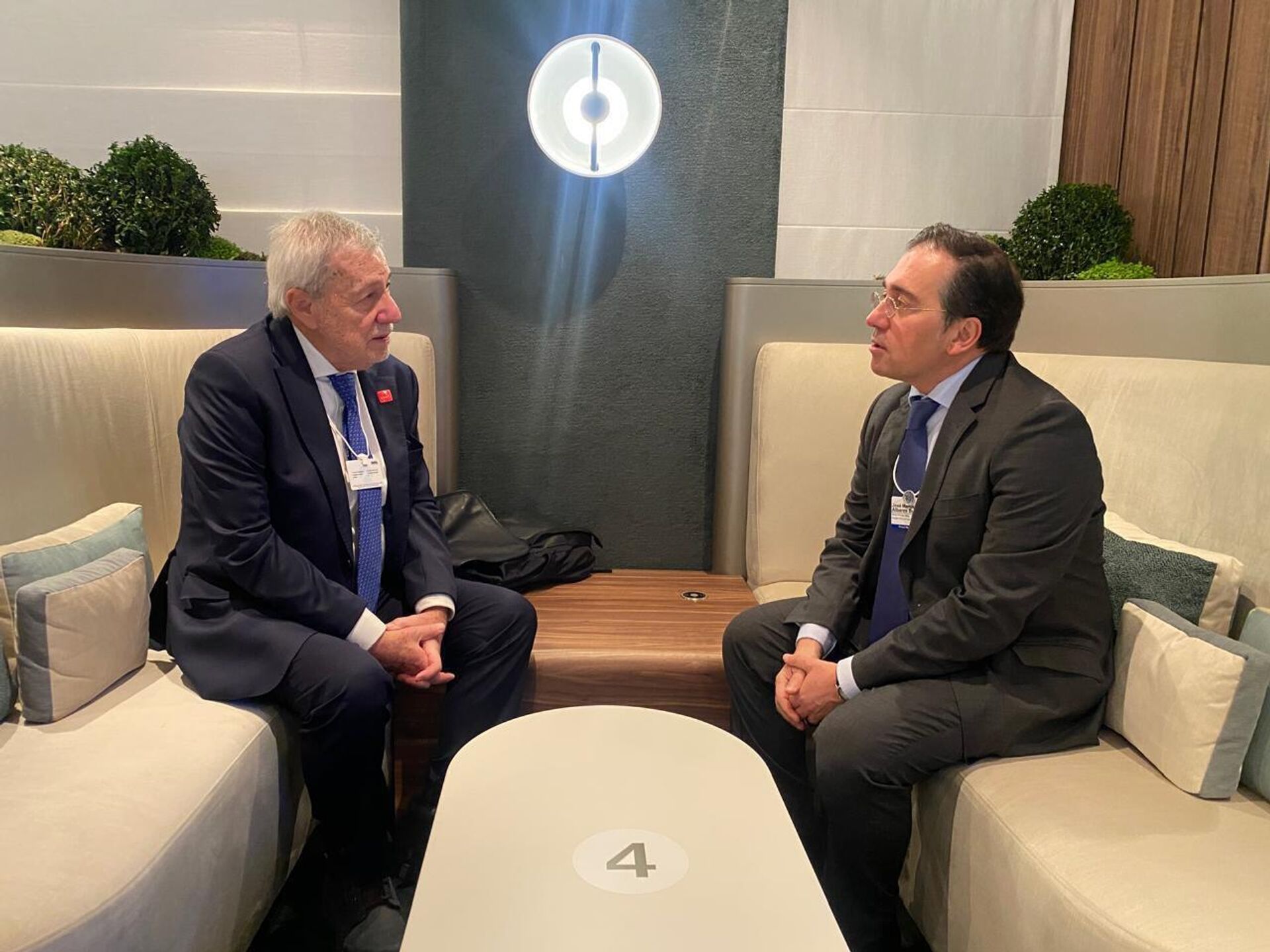 "Reunión con mi homólogo de Chile, Alberto van Klaveren, en márgenes del FEM [Foro Económico Mundial]. Hemos hablado de nuestras excelentes relaciones bilaterales", escribió José Manuel Albares en su página en la red social X.