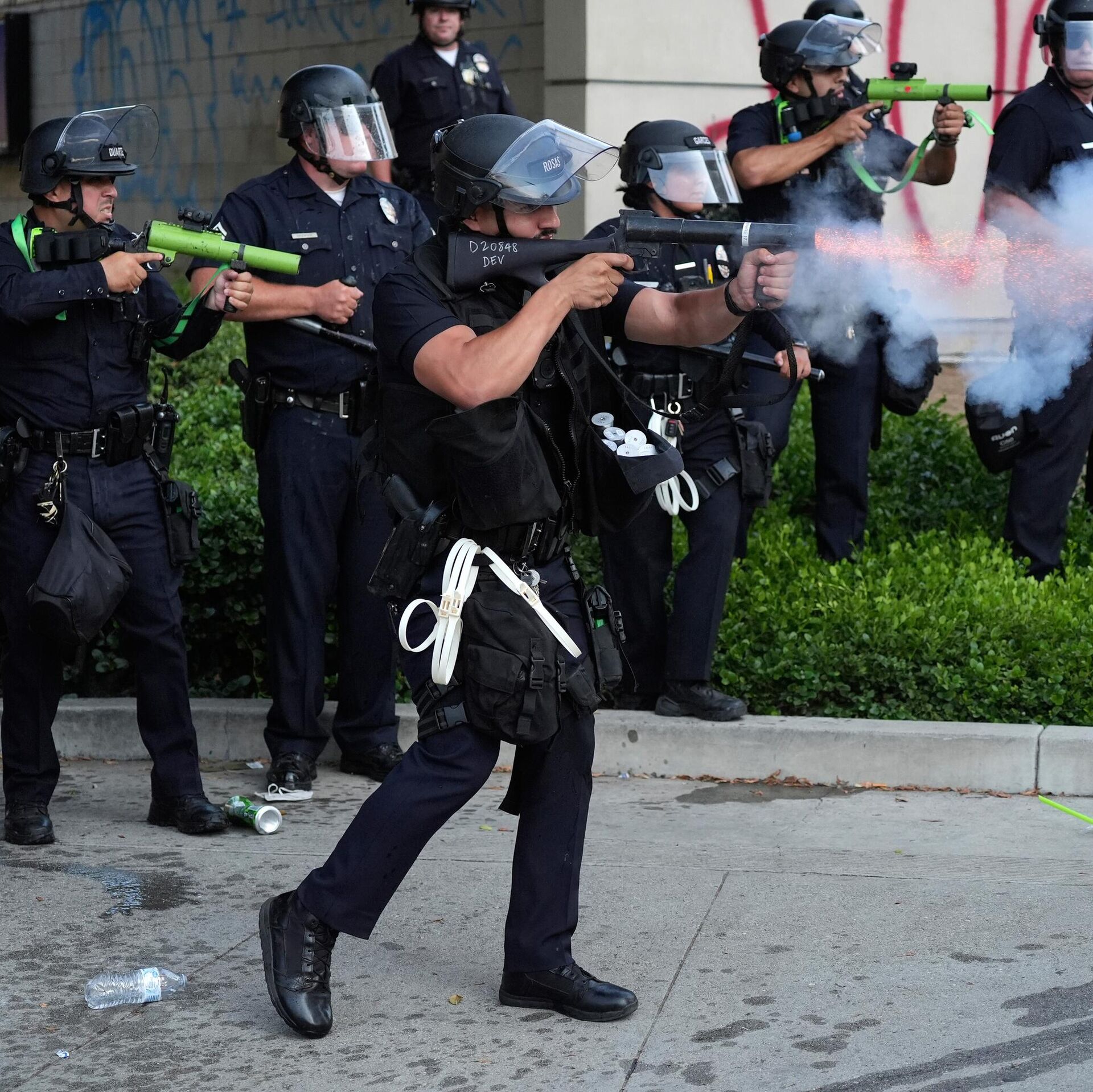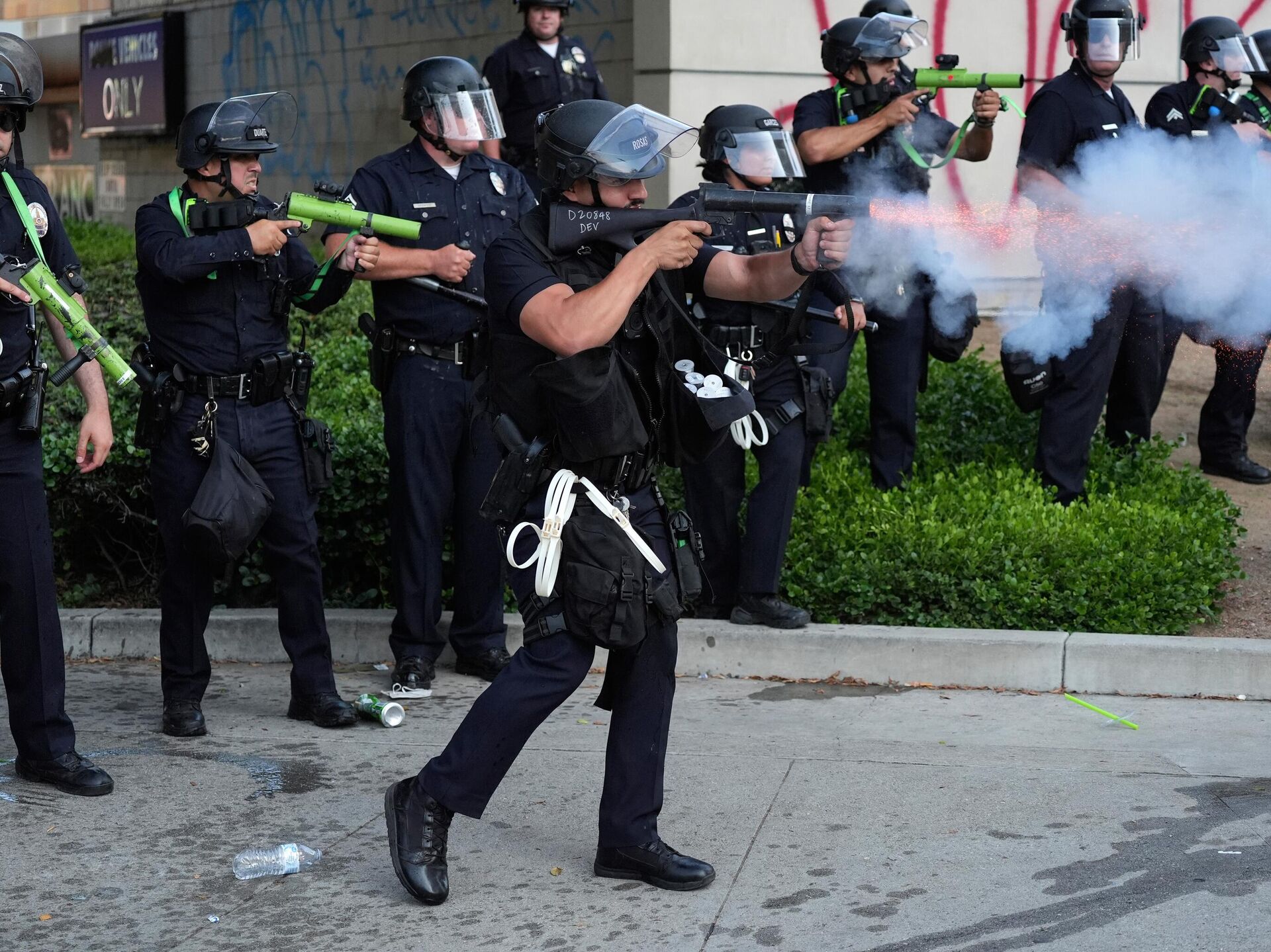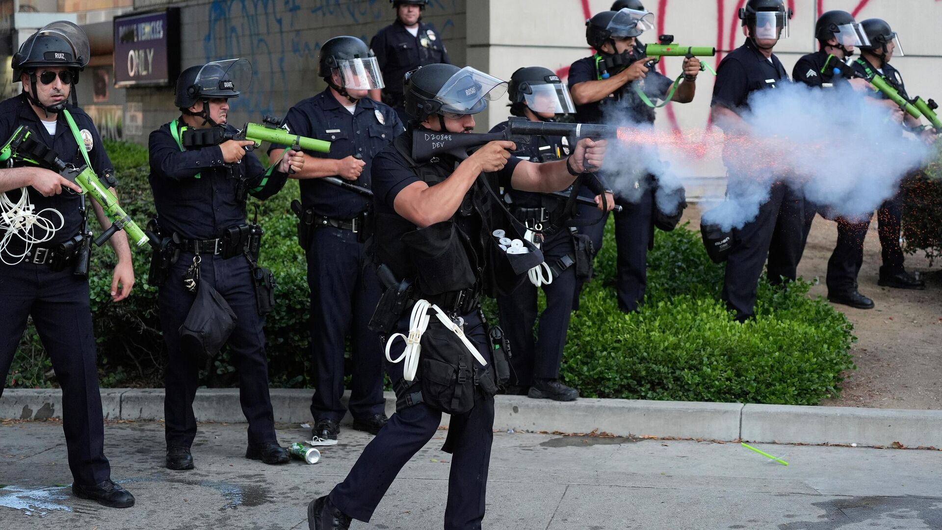 Este tipo de munición no debe dispararse directamente contra individuos, indicó el Departamento de Policía de Los Ángeles. Sin embargo, en uno de los videos más virales de las protestas en California, se observa a un policía disparar una granada de goma en contra de una reportera australiana.