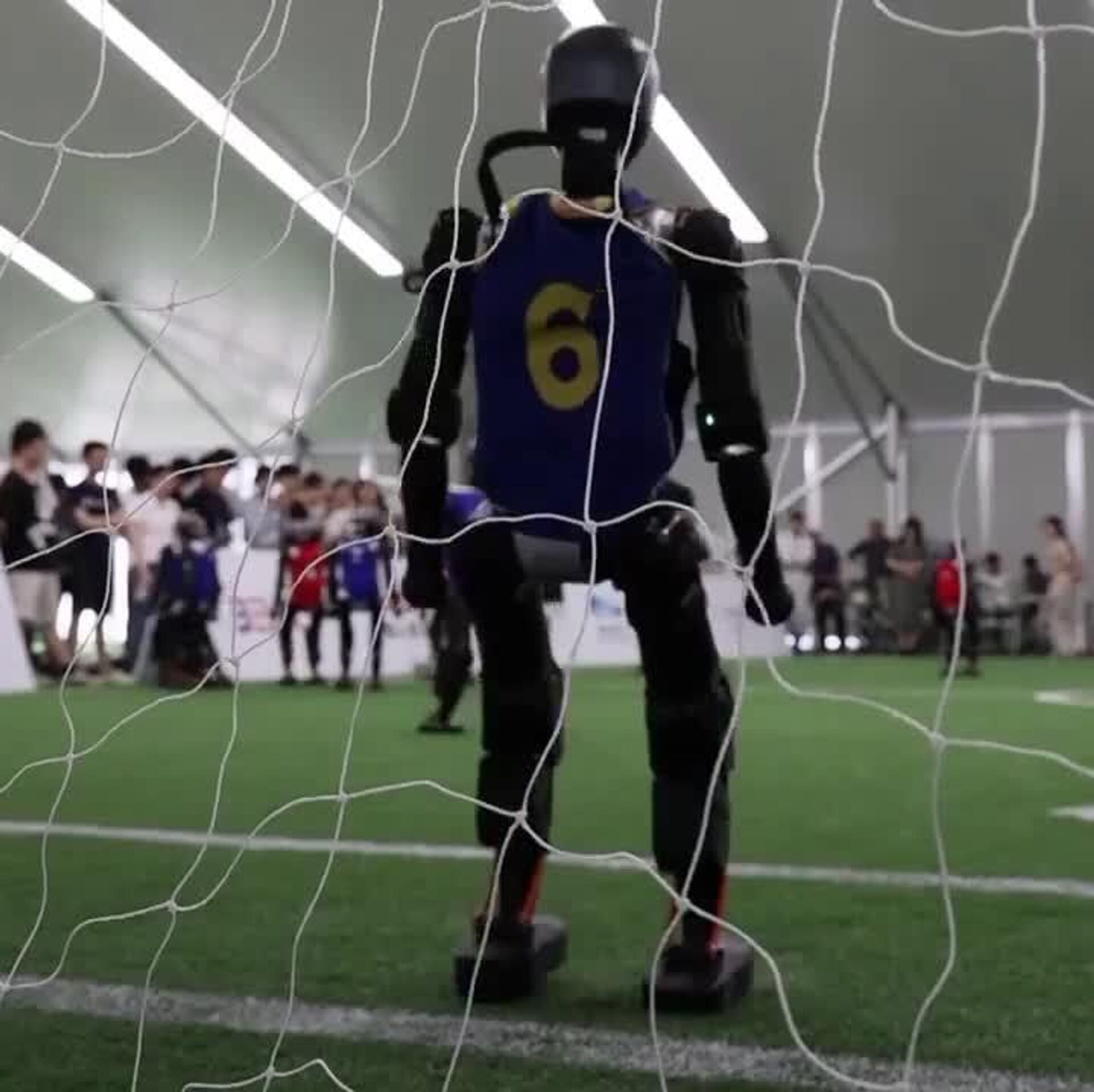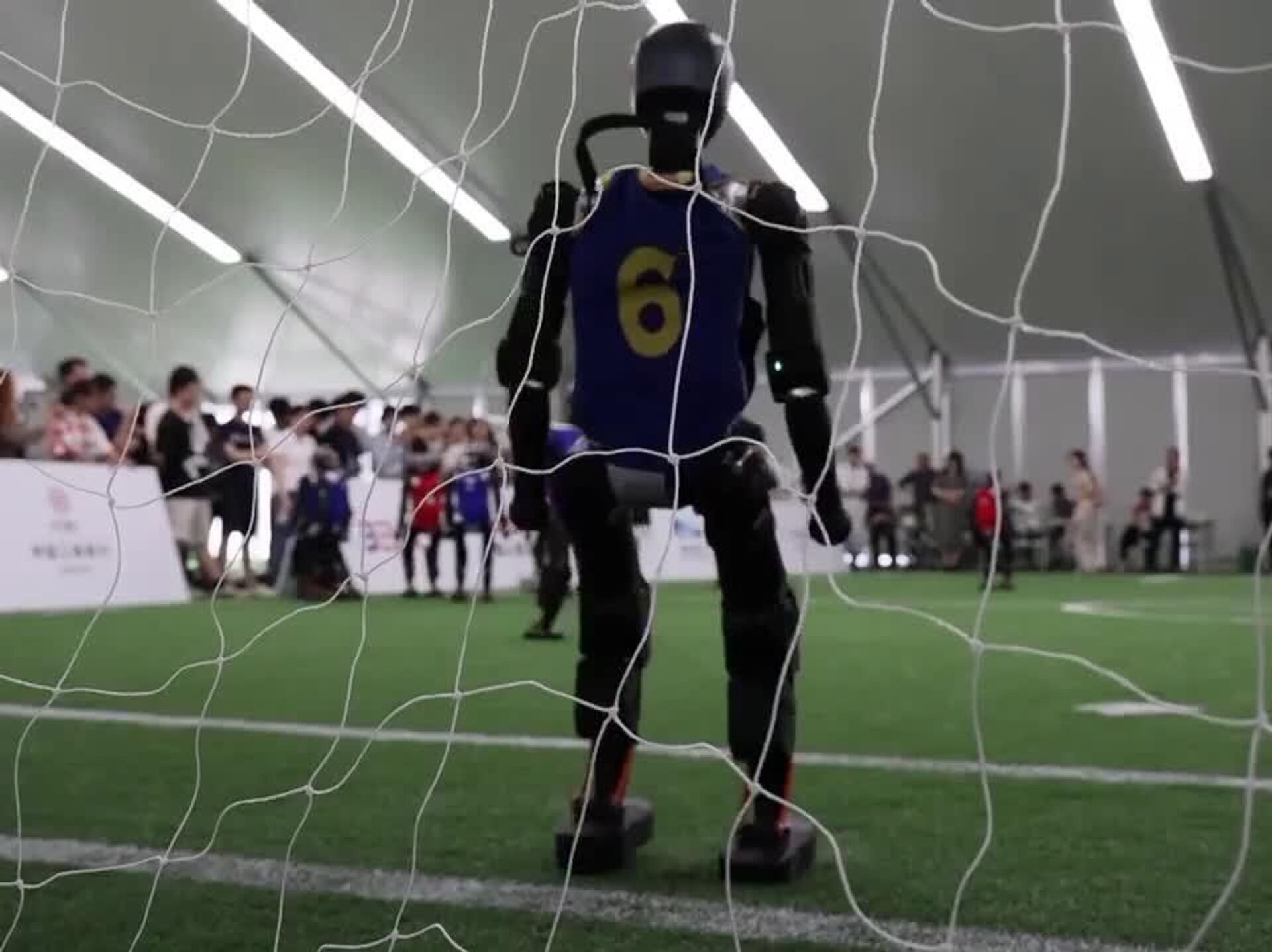 Las imágenes muestran a ingenieros y programadores calibrando los robots antes de un partido de entrenamiento, en el cual las máquinas equipadas con inteligencia artificial y sensores visuales siguen hábilmente el balón, se desplazan por el campo e incluso se recuperan de las caídas.
