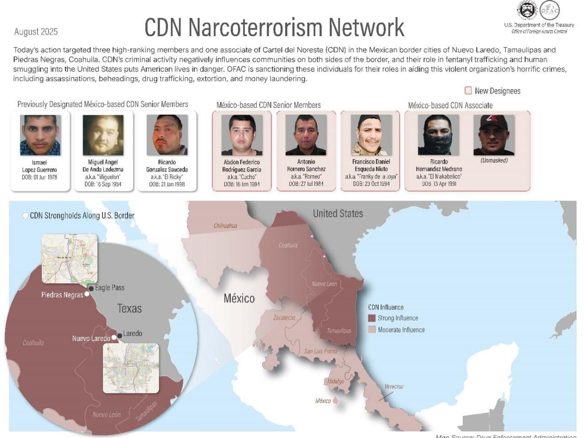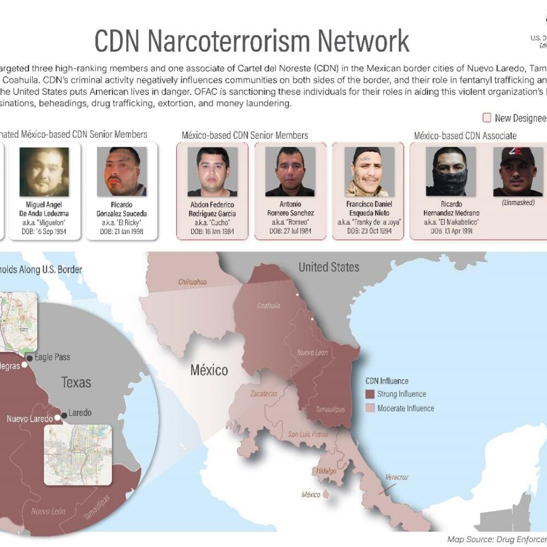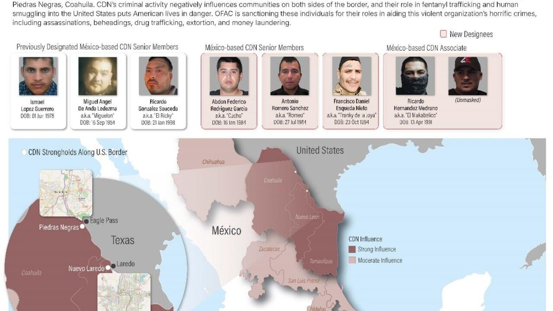 El resto de los individuos son Abdón Rodríguez, Antonio Romero y Francisco Esqueda, quienes supuestamente "desempeñan un papel clave en la colaboración con el CDN, en sus atroces crímenes, incluyendo asesinatos, decapitaciones, narcotráfico, extorsión y lavado de dinero", puntualizó la dependencia.