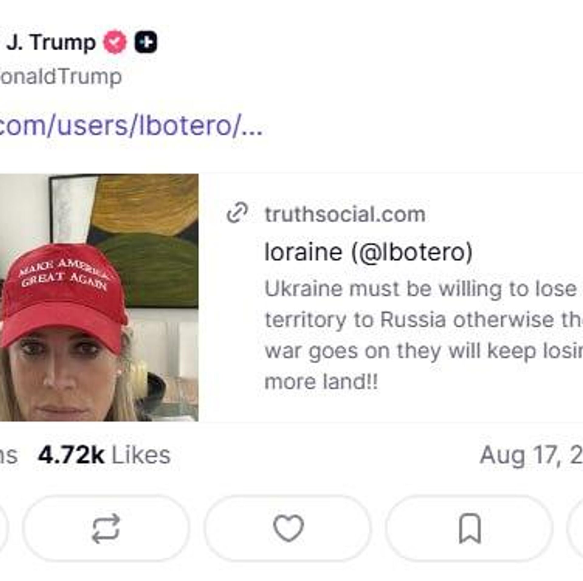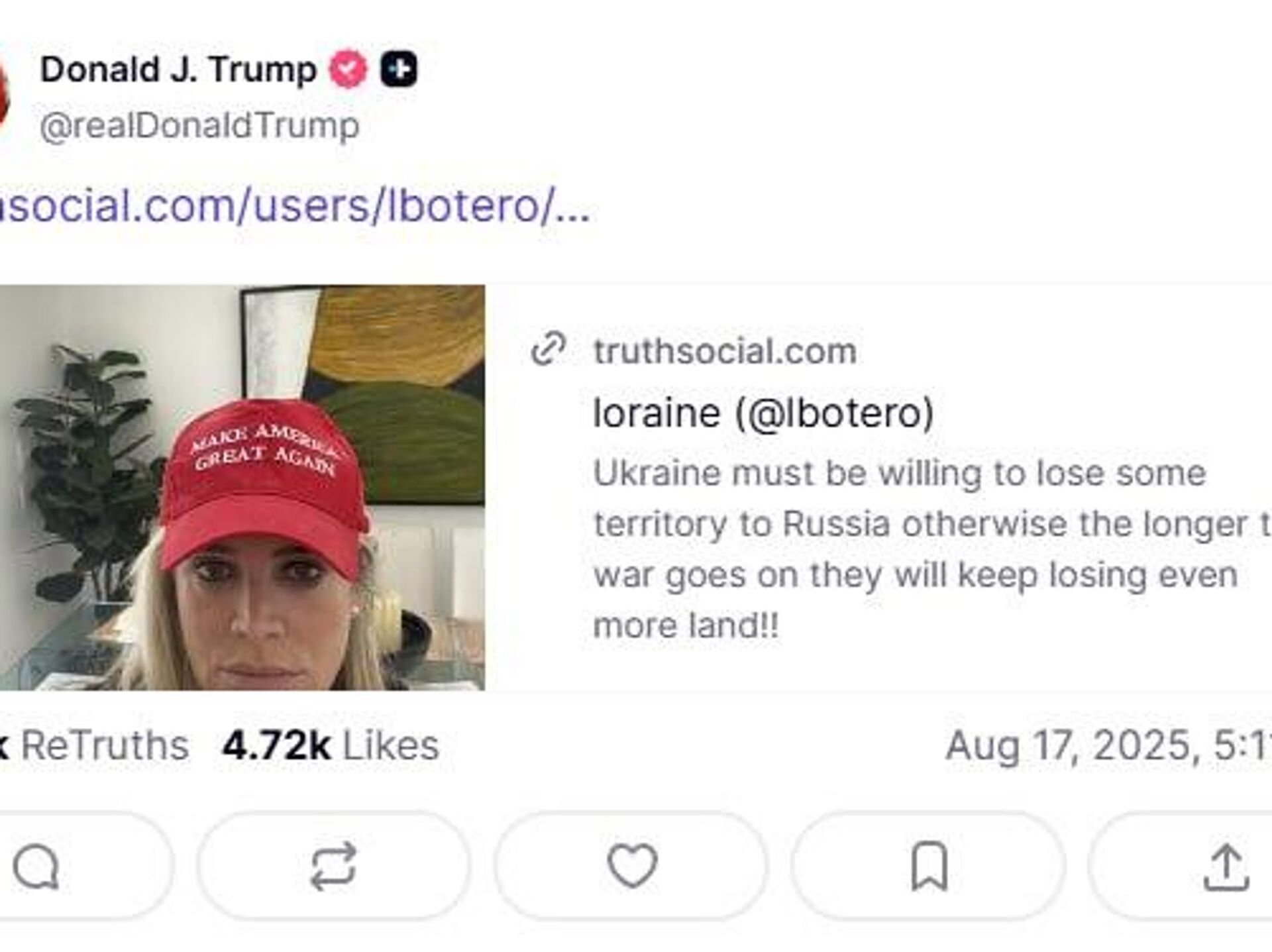 "Ucrania debe estar dispuesta a ceder parte de su territorio a Rusia, de lo contrario, cuanto más se prolongue la guerra, más territorio seguirá perdiendo", dice la publicación reposteada por el mandatario en su cuenta de Truth Social.