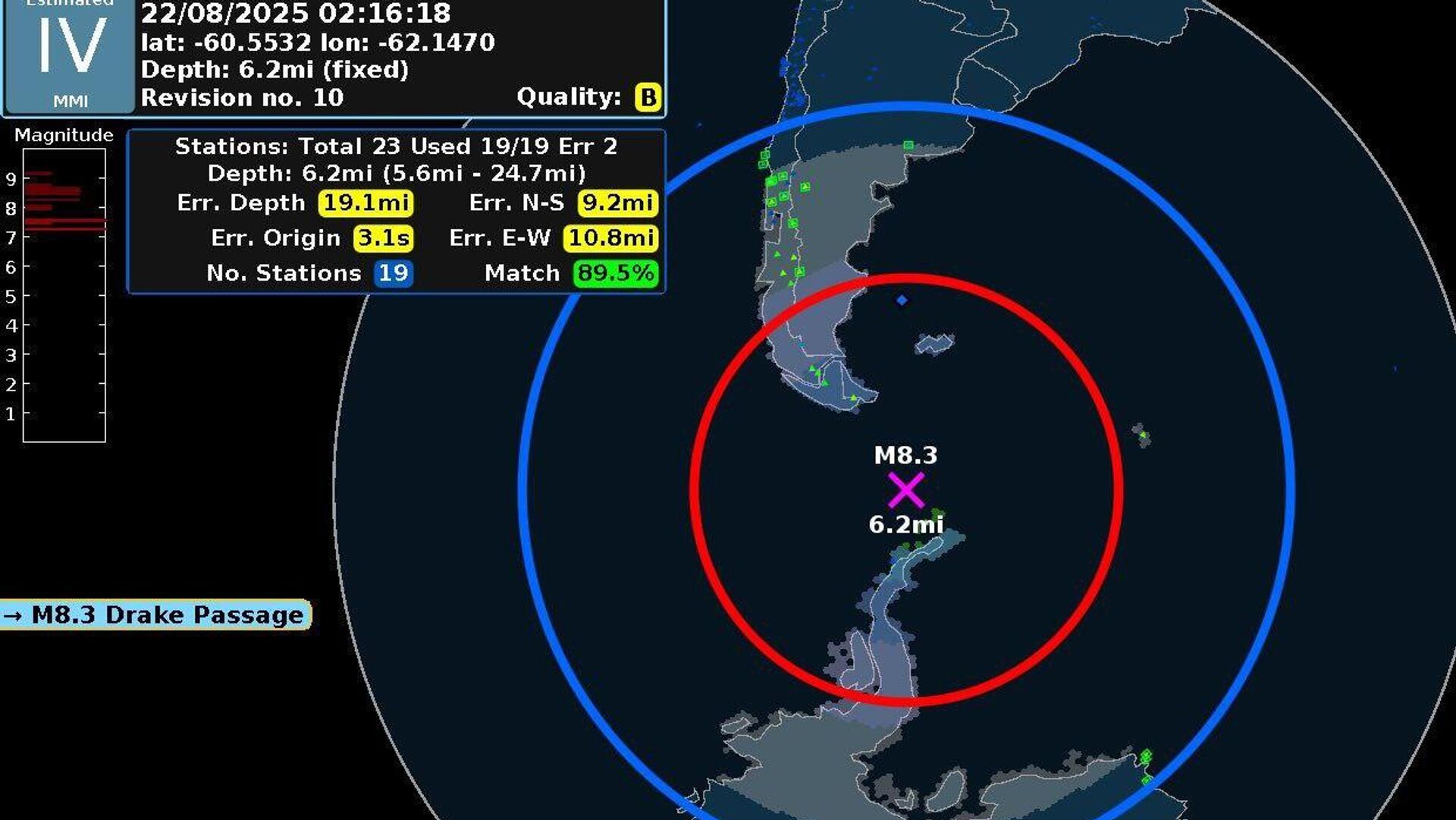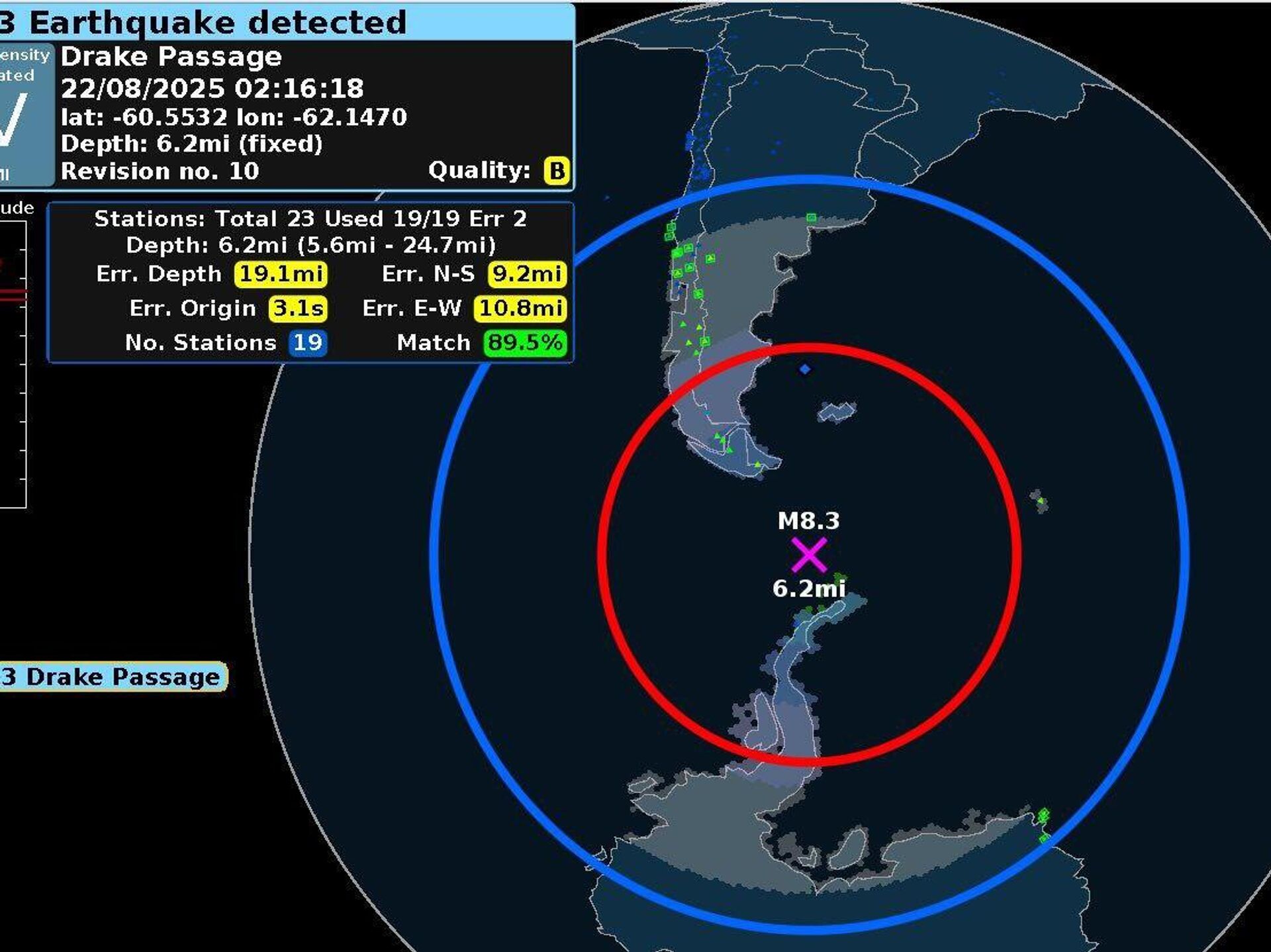 El Servicio Geológico de Estados Unidos informó sobre el movimiento telúrico, ocurrido a más de 700 kilómetros de Tierra del Fuego, Argentina.