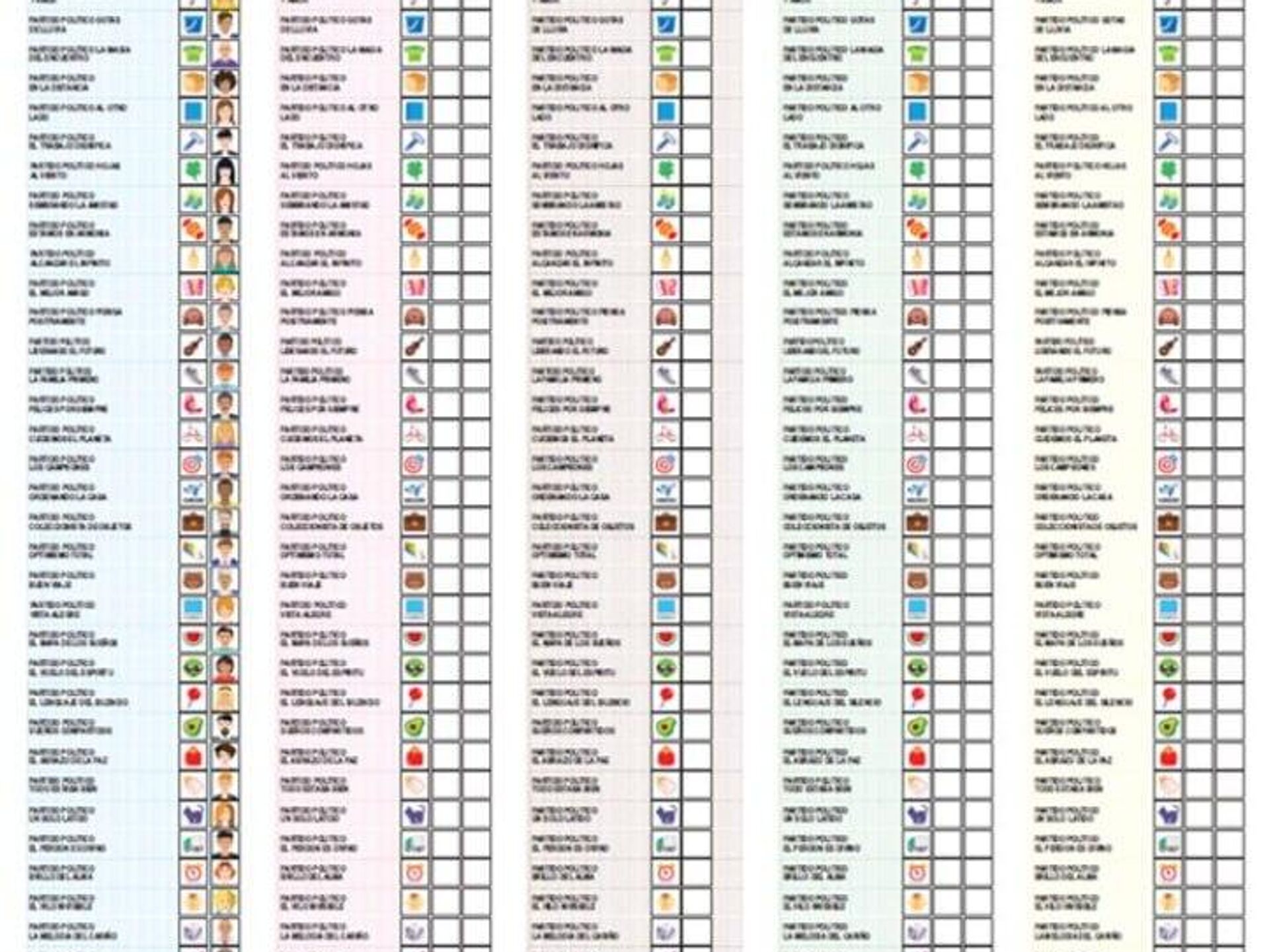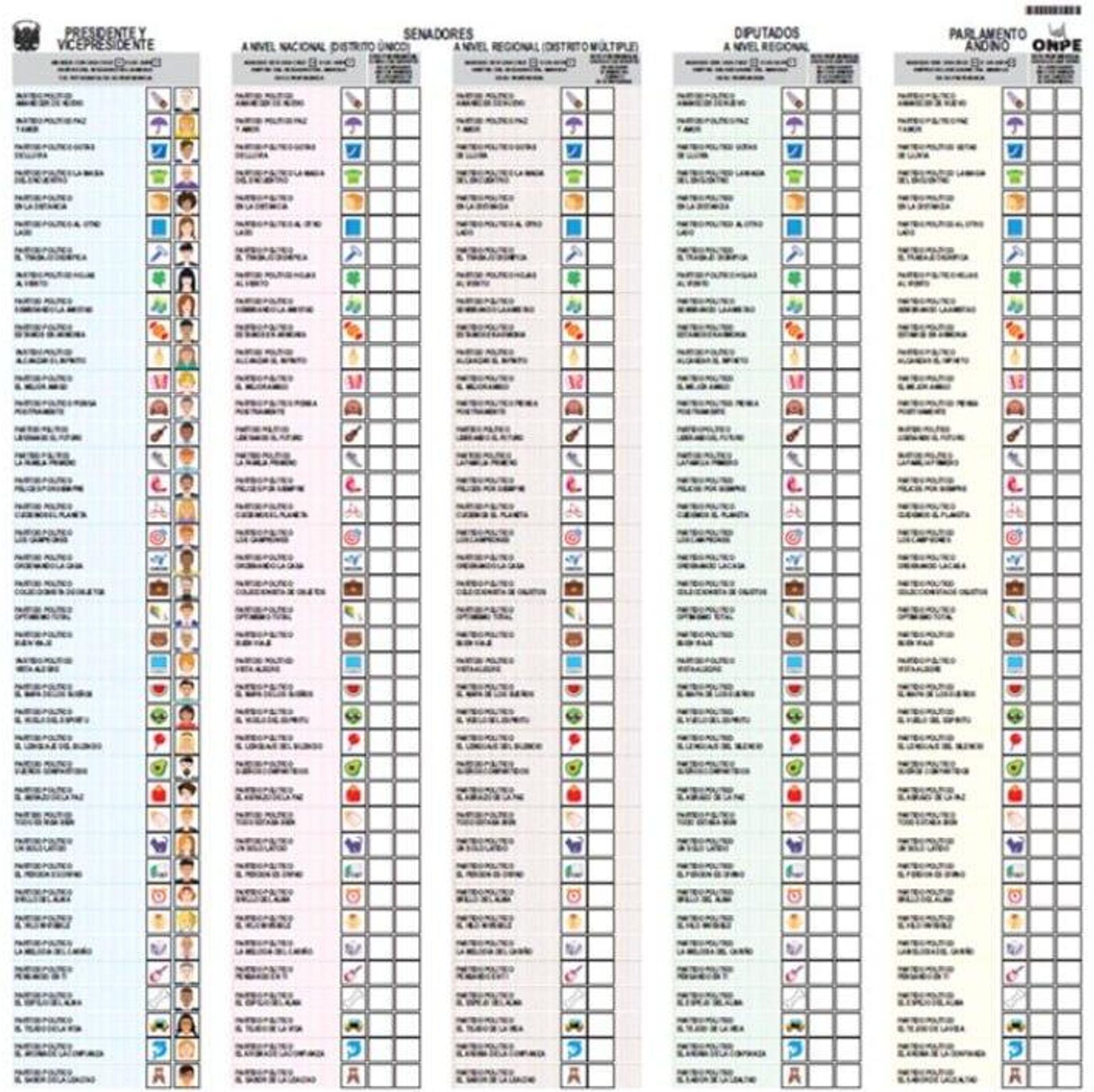 De acuerdo con el funcionario, la cartilla medirá 42 centímetros de ancho por 44 de alto y en ella se podrá votar por cinco cargos: presidente y vicepresidente, senadores nacionales y regionales, así como por representantes del Parlamento Andino.